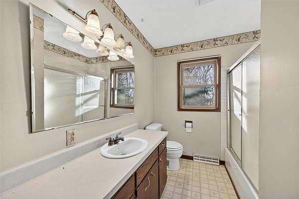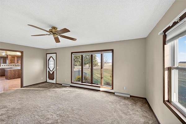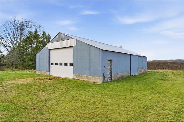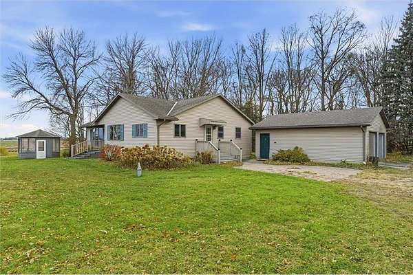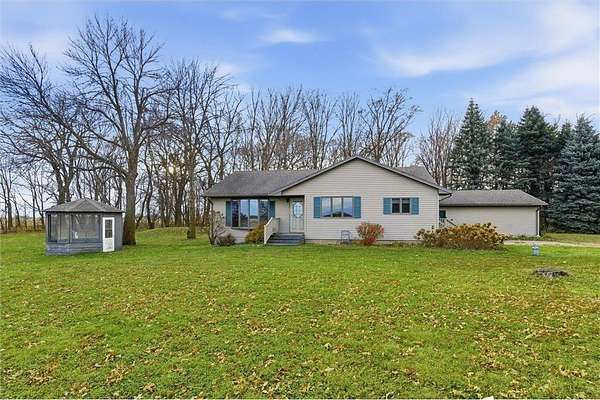 Set on 5.15 acres, this 3-bedroom, 2-bath rambler offers an opportunity to enjoy a spacious rural setting with room to make it your own. Sunlight floods the main-level living areas through the large picture window. The main level features three bedrooms, a full bath, an additional half bath, and a functional layout that includes a kitchen, dining area, and living room. The primary bedroom includes two closets for added storage. Enjoy a finished lower level ready for family time, recreation, or your personal touches. Outside, multiple outbuildings, including a 2 stall garage, 40x60 pole shed with electricity, a grain bin, lean-to, and shed. Offering versatility for hobbies, storage, or equipment. Relax on the patio or in the screened gazebo and take in the serene surroundings. This property combines rural charm, functional space, and opportunity to add value with updates. The home site and 5 acres were recently split from a larger parcel, with the surrounding land being sold separately for agricultural use.