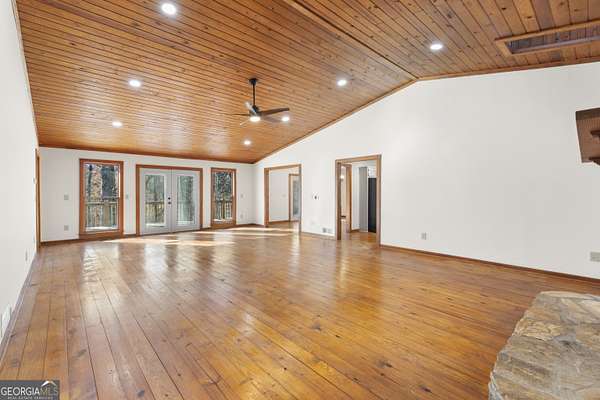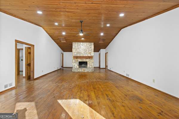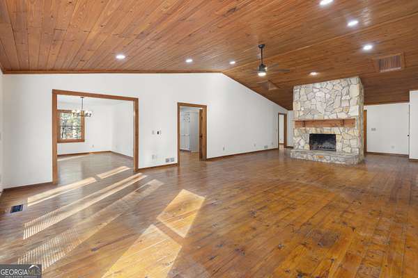 7.4 Acre property with NO HOA! UPDATES/IMPROVEMENTS MADE...and STILL PRICED TO SELL with immediate EQUITY! This fantastic RANCH sits on 7.4 acres with a small creek along the left side and a full basement. The custom built home has only had 1 owner! The Architectural ROOF WAS REPLACED OCT. 2024 with transferrable warranty! 2 new HVAC systems to be installed, or credit given if closing takes place before! The layout is perfect with 3 separated bedrooms and 3 1/2 baths on the main level, and an additional bedroom and bath on the terrace level. Situated on 7.4 private acres, this beautiful ranch home greets you with hard-to-find pine flooring that extends throughout, a beautiful stone, walk-around fireplace that anchors the enormous family room with wood vaulted ceiling, and a warmth that will quickly let you know that this is the one. The artistic side of you will appreciate the design and see how this is truly a masterpiece in the making! The large 3 bedrooms are separated at opposite corners, offering a sense of privacy that few other homes do. Windows and doors extend completely across the back, as does the huge deck which overlooks the peaceful wooded acreage. If you like to entertain, you know what a treasure this is. And the oversized dining room, that also opens up to the deck will only make it easier! But don't stop there! Below is a full basement that is partially finished with a fireplace, large living area and another bedroom with full private bath. There is certainly more space that could be finished if you choose. You'll love the full length lower deck too! The lot is gently sloped with a creek that runs along the left side. Take time to walk the trail so you can appreciate the potential! It levels out towards that back where the perfect garden area could be created if cleared out! Don't let this one get away! Being sold AS-IS (Except for 2 HVAC systems to be installed).