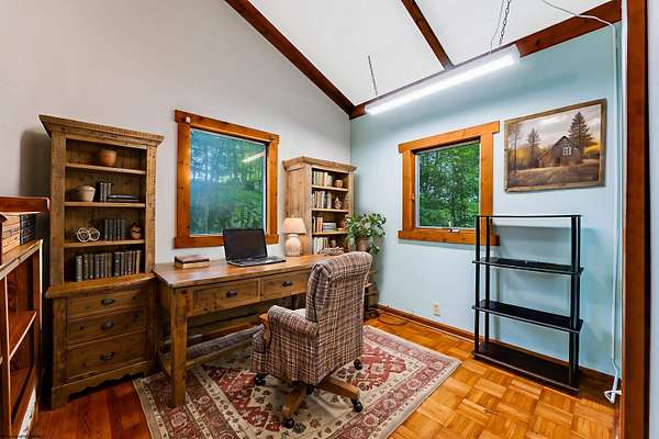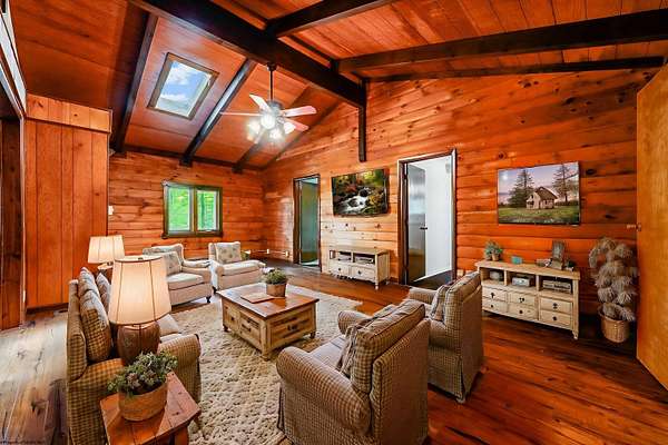 Happy Holidays at Paradise Lake -- A warm and inviting log-style retreat nestled among mature hardwoods and located just off the 8th hole at Paradise Lake Golf Course, this home offers a rare blend of privacy, character, and year-round comfort. Thoughtfully maintained and beautifully presented, the property showcases the charm of lake living paired with the convenience of both modern outdoor and indoor gathering spaces. The expansive wraparound deck provides multiple outdoor living zones perfect for relaxing, entertaining, or enjoying the natural wooded backdrop. Exterior lighting enhances the warm, lodge-like appeal of the home, especially in the evenings. Inside, the vaulted great room features exposed beams, skylights, and wood tones that bring a cozy cabin ambiance to the heart of the home. Key Features: o Private log-style home in a wooded setting off the 8th hole o Expansive wraparound deck with multiple seating areas o Vaulted great room with exposed beams and skylights o Beautiful wooded surroundings o Ideal for full-time living, vacation retreat, or 6-month+ rental potential Buyer to verify all information. Some photos are staged AI