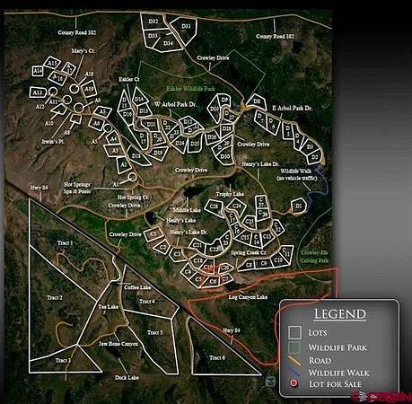 Gwen Dunn, Sherpa Real Estate, C: 660-251-1166, gwen@sherparealestate.com, www.crenmls.com: Welcome to this stunning 3-acre lot located in the renowned Crowley Ranch, just south of Pagosa Springs, Colorado. Enjoy exclusive access to private hot springs, available for all property owners and their guests. With over 1300 acres of open space, there's plenty to explore through horseback riding, hiking, cross-country skiing, and more outdoor adventures. This property boasts awe-inspiring views of the surrounding mountains, valleys, and lakes. Nearby waters attract a range of wildlife, including the majestic elk that call this area home. This peaceful retreat offers multiple potential building sites, along with ultimate privacy and tranquility. Come experience the beauty and serenity of Crowley Ranch! Lot is known as C-6 on the map and sits to the West of Log Canyon Lake. There is seasonal water to the south of the lot as well on the Open Space. (as featured in the pictures). Save thousands as water tap fees are already paid, and electricity is available on-site! C-6 sign is on the property. (Realtor signs are not permitted)