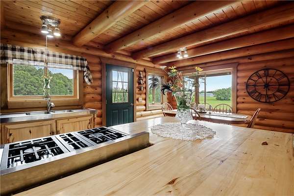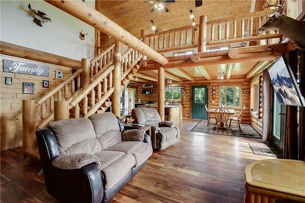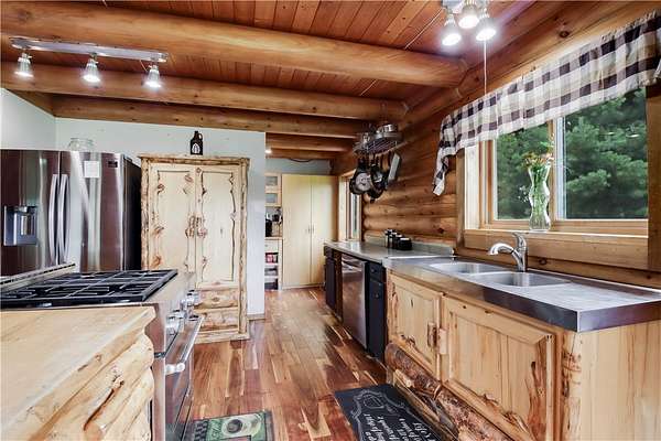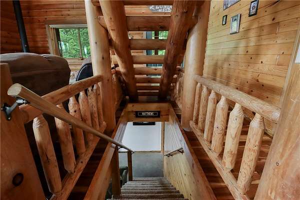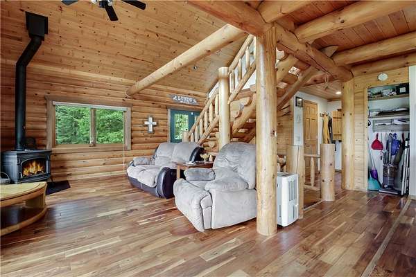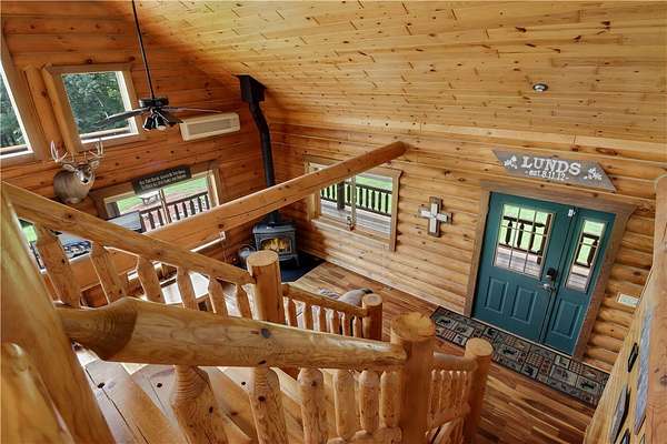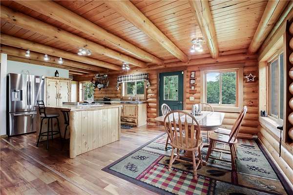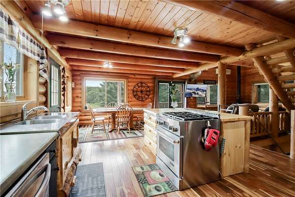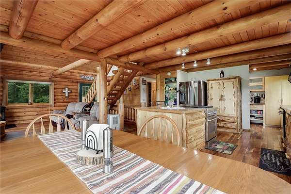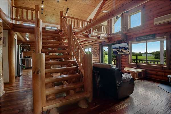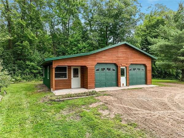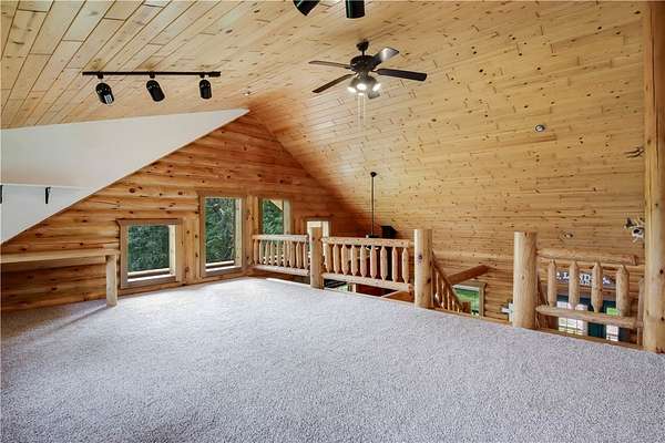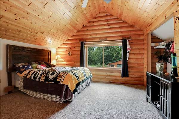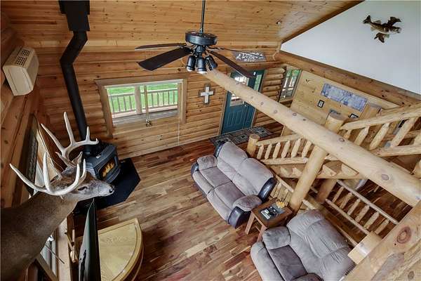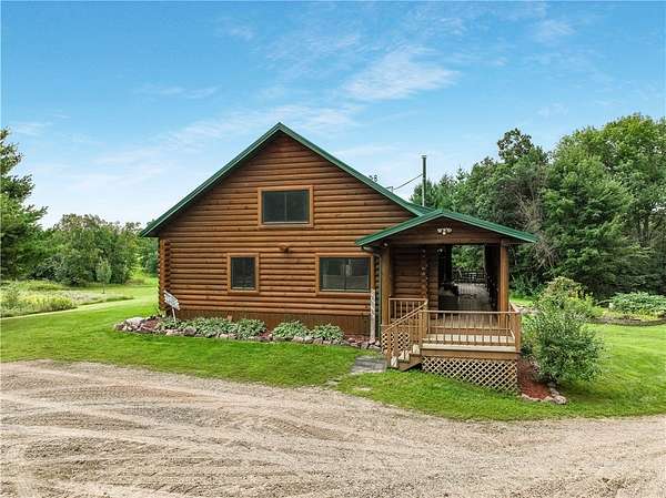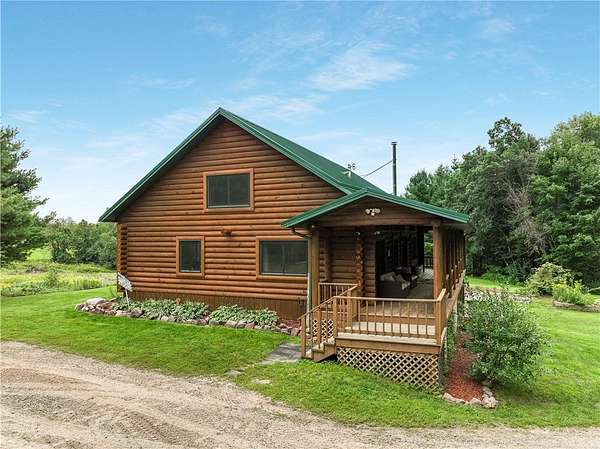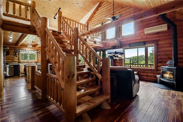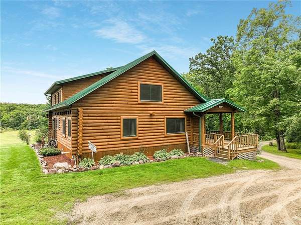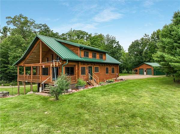 Imagine yourself at home in this chalet-style true log home, perfectly tucked off the road on 22+ wooded acres offering privacy and sweeping views of rolling hills and open fields. Enjoy the expansive covered wrap-around deck and large chalet windows that fill the vaulted living space with natural light. Inside, the open-concept main level features hardwood floors, a free-standing wood-burning stove, and a spacious kitchen with a huge walk-in pantry. The private owner's suite offers a large bath plus a convenient pass-through from laundry to closet. Upstairs loft adds flexible living space, while the walk-out lower level is ready for finishing touches to add even more room. Beautiful log finishes, live-edge steps & railings, and thoughtful design create a warm, inviting Northwoods feel throughout. The detached garage includes a 10x26 workshop or office, perfect for projects or working from home.