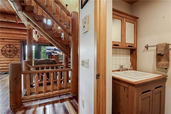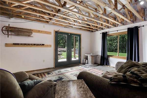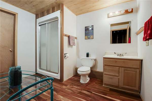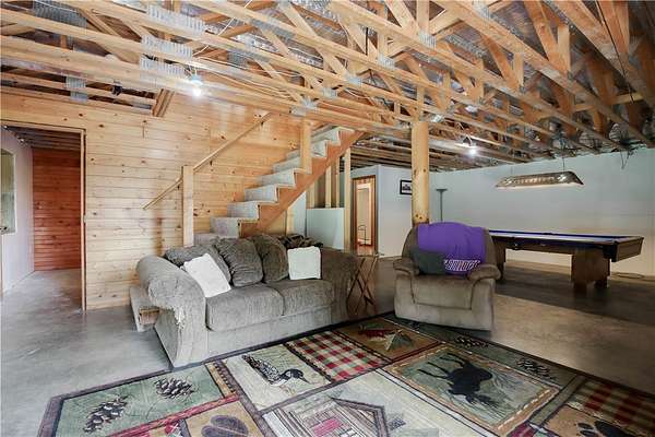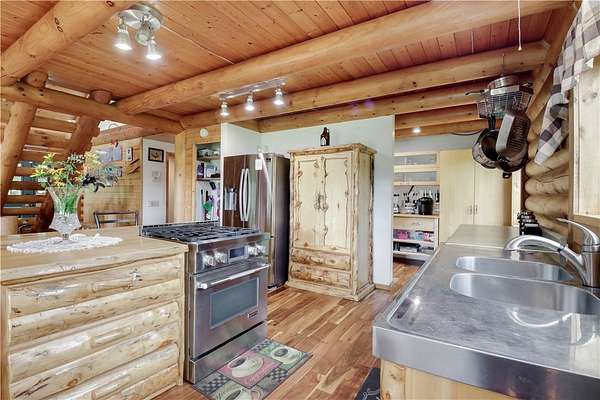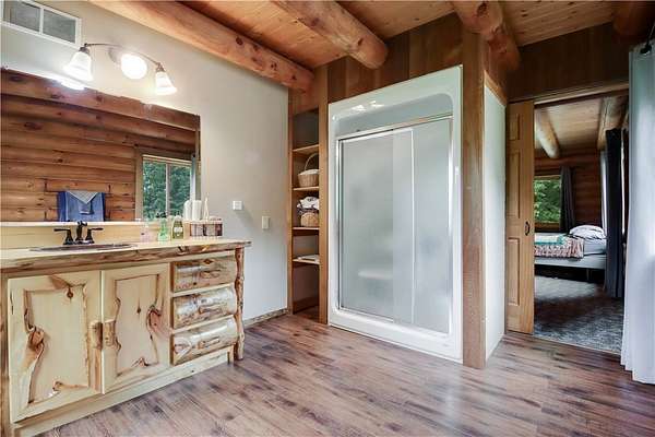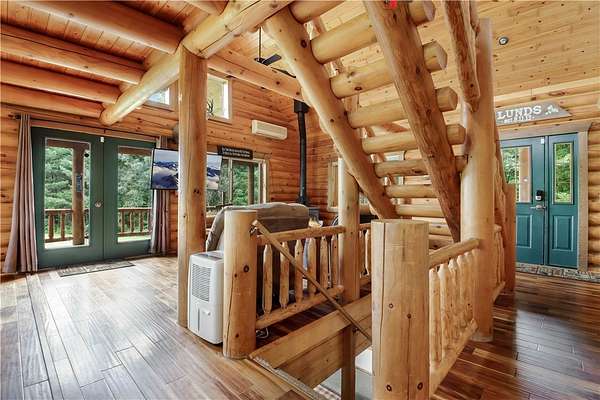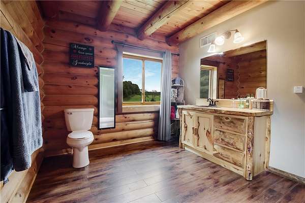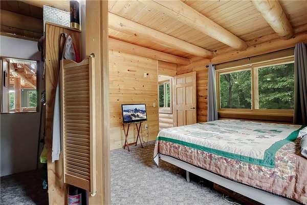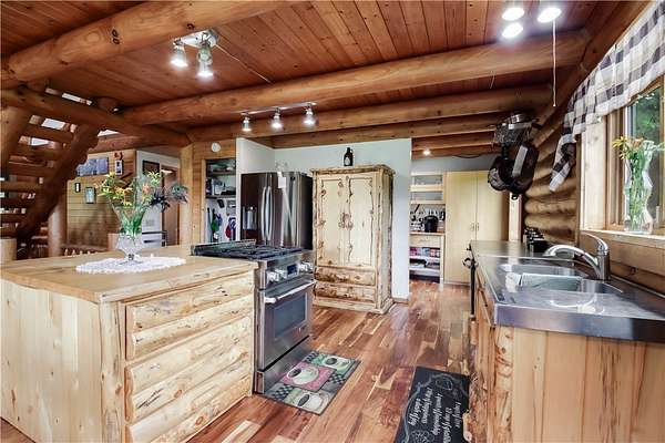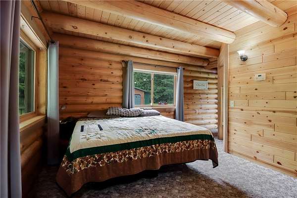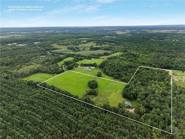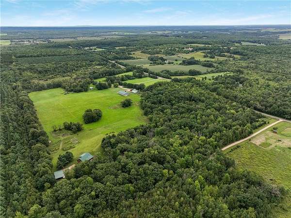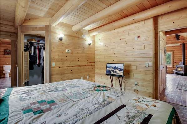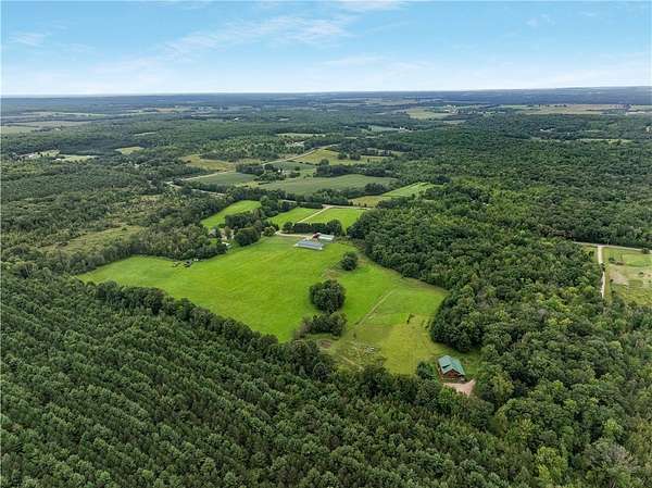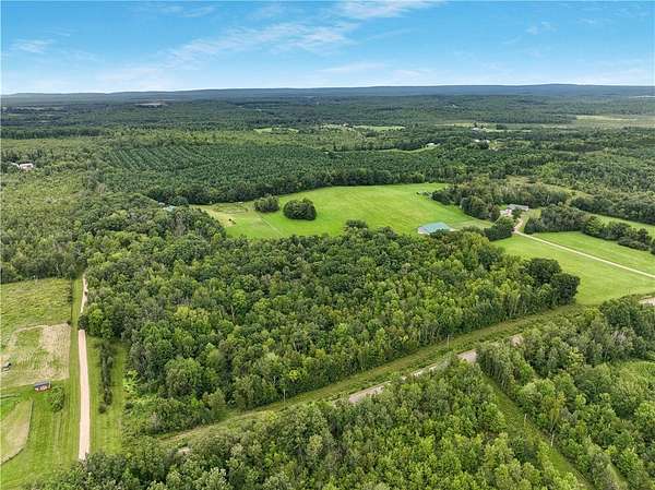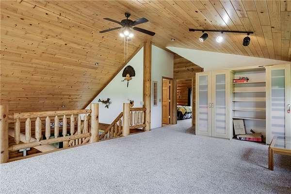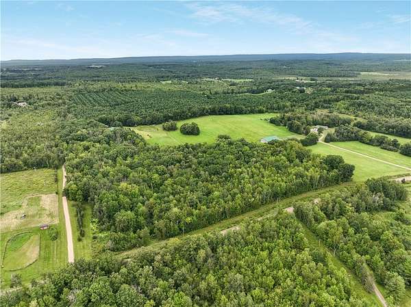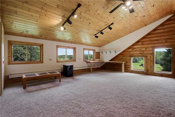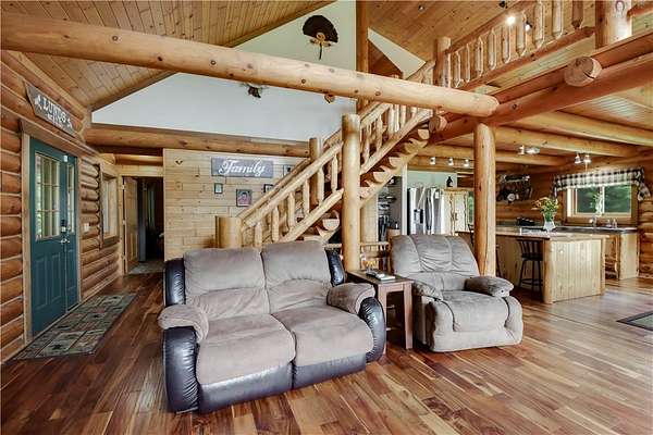 Imagine yourself at home in this chalet-style true log home, perfectly tucked off the road on 22+ wooded acres offering privacy and sweeping views of rolling hills and open fields. Enjoy the expansive covered wrap-around deck and large chalet windows that fill the vaulted living space with natural light. Inside, the open-concept main level features hardwood floors, a free-standing wood-burning stove, and a spacious kitchen with a huge walk-in pantry. The private owner's suite offers a large bath plus a convenient pass-through from laundry to closet. Upstairs loft adds flexible living space, while the walk-out lower level is ready for finishing touches to add even more room. Beautiful log finishes, live-edge steps & railings, and thoughtful design create a warm, inviting Northwoods feel throughout. The detached garage includes a 10x26 workshop or office, perfect for projects or working from home.