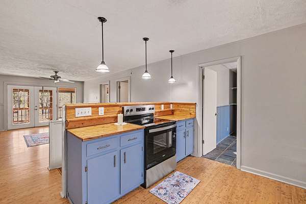 The home features 2 bedrooms and 2 full bathrooms. Upstairs, the open-concept living, dining, and kitchen area feels warm and inviting, filled with natural light and direct access to the wraparound porch, screened-in porch, and balcony. Whether it’s morning coffee, a rainy afternoon with the windows open, or quiet evenings overlooking the trees, this level was designed to connect you to the outdoors. Just off the primary bedroom, a private sitting room creates the perfect space for a reading nook, home office, or peaceful retreat.