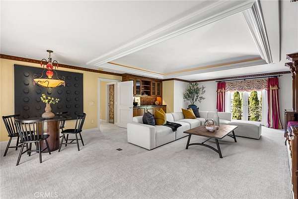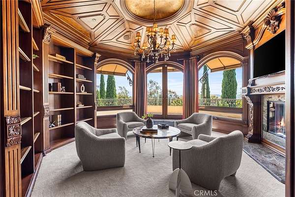- 2 Staircases, Balcony, Bar, Beamed Ceilings, Blinds Window Features, Built-In Features, Ceiling Fan(s), Coffered Ceiling(s), Crown Molding, Custom Covering, Drapes, French Doors, Granite Counters, High Ceilings, Open Floorplan, Pull Down Stairs to Attic, Recessed Lighting, Stone Counters, Storage, Two Story Ceilings, Wainscoting, Wired For Data, Wired For Sound