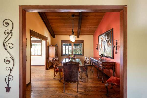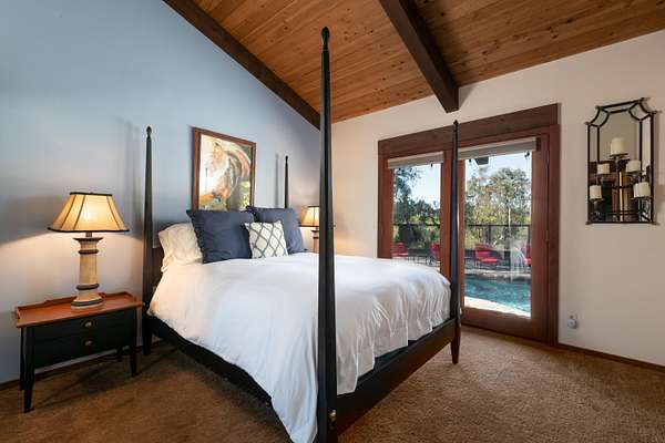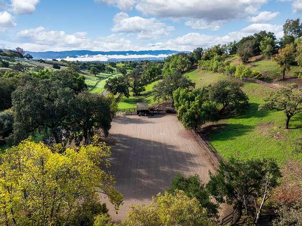 Classic ranch / lodge-style home, situated on over 10 acres, offers breathtaking views in the prestigious Oak Trail Estates of Santa Ynez. The custom-built residence spans nearly 4,000 sq. ft. Four en suite Bedrooms: including a primary suite with a cozy stone fireplace and direct access to the decks and swimming pool area. Main living area is Expansive. High beamed ceiling, a native stone fireplace, doors that open to a deck and porch. Wonderful Wrap-Around Porch and Stone Patios: Custom barn complex: within the barn, a 2-bedroom, 2-bath manager quarters, center aisle with 6-stalls and large hay storage area, plus a detached office structure, a covered round pen, along w/ multiple large turnouts with shelters. The riding arena offers direct access to riding trails