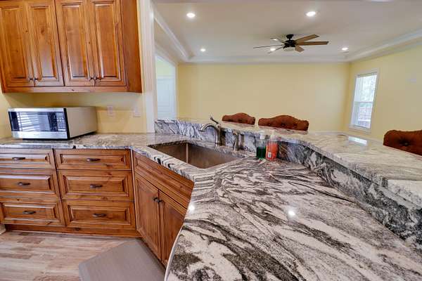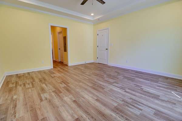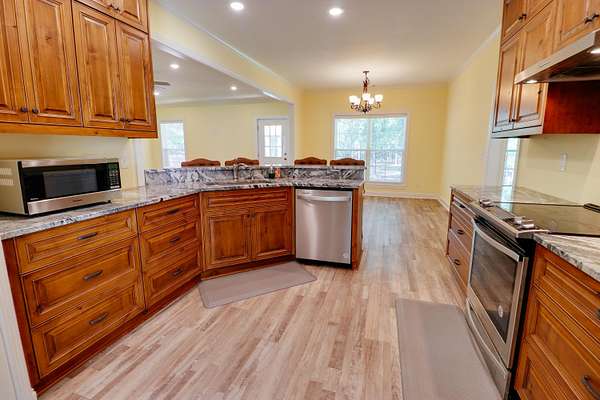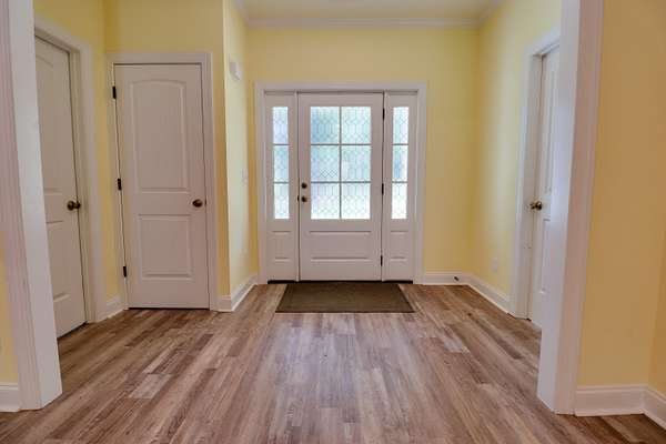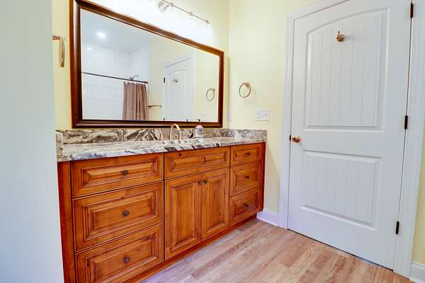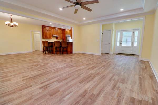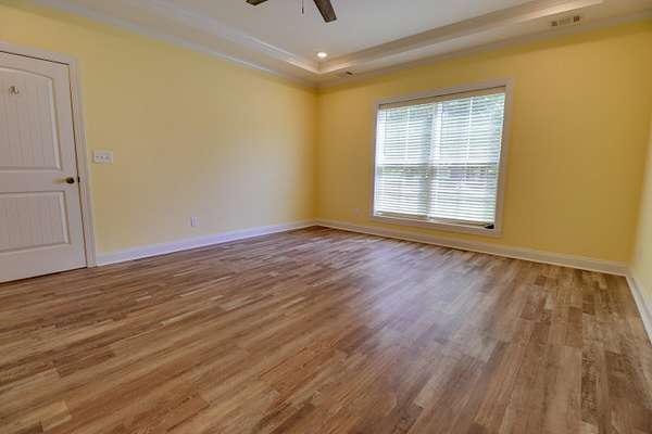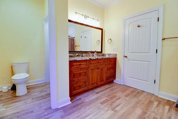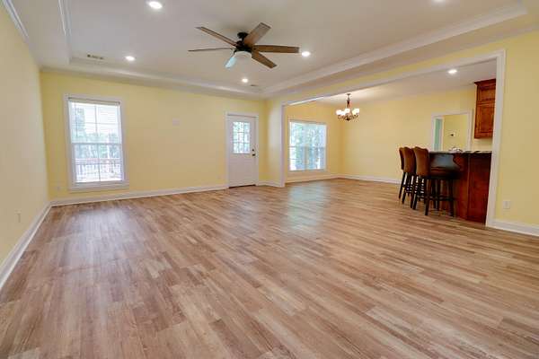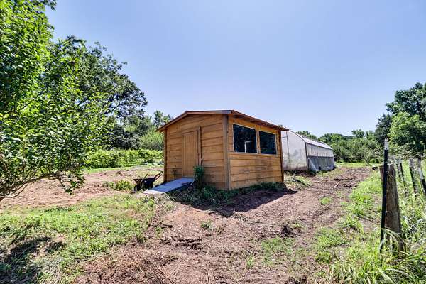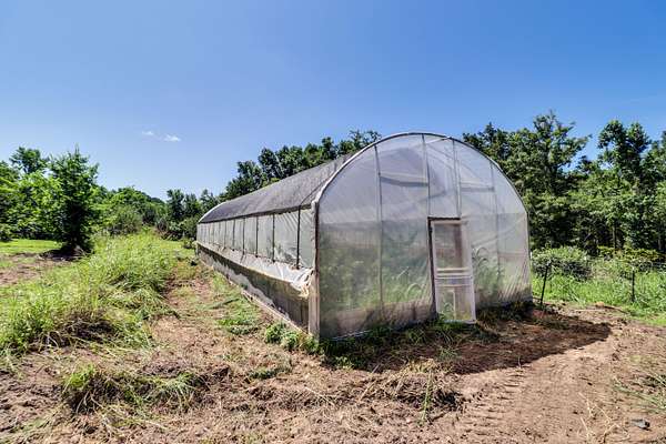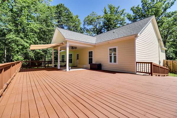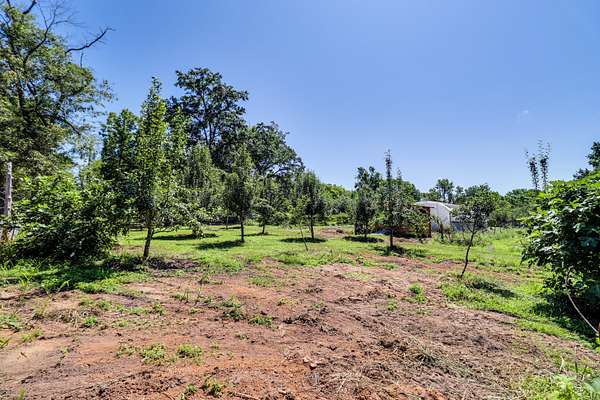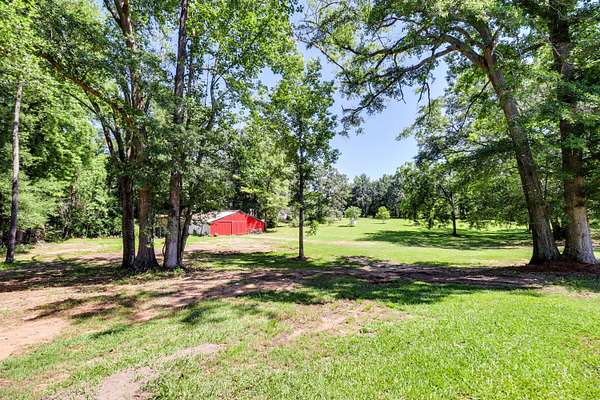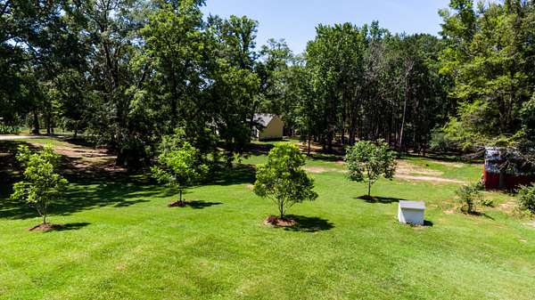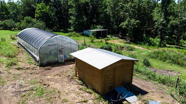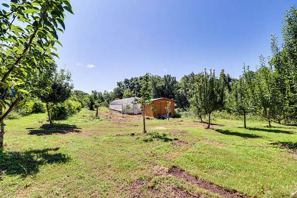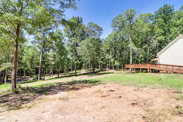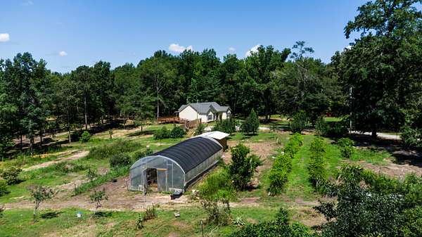 Discover peaceful country living on Soap Creek on Clarks Hill Lake just minutes away from Soap Creek Marina and restaurant with this beautifully designed 3 bedroom, 2.5 bath home set on over 35 picturesque acres of waterfront property, but not dockable. Surrounded by mature oak trees, with over 10 different kinds of fruit-bearing trees in an orchard of over 90 trees, and thoughtfully cultivated landscaping, this property is a rare blend of modern comfort and rural charm. Step inside to a spacious great room featuring high ceilings and a trey ceiling detail, all framed by large windows that overlook the expansive partially covered back deck-perfect for outdoor entertaining or simply taking in the natural beauty. The split floor plan offers privacy, with the primary suite on one side of the home and two additional bedrooms and a full bath on the other. The primary suite includes its own trey ceiling, two walk-in closets, and a luxurious ensuite bath with a soaking tub, tiled shower, and water closet with built-in storage. The heart of the home is the eat-in kitchen, showcasing custom cabinetry, stainless steel appliances, a pantry, and a large island with barstool seating-all accented by durable LVP flooring that runs throughout the home. Beyond the home itself, the land is a true highlight. A commercial-size greenhouse, insulated potting shed with air conditioning and electricity that needs to be hooked up, and a variety of fruit and nut trees-including blueberry bushes, pecan, black walnut, pear, plum, apple, mulberry, and pineapple guava-make this property ideal for gardening or hobby farming. There is a large barn (approx 34' x 34') on the property with spacious and abundant shelving and plenty of room for tractors, four wheelers, etc. Many are especially wowed by the number of huge shelves and space in the middle. Whether you're looking for a private retreat, a place to grow and explore, or easy access to the lake, this exceptional property offers it all.
