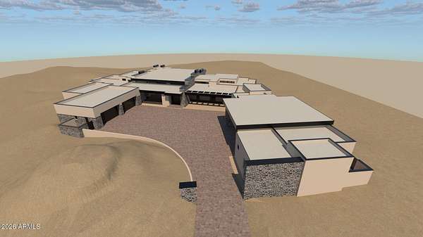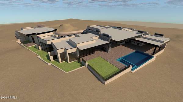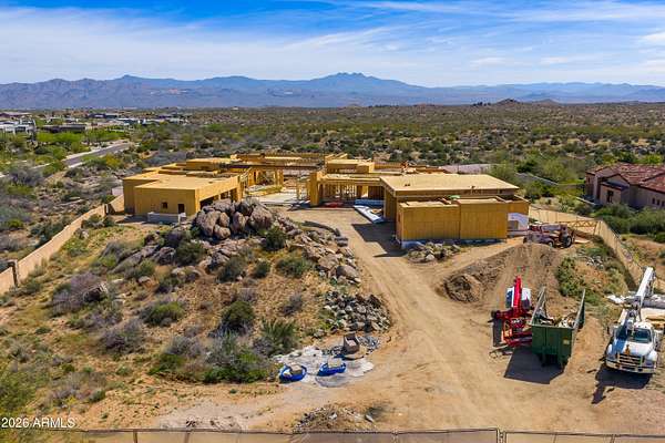 A Modern Desert Masterpiece Under Construction in North Scottsdale's Cantabrica Estates. Completion fall of 2026. Located in the highly coveted Troon area of North Scottsdale, within the exclusive gated enclave of Cantabrica Estates, this extraordinary modern residence is a collaboration between award-winning architect Craig Wickersham and luxury home builder DWD Homes. Thoughtfully designed to complement its dramatic High Sonoran Desert setting, the home presents a striking contemporary silhouette that maximizes expansive views, privacy, and a seamless connection to the surrounding landscape. Currently under construction with an anticipated completion in fall 2026, the residence is sited on an expansive 2.57-acre home site and showcases a pallet of refined design-forward finishes. The interior blends modern elegance with warm, organic textures and soothing tones, creating a serene yet visually compelling living environment. The main residence offers approximately 7,191 square feet and includes five ensuite bedrooms, two additional half baths, a dramatic great room, and a formal dining area that opens directly to outdoor living spaces. The chef's kitchen is complemented by a separate service kitchen and breakfast room, ideal for both daily living and elevated entertaining. Additional thoughtfully designed spaces include a private office, temperature-controlled wine room, a spacious entertainment or media room with direct outdoor access, and a dedicated fitness and wellness room with its own private patio. A fully appointed guest house adds approximately 1,769 square feet and features two ensuite bedrooms, a full-size kitchen, separate living room, and laundry facilities, bringing the total living area to approximately 8,960 square feet. The property is further enhanced by 7 oversized garage spaces, including a generous area ideal for a workshop, storage, or specialty vehicles. Designed for those with a discerning appreciation for craftsmanship, artistry, and fine materials, the home incorporates the latest in efficiency and technology throughout. Designer-selected wood-grain cabinetry is featured prominently in the kitchens and living spaces, while Fleetwood window systems and retractable walls of glass flood the interiors with natural light and create a seamless indoor-outdoor living experience. The outdoor living environment is equally compelling, designed to entertain and inspire. Expansive covered patios include a fully equipped outdoor kitchen, a large ramada with multiple seating and dining areas, two outdoor fireplaces, and an oversized television niche. The resort-style pool features a generous Baja shelf, swim jets, and a raised spa, all set against breathtaking views of the Sonoran Desert and the McDowell and Mazatzal Mountain ranges. Sunset colors across the surrounding mountains provide a truly awe-inspiring backdrop. Beyond the home itself, Cantabrica Estates offers a rare sense of tranquility and space. This intimate enclave of just nine luxury properties is surrounded by pristine desert beauty, yet remains conveniently close to the best of Scottsdale living. Nearby amenities include miles of scenic hiking, biking, and horseback riding trails, lakes for boating and fishing, and an array of world-class golf courses. Highly ranked Scottsdale schools and the renowned Mayo Clinic are also close at hand. Scottsdale's vibrant arts and cultural scene further enhances the lifestyle, with an impressive mix of museums, galleries, shopping, fine dining, and nightlife. Annual events such as Spring Training baseball, the Barrett-Jackson Car Auction, the Arabian Horse Show, and the Waste Management Phoenix Open add to the area's dynamic appeal. Perfectly suited for multi-generational living, the corporate executive, or anyone seeking a refined desert retreat, this exceptional residence harmonizes modern architecture with timeless natural elements. It offers privacy, serenity, and an elevated lifestyle in one of North Scottsdal