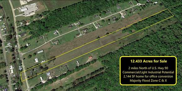 This listing is a potential office conversion on 12.433 acres of property just 2 miles north of US Hwy. 90 (futureI-49) on LA Highway 24 in the growing Houma-Thibodaux MSA. The acreage could be used for a light industrial sight, commercial/industrial development, residential development, or a mixed-use site. Included on the tract is a 2,144 SF home which could be used for office conversion or rental. It contains 3 Offices (bedrooms), 1 full bath, breakroom (kitchen), and a reception area (living room). There is also a 2 car garage and a storage barn. The batture is 11,194 SF and could be used for additional company signage or for potential billboard revenue. The property is almost all cleared land with some trees towards the rear near the drainage canal. Almost the entire tract is in current Flood Zone C and DFIRM Flood Zone X.