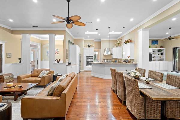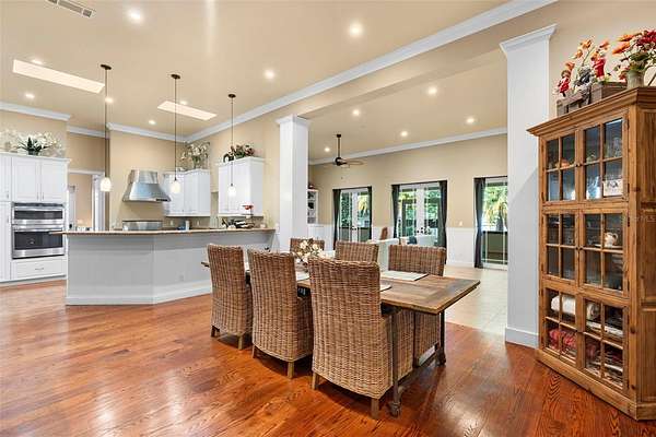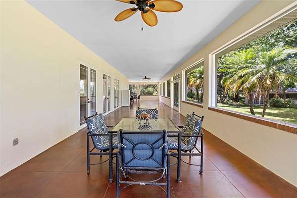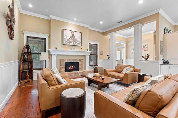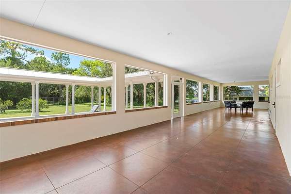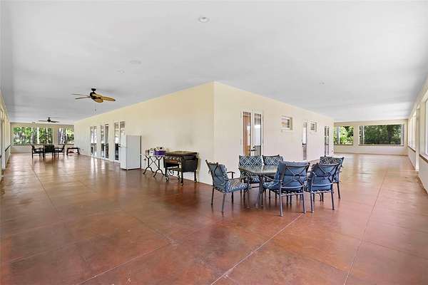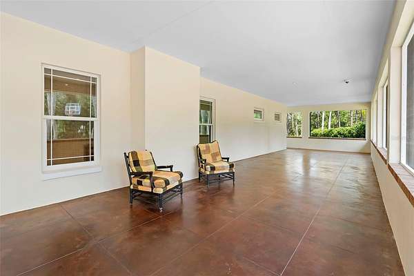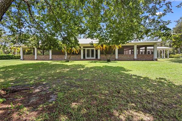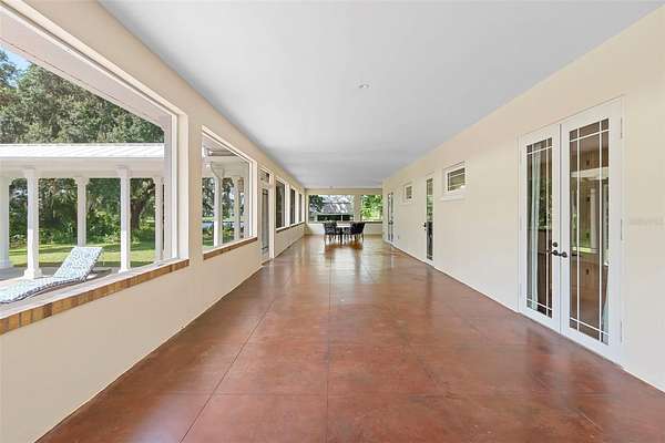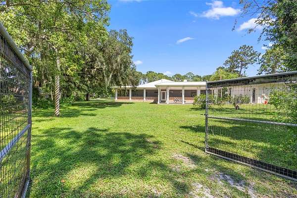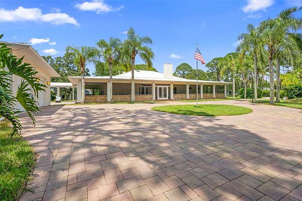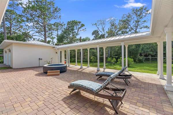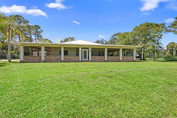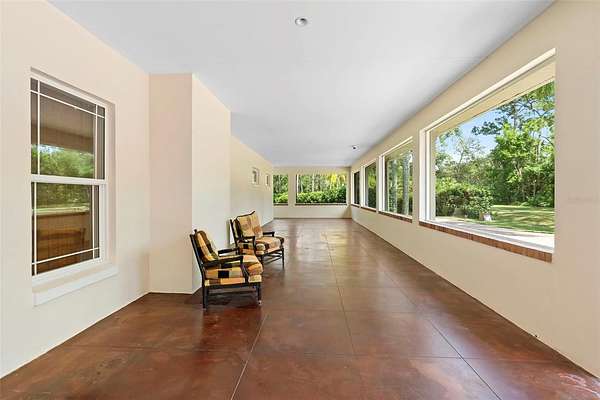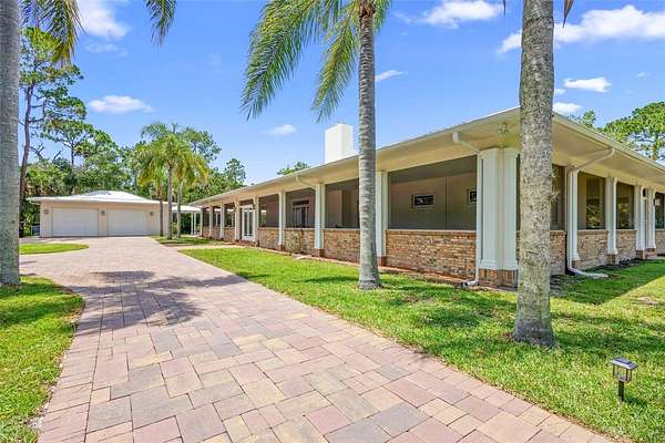 Welcome to 2659 Pioneer Trail, one of the most unique luxury properties in New Smyrna Beach. This exceptional estate blends timeless elegance with modern luxury and classic Southern charm. Perched on 2.66 acres of meticulously manicured and fully fenced land, the property offers ample space for RVs, boats, animals, or anything your lifestyle demands. A custom-built, nearly 4,000-square-foot wraparound porch provides stunning views of mature pines and a tranquil pond, enhancing the home's sense of privacy and seclusion. Inside, the home offers 3,039 square feet of refined living space, thoughtfully designed to blur the line between indoor and outdoor living. Nine sets of French doors seamlessly connect the interior to the expansive wraparound porch, allowing abundant natural light to pour into the home and creating an effortless flow for entertaining and everyday living. As you step through the front door, you are met with soaring 12-foot ceilings, full crown moulding, classic hardwood flooring, and an expansive family room anchored by a stately wood-burning fireplace. The chef's kitchen features granite countertops, a gas range, deep sink, prep sink, and generous workspace- perfect for entertaining or everyday living. The primary suite is a true sanctuary, complete with a private office or library, a spa-inspired bathroom with freestanding tub and dual vanities, and a spacious walk-in closet. Two additional bedrooms serve as private retreats, each offering en-suite bathrooms and French doors opening directly to the wraparound porch. A brick-lined courtyard connects the home to an oversized two-car garage via breezeway, while a secondary gated entrance provides easy access for trailers, large deliveries, or additional parking. The main entrance is hidden behind an automatic gate, leading down a hand-laid brick paver driveway bordered by manicured hedges and opening to a grand roundabout with a stately flagpole- an arrival that sets the tone for the elegance within. The property has been meticulously maintained and thoughtfully updated, including a whole-house Generac generator, updated HVAC system (2024), two new hot water heaters (2024), fresh interior and exterior paint, a gutter guard system, and more. Offering unmatched character, functionality, and a rare harmony with nature, this estate is more than just a home- it's a lifestyle.