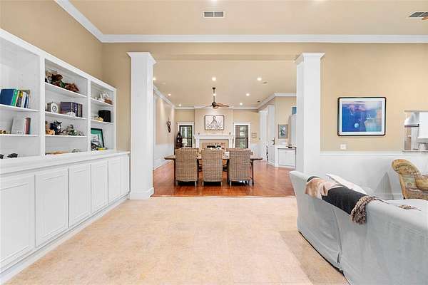 - Built-In Features, Ceiling Fans(s), Chair Rail, Crown Molding, High Ceilings, Kitchen/Family Room Combo, Living Room/Dining Room Combo, Open Floorplan, Primary Bedroom Main Floor, Solid Surface Counters, Stone Counters, Thermostat, Walk-In Closet(s), Window Treatments