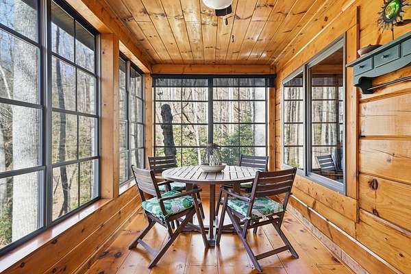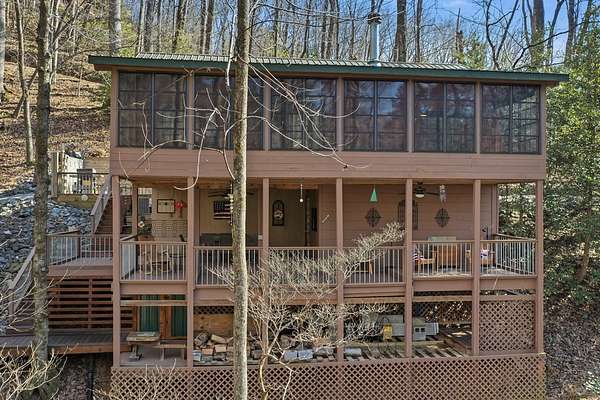 If you have ever dreamed of owning a real log cabin in the North Georgia mountains, this is it. Just 1.5 hours from Atlanta and a short drive to both Blue Ridge and Ellijay, 266 Chimney Rock Road delivers the lifestyle people imagine when they picture a true mountain escape. Set on 2.5 private acres surrounded by hardwoods and seasonal mountain views, this pristine cabin feels like the Lincoln Log dream brought to life. Inside, warm pine walls and ceilings, gleaming hardwood floors, and a stone wood burning fireplace create an instant sense of comfort. An easy living kitchen with new appliances opens to the main gathering space, making weekends effortless. Bedrooms are thoughtfully positioned on opposite sides of the home, and each includes an en-suite bath, offering privacy for guests. The outdoor living is what truly sets this property apart. From the great room, step into the sunroom featuring EZE Breeze windows that allow you to enjoy the space in every season. Open them for cool mountain air in the summer or close them for a cozy winter morning with coffee and a view. Below, a second covered deck provides additional space for dining, entertaining, and relaxing in the quiet of the woods. In addition to its inviting living spaces, the home offers a cedar workshop and generous storage areas, perfect for tools, outdoor gear, hobby projects, or simply keeping mountain life organized. With no rental restrictions, this property offers flexibility and income potential. Enjoy it whenever you need a reset, then share it with others when you are not using it. It is both a getaway and a smart investment. The lifestyle extends well beyond the property. Minutes away, you can hike to waterfalls like Long Creek Falls, explore the Aska Adventure Area, kayak the Toccoa River, visit apple orchards and wineries in Ellijay, or spend the afternoon shopping and dining in charming downtown Blue Ridge. Experience how this cabin offers privacy, proximity, and that unmistakable mountain