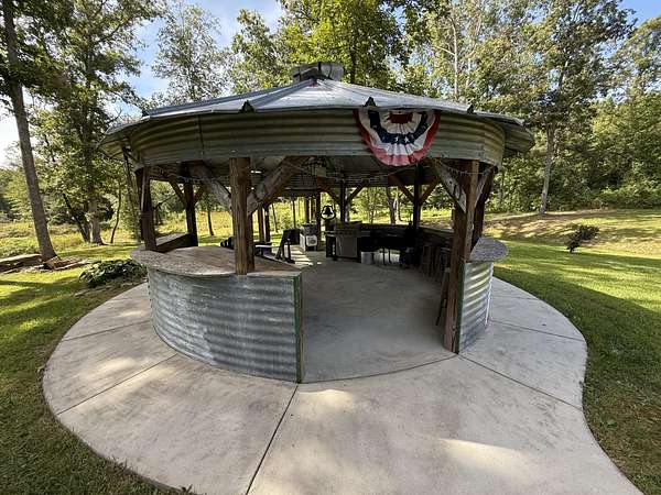 Converted silo entertainment space with grill, sink, and seating overlooking the pond.
