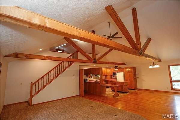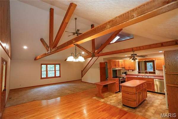- Beamed Ceilings, Breakfast Bar, Built-In Features, Cathedral Ceiling(s), Ceiling Fan(s), Custom Cabinetry, Dining/Living Room Combo, Entrance Foyer, High Ceilings