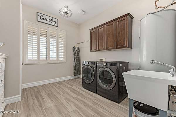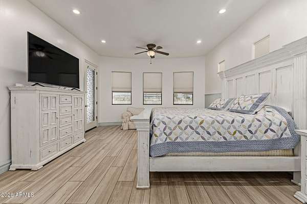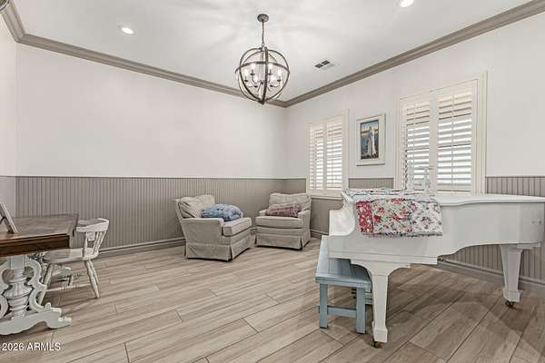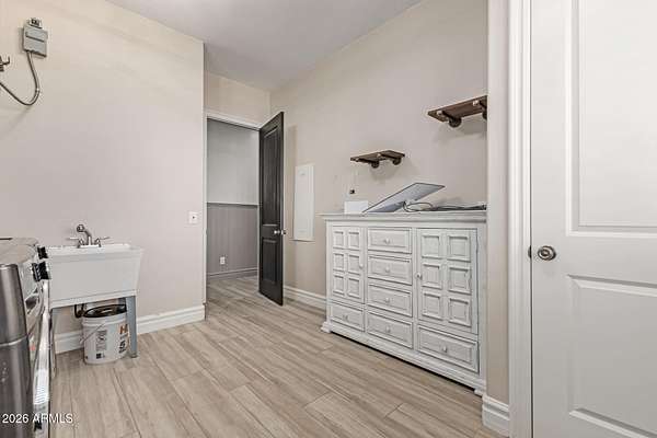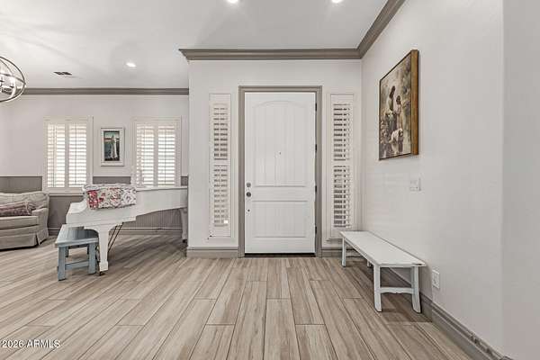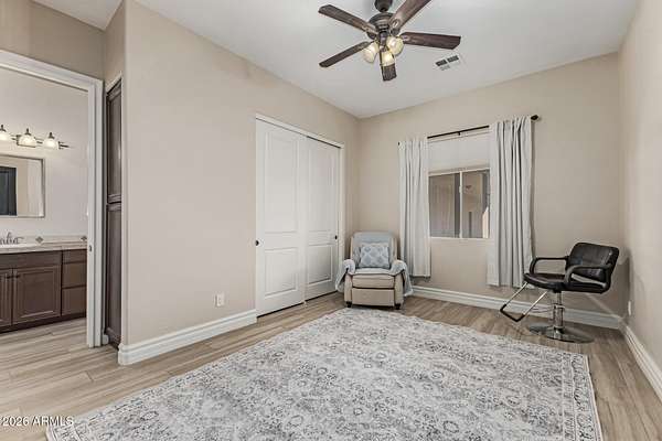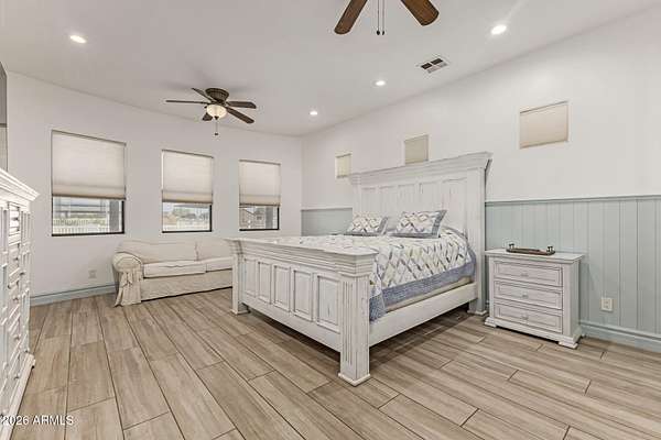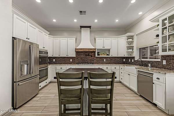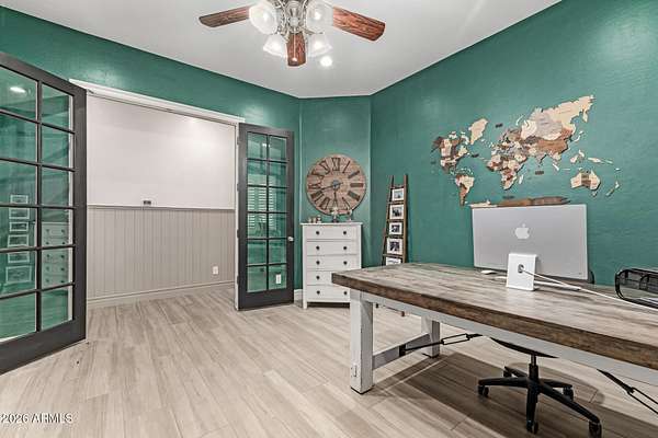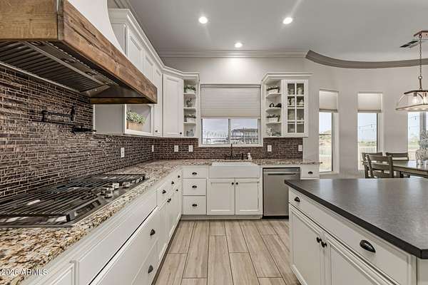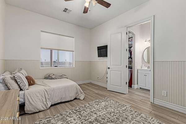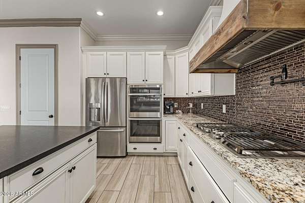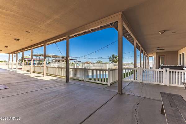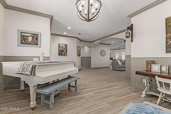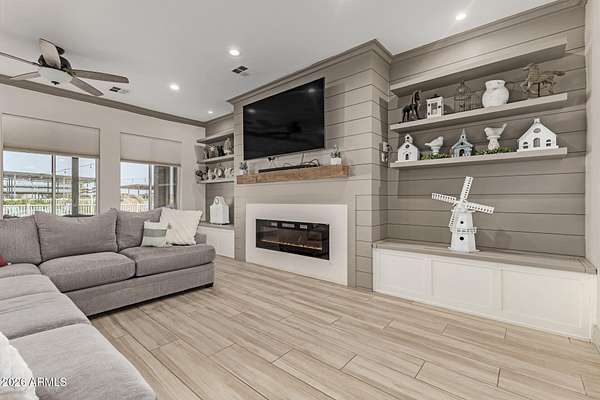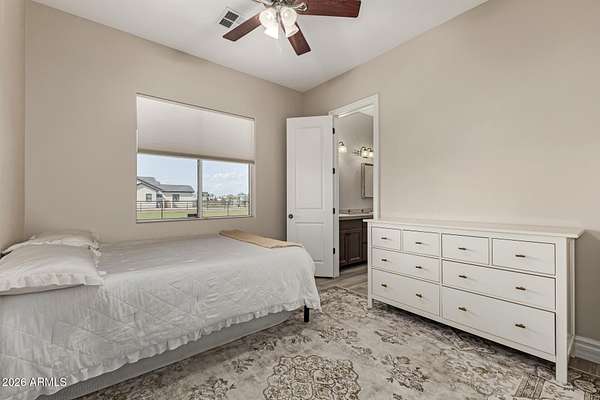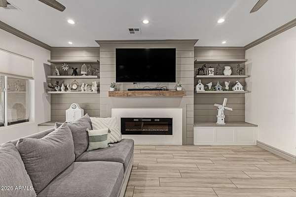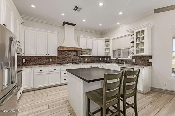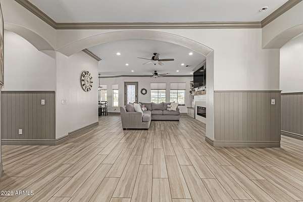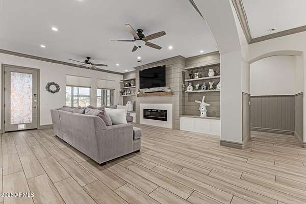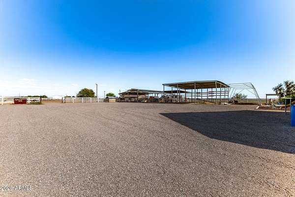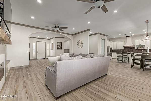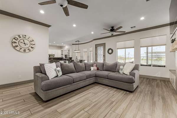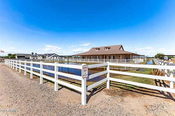 Experience the perfect fusion of luxury living and premier equestrian lifestyle in this exceptional custom estate nestled on 2.5 acres in Florence, Arizona. Thoughtfully renovated and impeccably maintained, this 4-bedroom, 3.5-bath residence offers refined comfort, expansive functionality, and top-tier horse facilities--all within city limits yet just minutes from San Tan Valley. From the moment you arrive through the large gated entrance and along the private road, you're welcomed by a property designed for both everyday living and elevated entertaining. The home showcases 10-foot ceilings, fresh exterior paint, and a charming wraparound porch that sets the tone for its inviting yet sophisticated interior. At the heart of the home, the gourmet kitchen is a true showpiece--featuring white cabinetry, granite countertops, a spacious island with seating, custom backsplash, oversized hood, double ovens, pot filler, and a farmhouse sink. A butler's pantry enhances both function and elegance, while the open-concept layout flows seamlessly into the dining and living spaces. The living room is highlighted by custom shiplap accents, built-in shelving, and a cozy electric fireplace with mantel. The split master retreat offers a private sanctuary complete with a spa-inspired ensuite, showcasing double vanities, a large walk-in shower, separate soaking tub, and designer shiplap detailing. Additional interior highlights include a dedicated office with French doors and built-ins, a large laundry room with sink, mudroom/drop zone, crown molding, new lighting fixtures, and wood-look tile flooring throughout. Step outside to your resort-style backyard, where a newly refinished pool with waterfall and slide creates the ultimate desert oasis. Enjoy outdoor living year-round with patio fans, ample seating areas, space for a future hot tub, and a children's playground with rubber mulch--all surrounded by durable vinyl fencing for added privacy and security. Equestrian enthusiasts will appreciate the thoughtfully designed horse facilities, including six galvanized covered stalls with water and electric, a large tack room, covered hay storage and trailer parking, a horse wash rack, and a professionally lit roping arena--ready for both recreation and serious training. Additional features include a detached 3-car garage and a versatile 549 sq ft climate-controlled multipurpose space--perfect for a home gym, office, studio, or guest retreat. With owned solar for energy efficiency and a rare combination of luxury, land, and equestrian amenities, this one-of-a-kind Florence horse property offers an unparalleled opportunity to live, work, and ride in style.