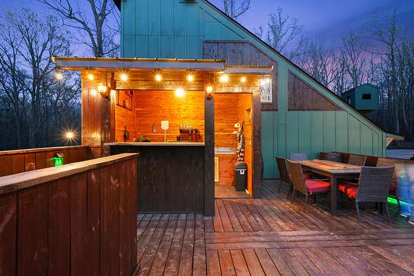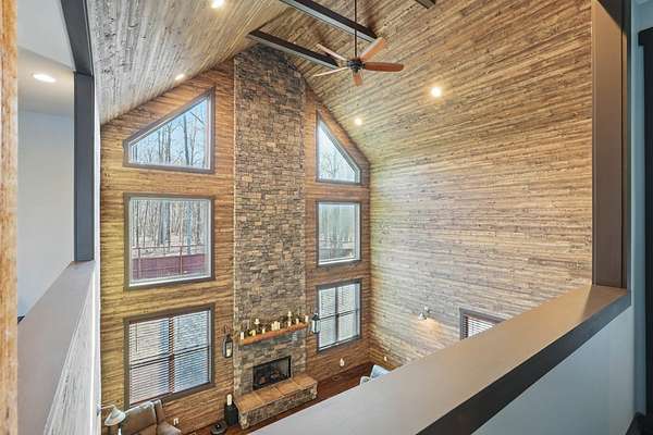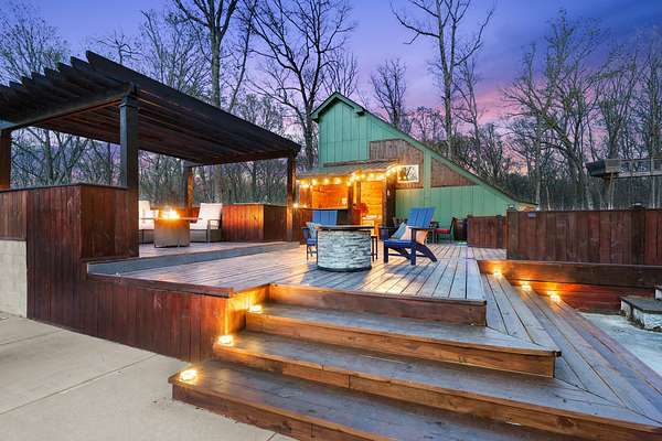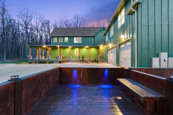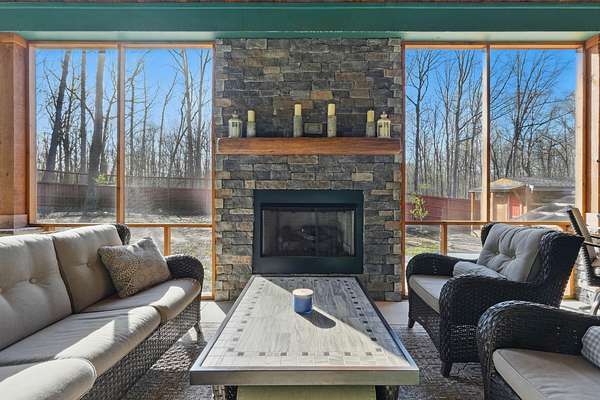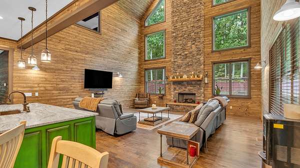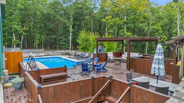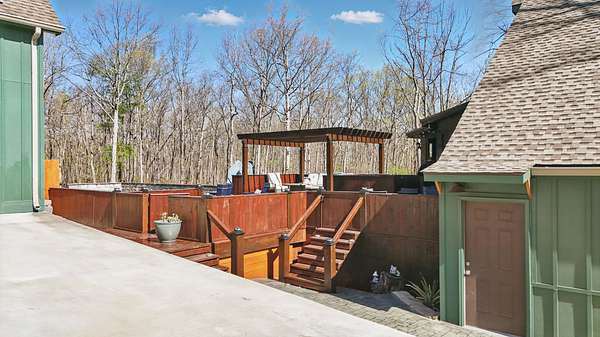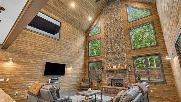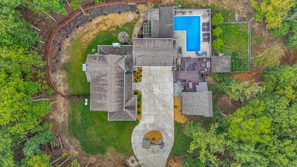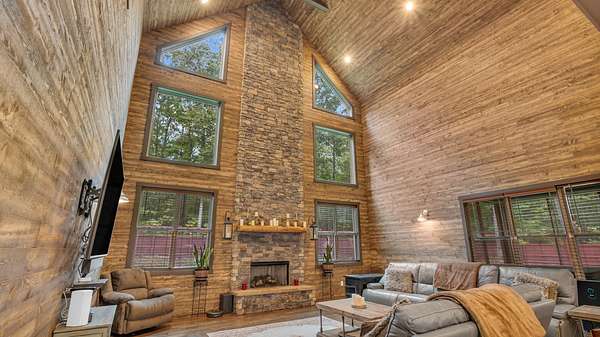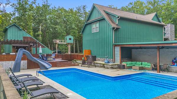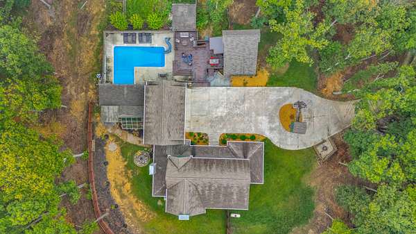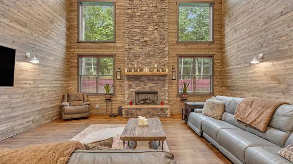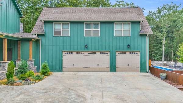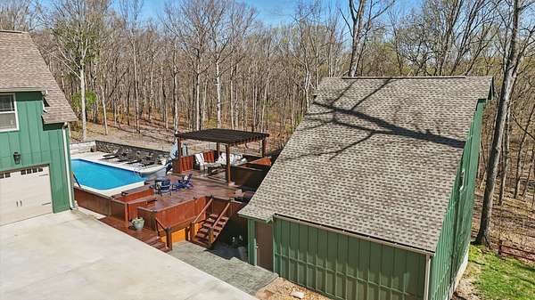 Welcome to the Daydreamer, a rustically chic mountaintop resort you're going to love! This property offers acreage and privacy with 5,000 sq. ft. of living space, including a separate apartment. Enjoy a park-like setting featuring a pool, cabana, outdoor kitchen, pergola, raised-bed organic gardens, a separate gym / sauna space / theater room, and wrap-around and screened porches-all on over seven acres with fruit trees, a ''she shed'' with power, and an actual treehouse that greets your guests at the circular drive. Additionally, there is a three acre green space with one of the community trailheads on the adjacent lot to the left of this property. Step inside, and you'll be amazed by the great room, boasting a 38.5-foot vaulted ceiling with exposed beams and a stunning stacked stone fireplace that reaches all the way up. Flanked by a wall of windows, it feels like you're immersed in the forest behind this beautiful home. The open kitchen and eating area feature exquisite countertops, and the screened porch comes with a fireplace and hot tub. The pool and cabana include an outdoor kitchen with a pizza oven, Blackstone griddle, smoker, sink, and fridge-perfect for entertaining on a grand scale. The interior features synergy wood, rough-hewn solid pine, and hardwoods on the main floor, with hen-pecked cypress upstairs. Solid core doors and 10x10 cedar posts are throughout, with ten-foot ceilings on the main level and nine-foot ceilings above. Every nook and cranny has been meticulously planned. The main level primary suite is spacious and features a large walk-in closet, separate vanities, a grotto-tiled shower with river rock flooring, and a copper basin soaking tub, providing a spa-like experience every day. Upstairs, you'll find two bedrooms, two baths, a loft TV area, and an office area, along with pull-down floored storage above. Enjoy the covered wrap-around porch in the front and the screened porch with a fireplace and 5' x 6 hot tub, large enough to hold 4 - 5 adults. Boasting 1,330 square ft of decking, four feet up to nine feet deep pool, heated, with a swim up ledge four by twelve feet, terra grade liner four years old, four deck jets to arch water into the pool, pool lighting and cover will be good for years of relaxing, kids playing, and excellent exercise. Don't forget to check out the gym with a built-in 2'x6' sauna, as well as an impressive media or game room with NFL-grade turf. There's also a ladder to the loft with storage and a hydraulic lift. Above the garage, there's a 960 sq. ft. studio living space featuring a full kitchen and full bath, perfect for a pool table and game room, or a spacious Accessory Dwelling Unit. There are many other details to explore, so feel free to call for more information. Whether it's your perfect dream home, a weekend getaway, or a short-term vacation rental (STVR - Home is eligible for STVR through the association application process) for income. This property truly offers everything you could want. The Daydreamer rolls all your dreams into one stunning property. Don't miss your chance to see it while your dreams can still come true!