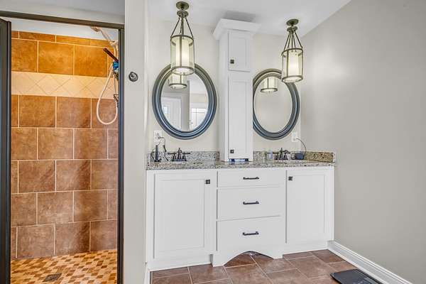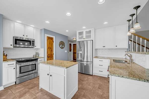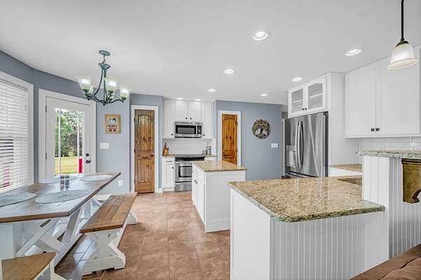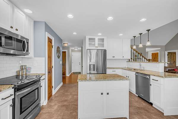 Inside, the home strikes a perfect balance between comfort and function. The kitchen is designed to handle real life with ease, featuring granite countertops, a center island, double pantries, and an eat-in area that naturally becomes the heart of the home. The main-level primary suite offers a private retreat, complete with a full bath that includes a separate tub, low-entry tiled shower, walk-in closet, and direct access to its own patio—perfect for morning coffee or unwinding at the end of the day.