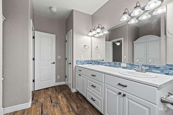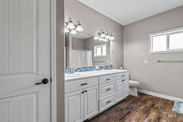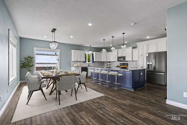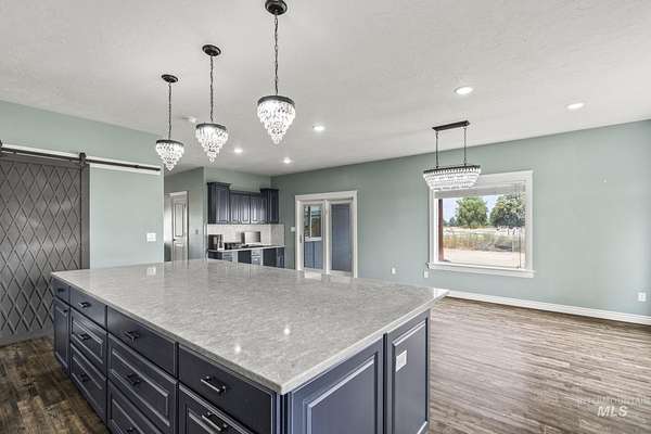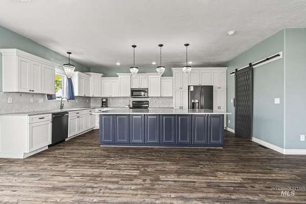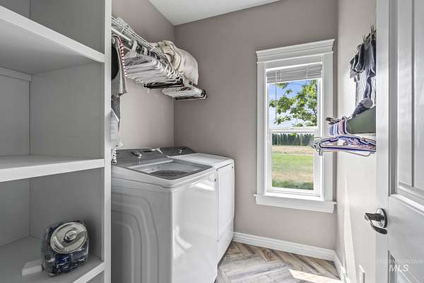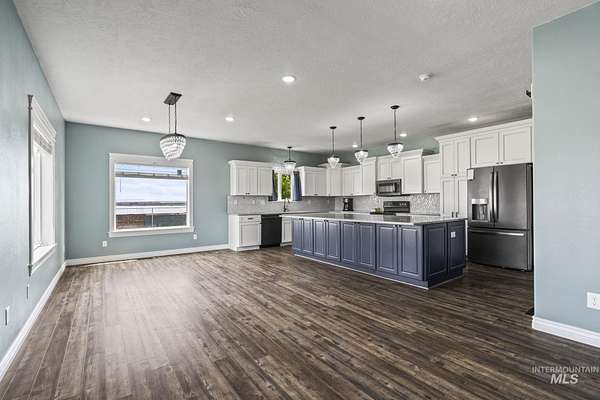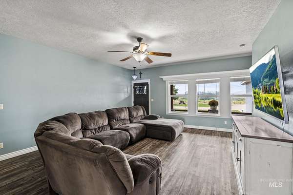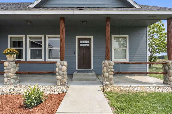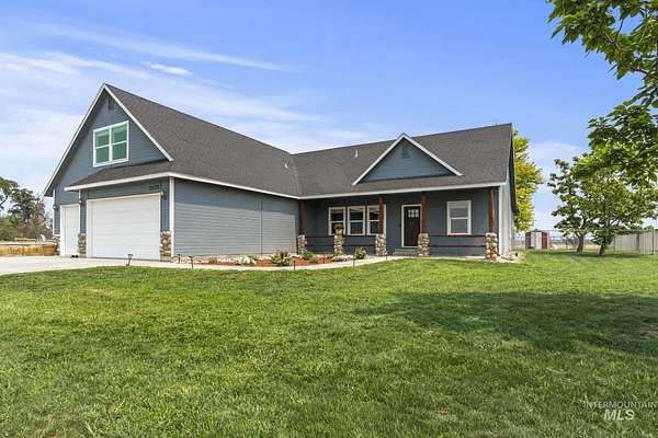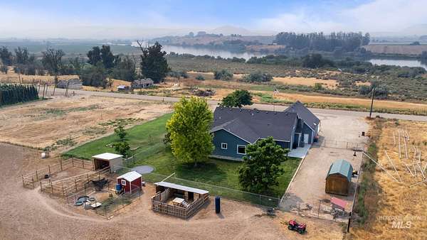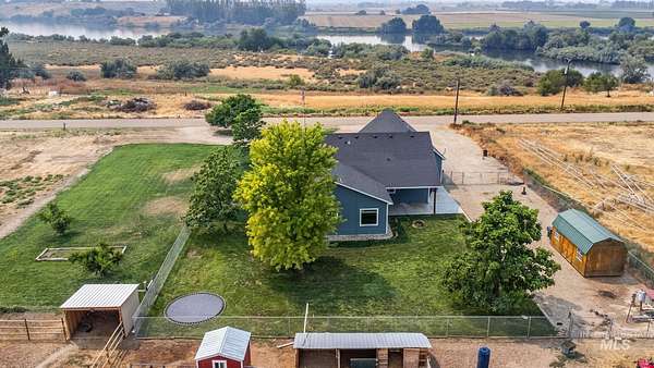 NEW PRICE and ready for new owners who want to come live their dream! Just steps from the Snake River, surrounded by stunning mountain & river views, this custom 5-acre estate with no HOA features an expansive & welcoming covered front porch with stone & wood accents. The chef's kitchen, a true masterpiece, features a generous center island with wrap-around cabinetry, custom wood cabinets with soft-close doors & pull-out drawers, full tile backsplash & a butler's pantry. The spacious, main-level primary suite features a walk-in closet with built-ins, dual sinks & a step-in shower. Two additional bedrooms, a full bath & laundry room complete the main floor. Upstairs includes an XL bonus room that overlooks hills & mountains, two additional bedrooms & a full bath. 9' ceilings, wood blinds, LVP flooring, & NEW water softener & filtration system included. Outdoors, enjoy a fully fenced grassy backyard featuring mature trees & in-ground trampoline, a fenced pasture with irrigation, covered patio, RV parking & a 10x20' shed. The extra-deep 3-car garage provides abundant storage! Water rights are included! Bring your animals, horses, RVs, boats and come live your dream!