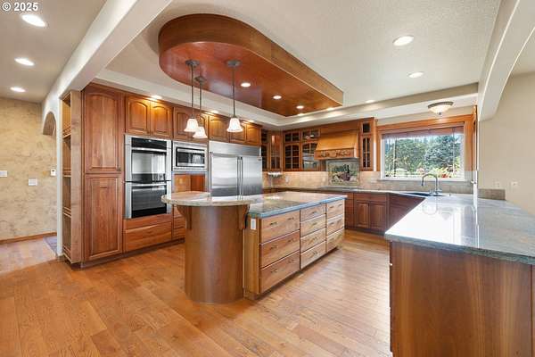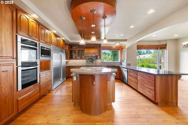 - Builtin Oven, Builtin Range, Builtin Refrigerator, Cook Island, Cooktop, Dishwasher, Disposal, Double Oven, Granite, Island, Microwave, Plumbed For Ice Maker, Pot Filler, Range Hood, Stainless Steel Appliance, Wine Cooler