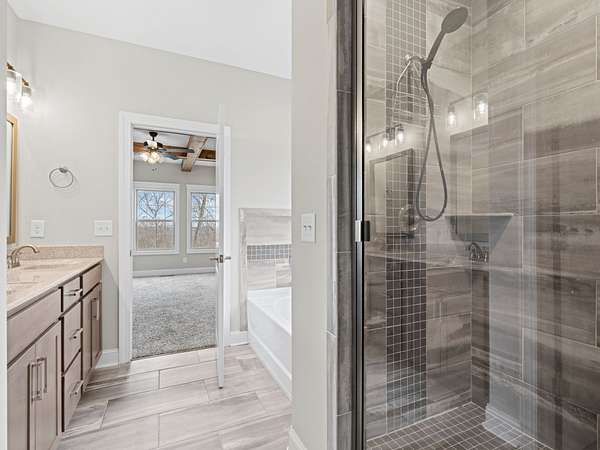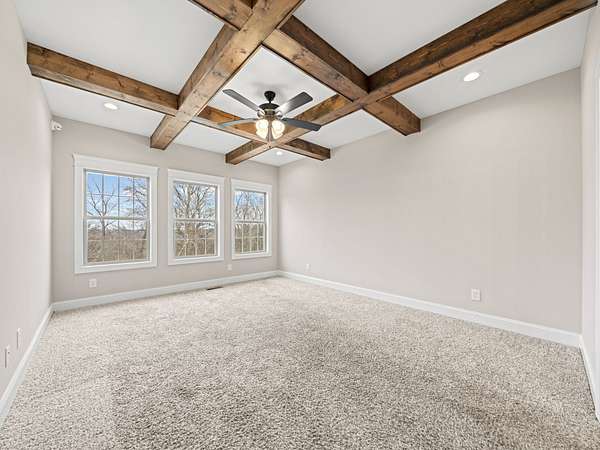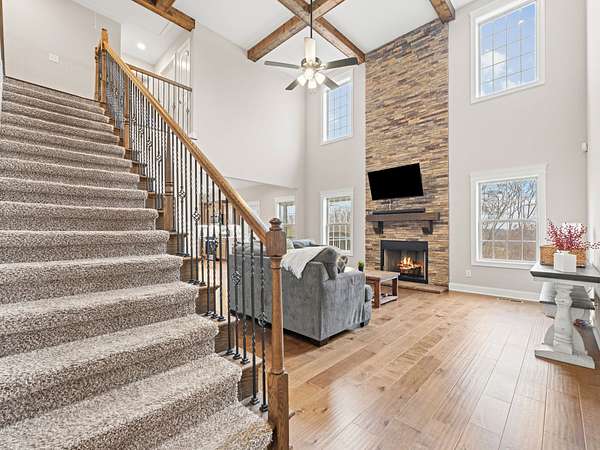 The great room makes an immediate impression with its high ceilings, wood beams, and stone fireplace. The kitchen ties it all together with granite countertops, a glass tile backsplash, under-cabinet lighting, and stainless-steel appliances--an easy place to cook, gather, and stay connected to the main living area. The front room, finished with barn doors, currently serves as an office but can easily shift back to a dining room when you want a dedicated gathering space.