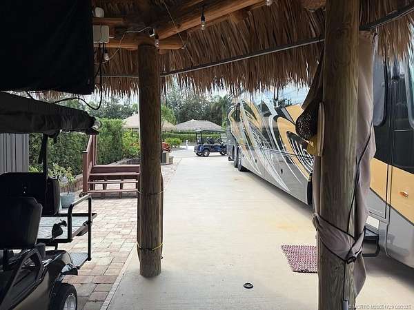 Waterfront Lot Near the Clubhouse. Looking for the perfect spot to relax and unwind? This north-facing, pull-in lot is just a short stroll from the main clubhouse and offers gorgeous waterfront views with amazing sunsets. You'll love the spacious tiki setup-it's got privacy shades, two ceiling fans, upgraded lighting, and a big TV, making it the perfect hangout spot. The outdoor kitchen is ready to go with all-weather cabinetry and beautiful granite countertops. There's also separate pavered area for golf cart parking, raised paver landscape beds for extra privacy (yes, there's even a lemon tree!), great electrical upgrades throughout the tiki. It's fully landscaped, move-in ready, and waiting for you to pull in and start enjoying. Just bring your coach and relax!