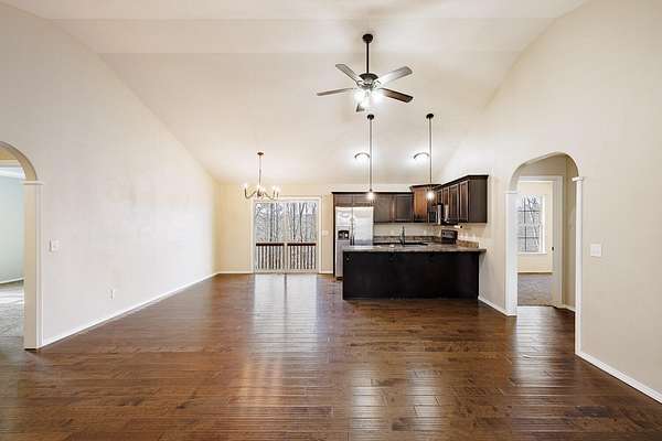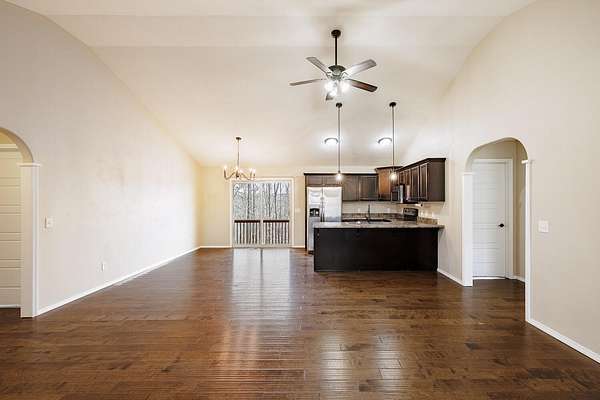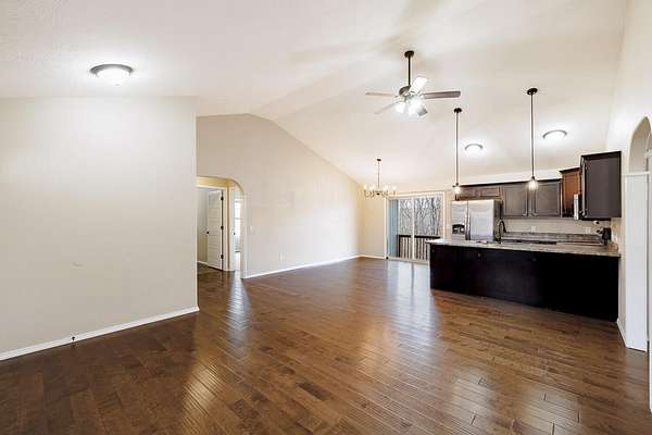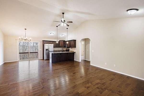 267 Ridgedale Rd, Highlandville, MO 65669Discover peaceful living surrounded by nature in this beautifully designed 4-bedroom home, perfectly tucked among the trees in the desirable Stoneshire community. This newer build offers charming curb appeal with brick accents, vertical siding, and a welcoming front porch that sets the tone for the serenity found throughout the property.Inside, you'll love the open-concept layout featuring warm wood flooring, plush carpeted bedrooms, 5-panel doors, and a soaring vaulted ceiling that fills the living room with natural light. The kitchen is both stylish and functional--complete with stainless steel appliances, micro-hood, composite sink, breakfast bar with pendant lighting, and Edison bulbs that add the perfect touch of character.Step onto the back deck and take in your private forest view, or explore the grounds and enjoy the wet weather creek that runs through the back of the property--a rare and beautiful bonus. With 3 peaceful acres to spread out, unwind, and enjoy the outdoors, this home is the ideal blend of comfort, charm, and natural beauty.Make this Highlandville retreat your next chapter.