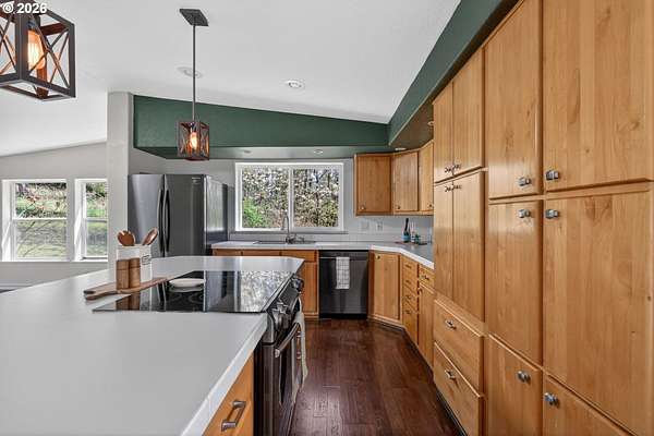 - Dishwasher, Disposal, Free Standing Range, Free Standing Refrigerator, Island, Pantry, Stainless Steel Appliance, Tile
