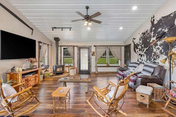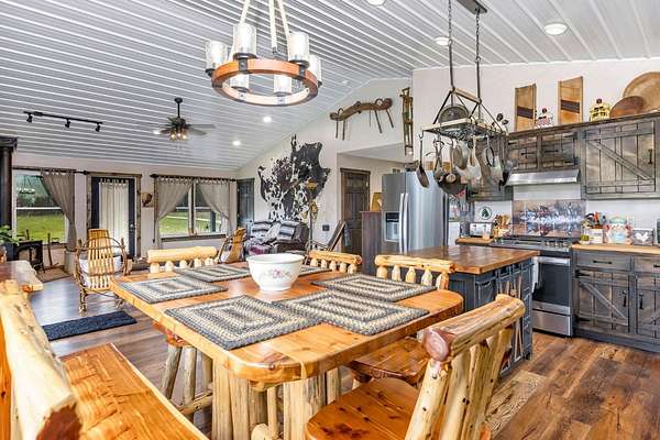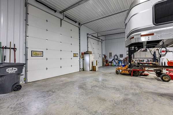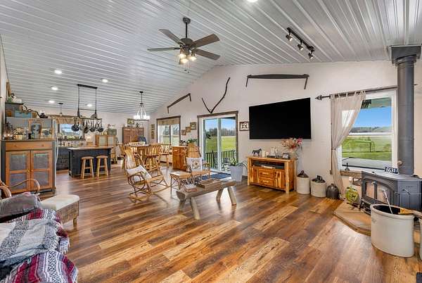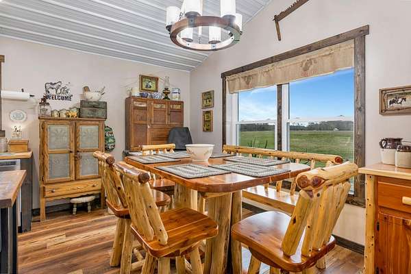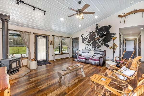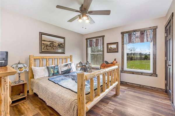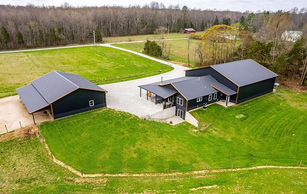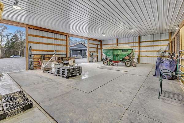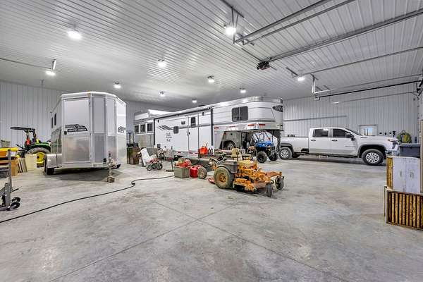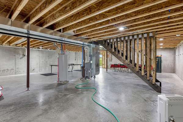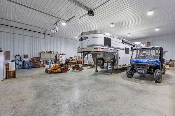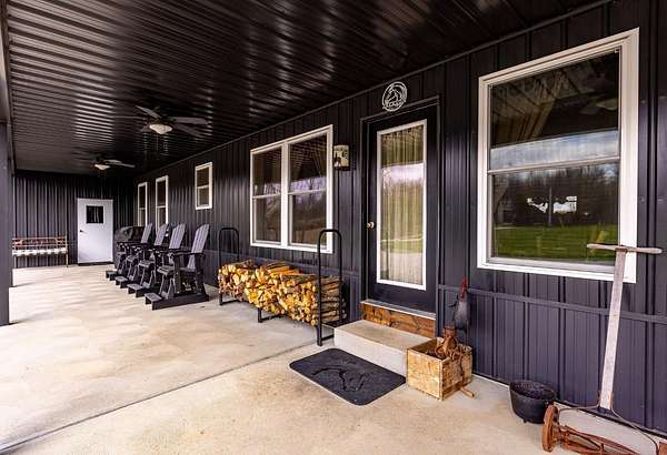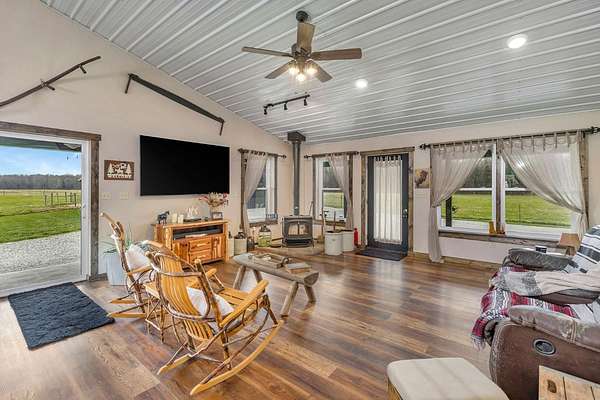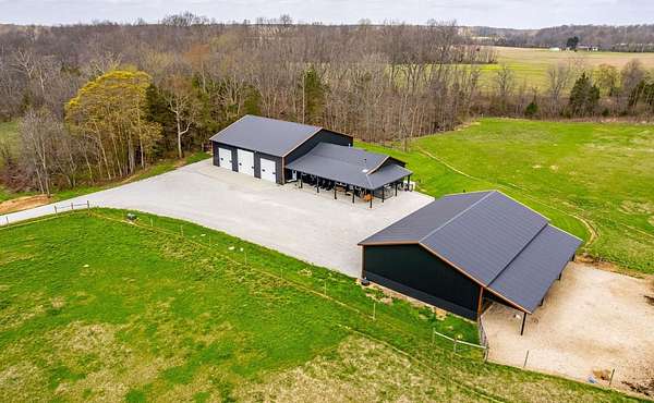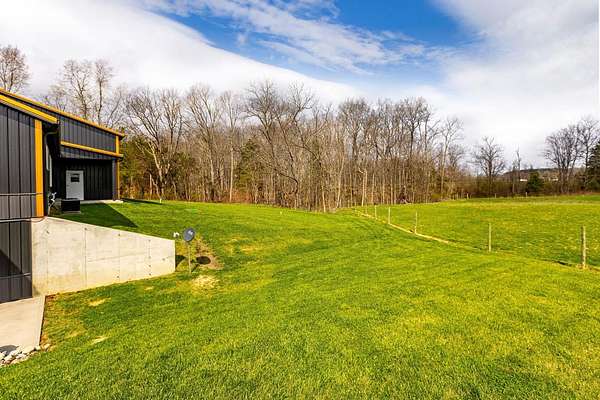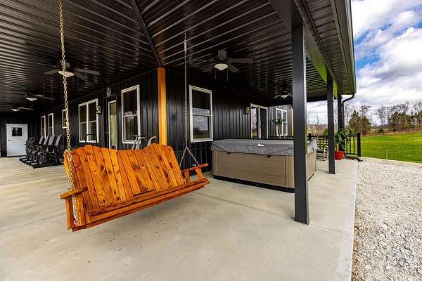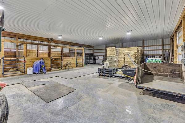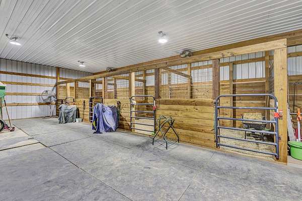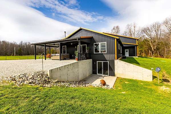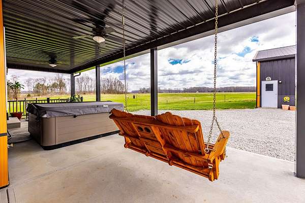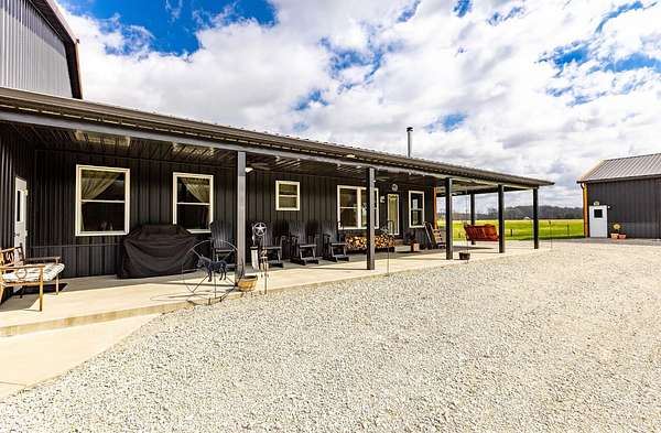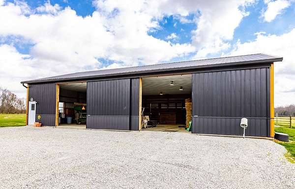 Welcome to country living! Built in 2022 and situated on 6.41 acres, this cozy 2-bdrm, 2-bath home offers comfort & charm with room to grow. The full walkout basement is ready for your vision. Ideal for a future 3rd bdrm, add'l bath, or expanded living space. Enjoy the outdoors from the home's covered wrap around porch w/ hot tub and countryside views, creating the perfect space to unwind and relax. The property features an impressive 40x60 horse barn w/ four 10x10 stalls, solid wood Dutch doors, a fully enclosed ceiling (no rafters), and a spacious 12x60 covered porch, Perfect for enjoying the peaceful surroundings. A 70x70 dry lot and outdoor automatic water system provides added convenience for daily horse care. The impressive 60x60 attached 4 car garage w/ electric provides plenty of space for vehicles, equipment, or hobbies. Located directly across from Versailles State Park, you'll enjoy access to 25 miles of wooded horse trails, making this a dream property for trail riders.