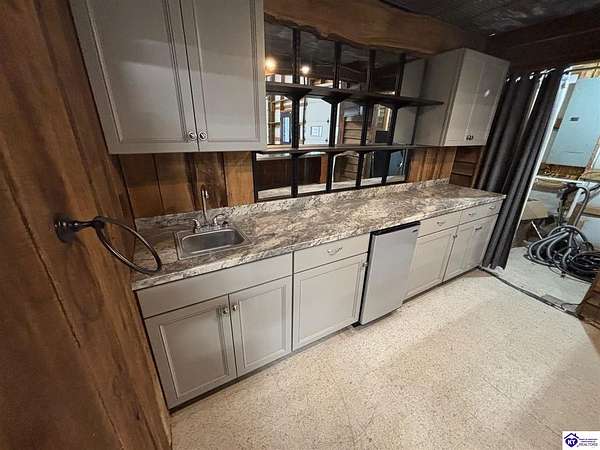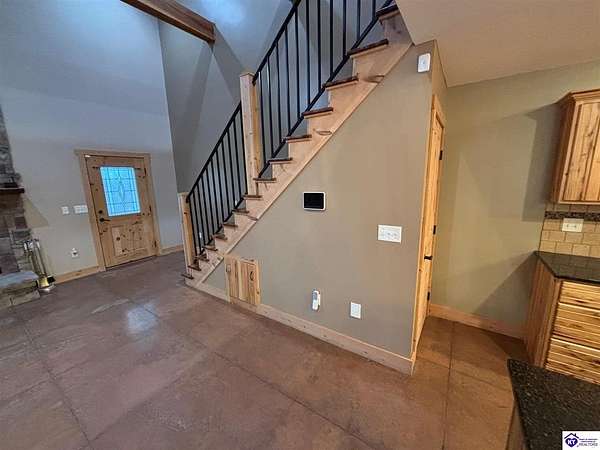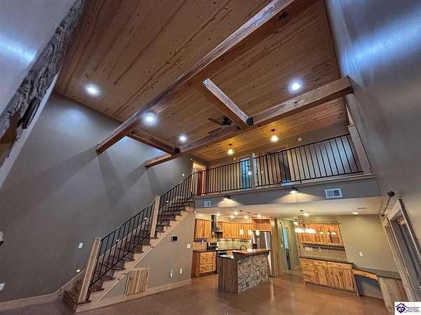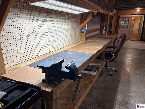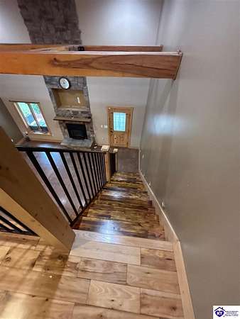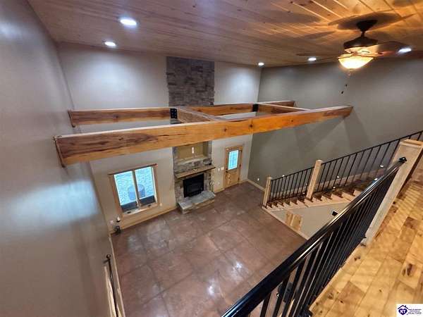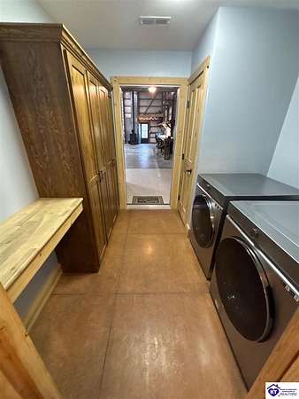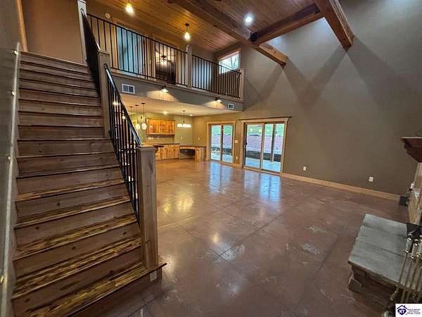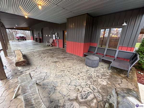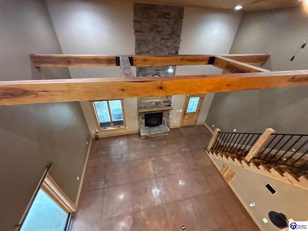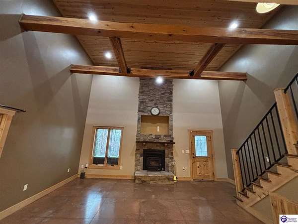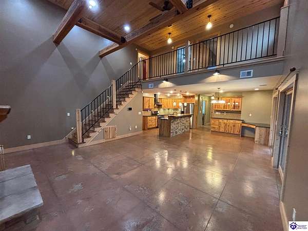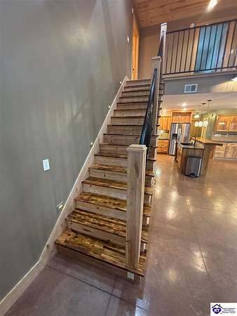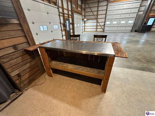 Going on the auction block, selling by online bidding only, with bidding ending on Thursday, January 8th at 4:00 PM EST, is a three bedroom, two and a half bath barndominium, built in 2010, with approximately 1,852 finished square feet, large attached garage area and 5.64 acres. The main floor of the finished area consists of a large "great" room with a floor to ceiling, mantled stone fireplace with hearth, stained concrete flooring and open staircase, a modern kitchen with granite and live edge countertops and dining area, a spacious primary bedroom with tray ceiling and a large walk-in closet with two entries, a spacious full primary bathroom with tiled shower, and a utility room. The upper level consists of two bedrooms, a full bathroom, and a loft area with hardwood flooring. The finished area of the home is cooled with central air and heated by an electric heat pump. The home area and the half bathroom in the garage also have radiant floor heat. The 40 ft. x 50 ft. attached garage has a half bath, multiple overhead doors, a wet bar area with island, furnace room, storage closet with gun safe, lofted storage areas, two mini-split heating and cooling units, a wood burning stove and a radiant coil heated system. Other improvements include a covered concrete side porch, a large covered front porch with finished and stamped concrete, a handgun shooting range with backstop, attached shed and a large graveled parking area. The acreage is mostly wooded with mature trees and fronts Fairground Rd (Hwy 1692).