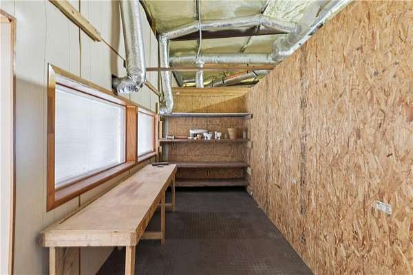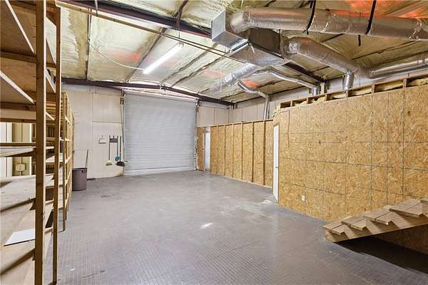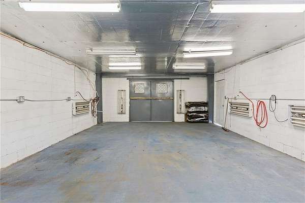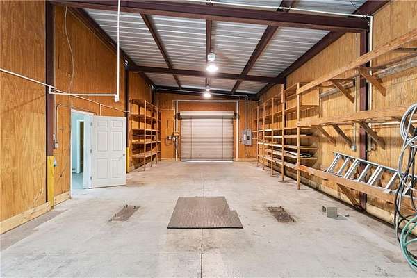 Building B: Garage/shop with high ceilings and attached office/retail.