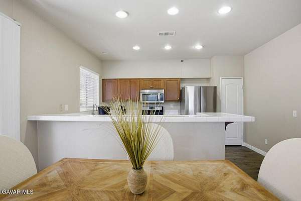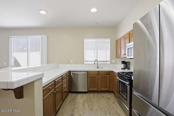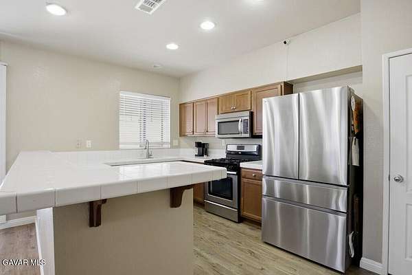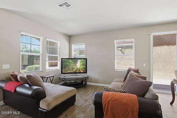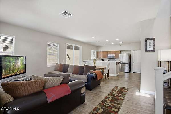 Welcome to this lovely 3-bedroom, 3-bathroom home with a versatile loft, located in the desirable gated community of The Vineyards. Perfectly positioned on a lush greenbelt and situated on a private corner lot, this home offers both comfort and tranquility. Step inside to find warm wood flooring downstairs and an open-concept layout that seamlessly connects the living room, dining area, and kitchen--ideal for everyday living and entertaining. The kitchen features recessed lighting, stainless steel appliances, and a peninsula with barstool seating for casual dining. The dining area opens to a private patio through sliding glass doors, creating an effortless indoor-outdoor flow. A convenient half bathroom and dedicated laundry room complete the downstairs. Upstairs, you'll find a loft that can be used as a home office, playroom, or additional living space, along with all bedrooms including the primary suite with its own ensuite bathroom. Additional highlights include an attached 2-car garage, offering both convenience and ample storage. Residents of The Vineyards enjoy access to exceptional community amenities, including a volleyball court, half basketball court, 2 playgrounds, BBQ areas, grassy gathering space, ample guest parking, and beautifully maintained landscaping throughout. Ideally located near downtown Palmdale, this home offers easy access to shopping, dining, and schools. Don't miss the opportunity to make this your next home!