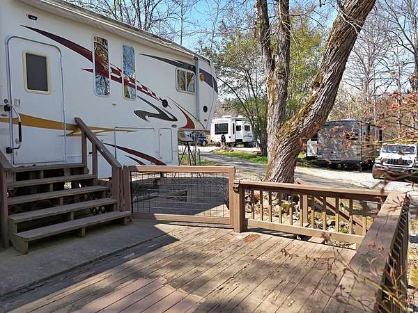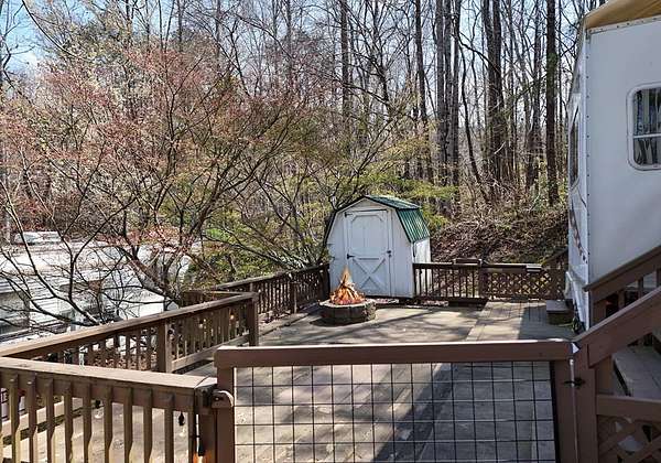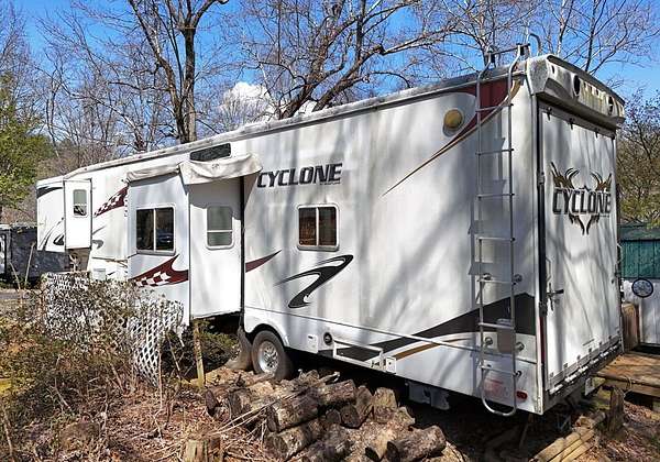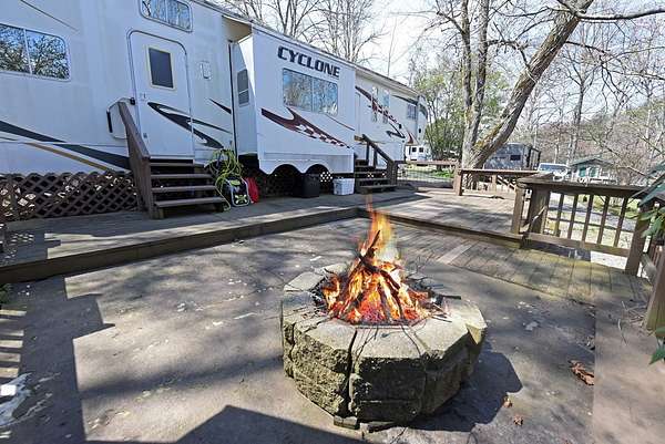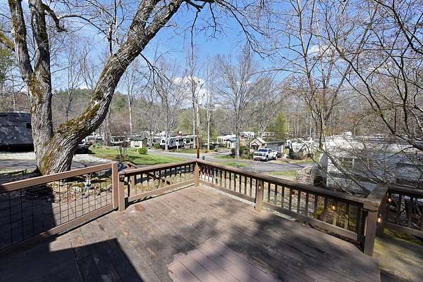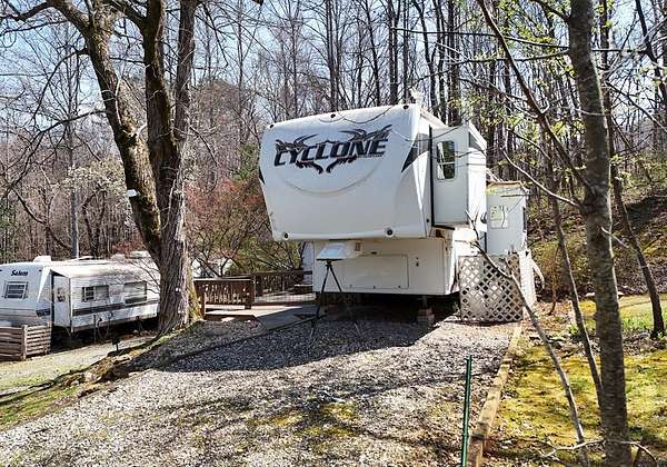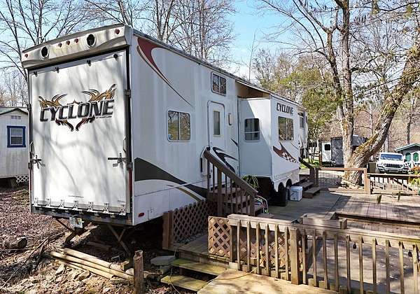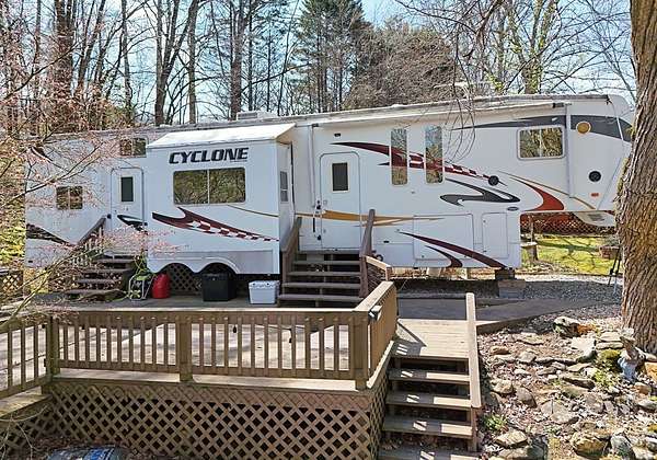 Enjoy the North Georgia mountain lifestyle with this well maintained RV lot featuring a 2008 Cyclone by Heartland toy hauler. This setup offers a great combination of comfort and flexibility, making it perfect for weekend getaways or extended stays. The toy hauler has been well cared for and provides multiple sleeping options, including two queen beds that lower in the garage area, a loft in the main living space, a dinette that converts to a bed, and a private master bedroom. The property is set up for outdoor living with plenty of decking space to relax, entertain, and enjoy the peaceful surroundings. An outbuilding is also included, providing additional storage for tools, gear, or outdoor equipment. Located in a well kept RV park, owners and guests have access to a community bath house that includes washers and dryers for added convenience. The location is hard to beat, just a short drive to some of North Georgia's most popular destinations including Brasstown Bald, the Appalachian Trail, Vogel State Park, Helton Creek Falls, as well as the charming mountain towns of Hiawassee and Blairsville. This is an excellent opportunity to own a turn key mountain retreat with everything you need already in place.