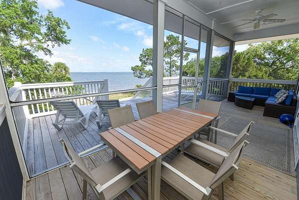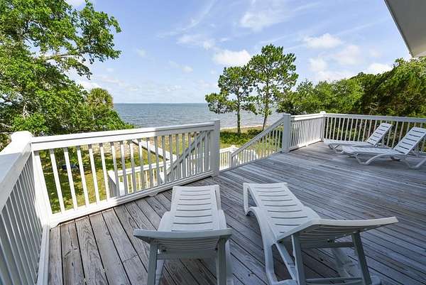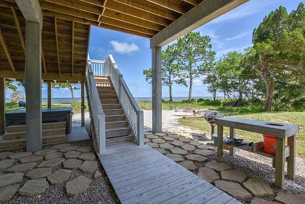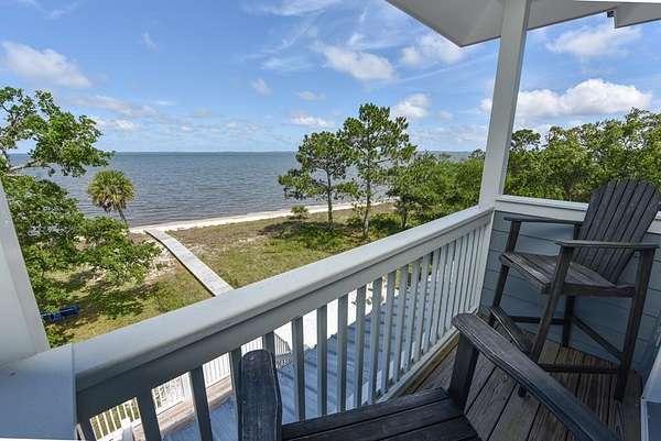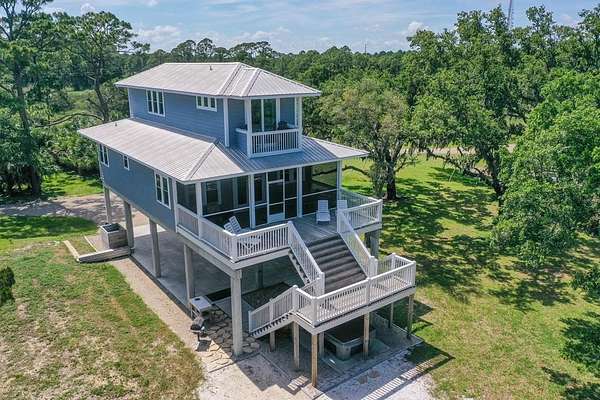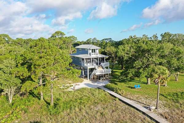 "Cat Point Hideaway". Secluded, well-maintained home resting on 2.5+ Acres of Old Florida Habitat. The property offers open view of Apalachicola Bay and abuts the Apalachicola National Estuarine Research Reserve--A nature enthusiast's dream come true! Just minutes from acclaimed St George Island beaches and charming downtown Apalachicola. Built in 2020, this 4BR/2.5BA home nestles serenely among majestic live oak and palmetto trees and indigenous vegetation. The modern kitchen/living/dining area opens to water view screened porch and open deck. Dine alfresco surrounded by sounds of water lapping and refreshing breezes. 2 BRs and 1.5 BAs reside on the main floor. A beautifully crafted wooden staircase suffused with natural light leads to a top floor BR with en-suite bath that opens to a private covered deck. Bask in the glow of breathtaking morning sunrise and glorious evening sunsets. A 4th BR , also on the top floor, overlooks a natural estuary and pond on the property. Outside amenities include a hot tub, outdoor shower, fish cleaning area, grill, fire pit and a hanging tree swing. A short stroll to the Eastpoint fishing pier. Cast your line into this fishery, productive for red fish, trout, flounder and sheepshead. Current zoning and density regulations may allow for the addition of a 2nd residence on this property. "Cat Point Hideway" is a popular vacation rental offered fully furnished and turn key ready.