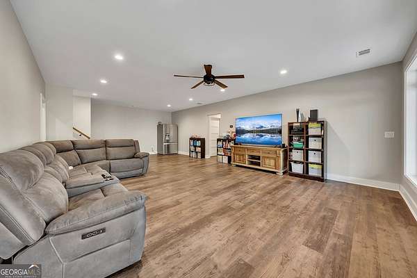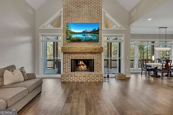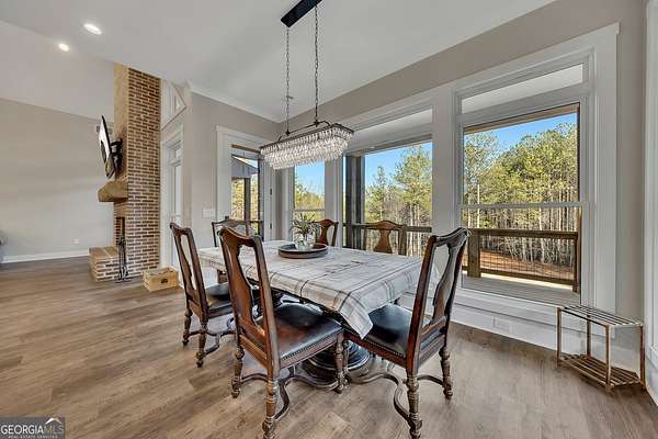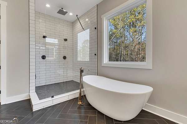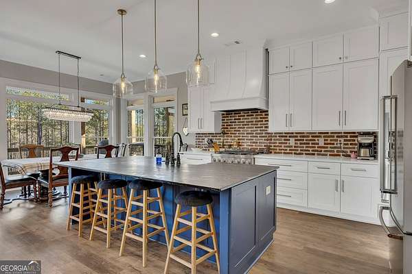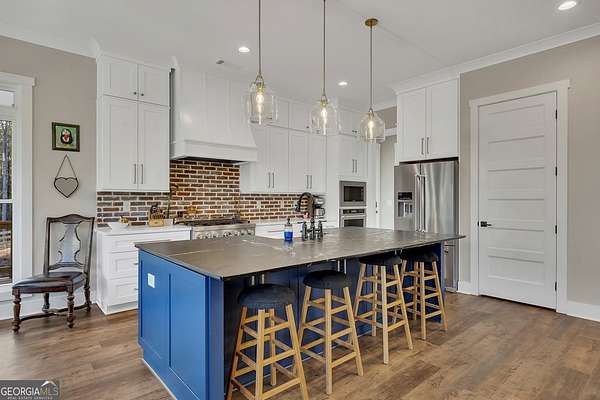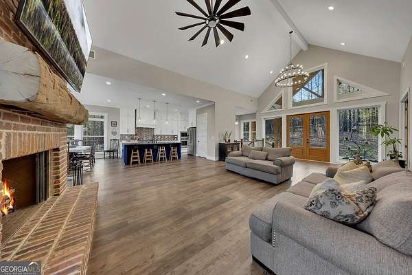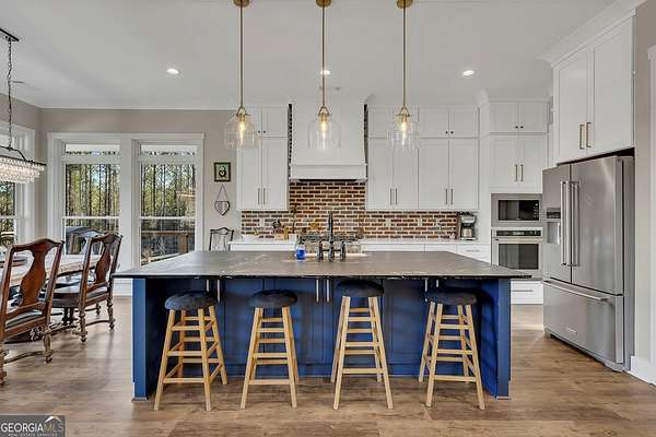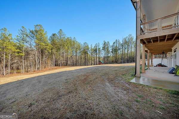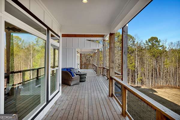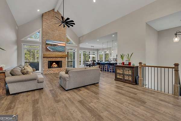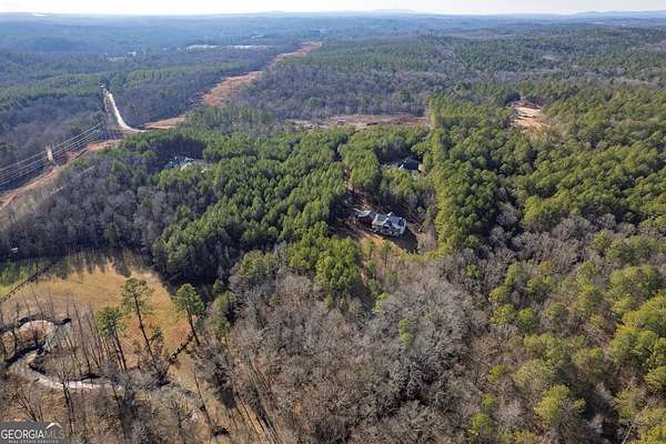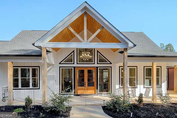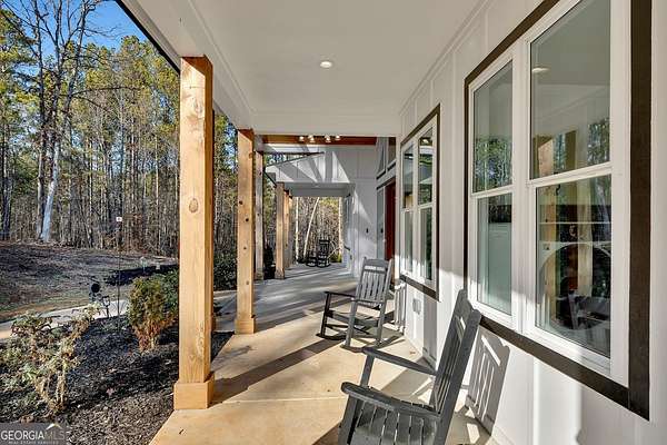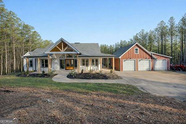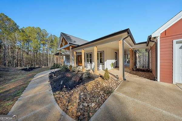 Welcome home to this gorgeous, nearly brand-new custom-built modern farmhouse ranch, perfectly situated on 12 breathtaking acres with a flowing creek and gated private entrance, just 6 minutes from charming Downtown Ball Ground. Located in the highly sought-after Ball Ground/Creekland/Creekview school districts, this exceptional property offers the perfect blend of luxury, privacy, and convenience. Set back from the main road for ultimate seclusion, this over 4,000 square foot home features a wrap-around porch and a classic red barn-style detached 3-car garage connected by a covered breezeway. Inside, you'll be greeted by stunning 10' glass French front doors, soaring vaulted ceilings, abundant natural light, and 8' interior doors throughout the main level. The expansive open-concept floor plan showcases luxury vinyl flooring throughout, a beautiful brick wood-burning fireplace in the family room, and a chef's kitchen complete with white cabinetry, stainless steel appliances, brick backsplash, and an impressive 105" x 58" soapstone island with breakfast bar. The eat-in kitchen and dining area overlook the serene backyard and provide access to the oversized back deck-perfect for entertaining and enjoying the peaceful views. The main-level primary suite is a true retreat, featuring a tray ceiling, abundant windows, private access to the back deck, and a spa-like en-suite bathroom with double quartz vanities, frameless LED lighted mirrors, elegant sconces, a freestanding soaking tub, and a massive tiled walk-in shower with dual shower heads and bench. A spacious walk-in closet completes the suite. Additional main-level features include a private office/study with glass French doors, a beautifully designed laundry room with mosaic ceramic tile, mop sink, and exterior access to the covered breezeway, plus an adorable half bath with pedestal sink and designer tile. The fully finished terrace level offers exceptional flexibility for multigenerational living, homeschooling, or guests. This level includes a large secondary living area, a dedicated craft/homeschool room with built-in desks and sconces, three additional bedrooms (one with an en-suite bath), a shared full bathroom with double vanities and subway-tiled shower, and a second laundry room with exterior access. Outdoor living is just as impressive, with expansive acreage, a picturesque creek, room to explore, garden, or bring your animals, and endless opportunities to enjoy country living with modern comforts. Additional bonuses include a tractor with all attachments and a playground-both included with the sale! This one-of-a-kind property offers luxury, land, privacy, and convenience-an absolute rare find in today's market.