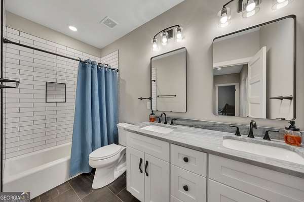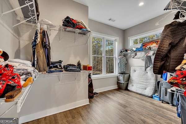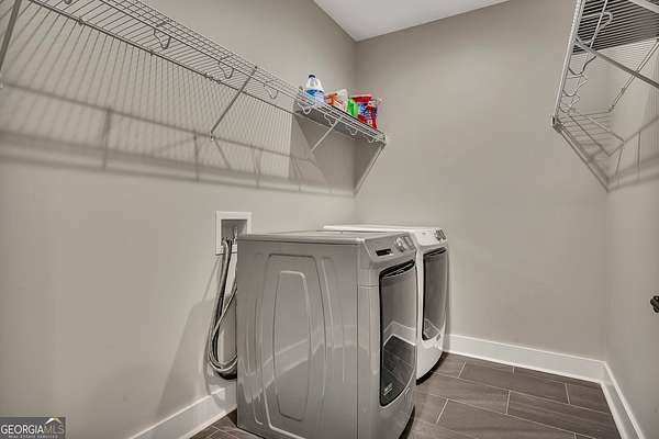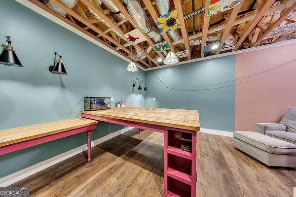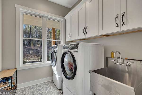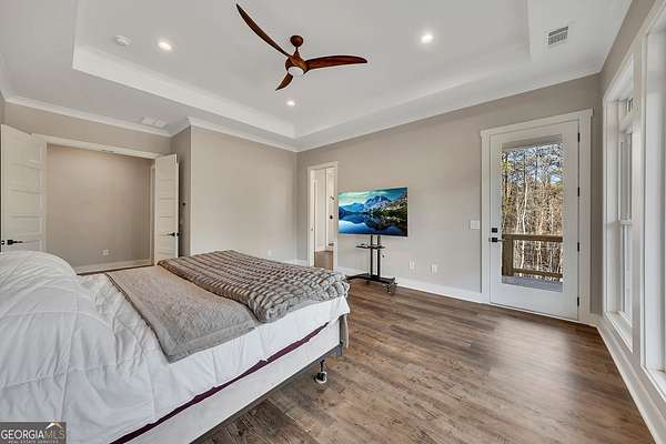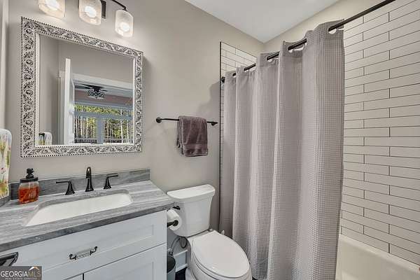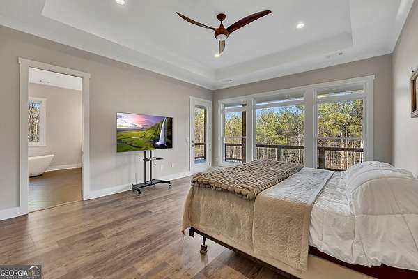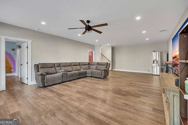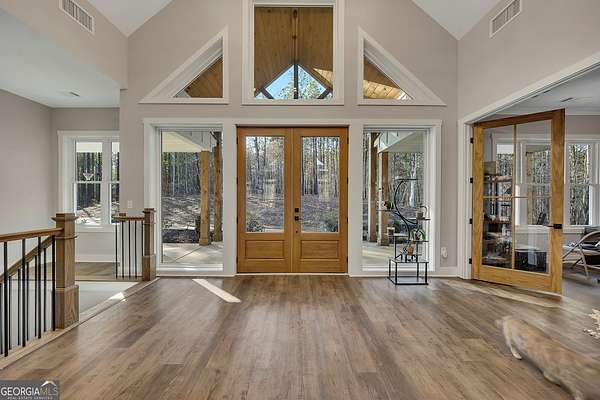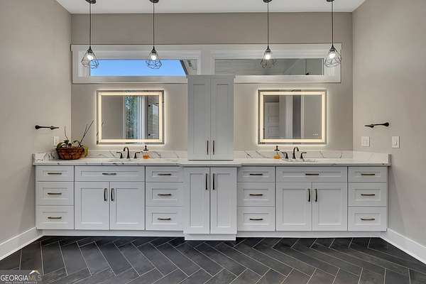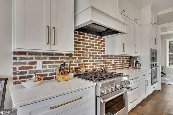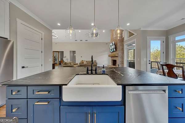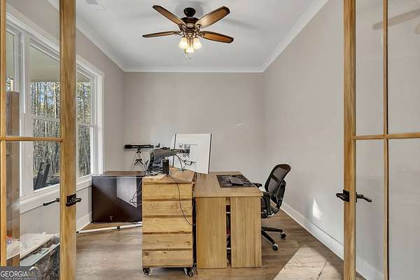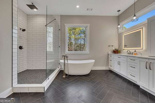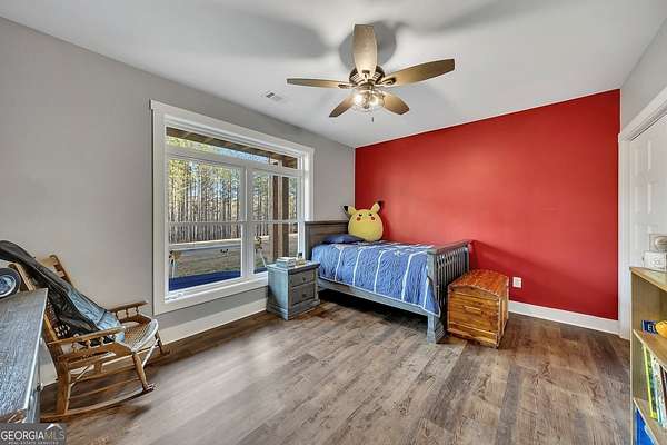 Welcome home to this gorgeous, nearly brand-new custom-built modern farmhouse ranch, perfectly situated on 12 breathtaking acres with a flowing creek and gated private entrance, just 6 minutes from charming Downtown Ball Ground. Located in the highly sought-after Ball Ground/Creekland/Creekview school districts, this exceptional property offers the perfect blend of luxury, privacy, and convenience. Set back from the main road for ultimate seclusion, this over 4,000 square foot home features a wrap-around porch and a classic red barn-style detached 3-car garage connected by a covered breezeway. Inside, you'll be greeted by stunning 10' glass French front doors, soaring vaulted ceilings, abundant natural light, and 8' interior doors throughout the main level. The expansive open-concept floor plan showcases luxury vinyl flooring throughout, a beautiful brick wood-burning fireplace in the family room, and a chef's kitchen complete with white cabinetry, stainless steel appliances, brick backsplash, and an impressive 105" x 58" soapstone island with breakfast bar. The eat-in kitchen and dining area overlook the serene backyard and provide access to the oversized back deck-perfect for entertaining and enjoying the peaceful views. The main-level primary suite is a true retreat, featuring a tray ceiling, abundant windows, private access to the back deck, and a spa-like en-suite bathroom with double quartz vanities, frameless LED lighted mirrors, elegant sconces, a freestanding soaking tub, and a massive tiled walk-in shower with dual shower heads and bench. A spacious walk-in closet completes the suite. Additional main-level features include a private office/study with glass French doors, a beautifully designed laundry room with mosaic ceramic tile, mop sink, and exterior access to the covered breezeway, plus an adorable half bath with pedestal sink and designer tile. The fully finished terrace level offers exceptional flexibility for multigenerational living, homeschooling, or guests. This level includes a large secondary living area, a dedicated craft/homeschool room with built-in desks and sconces, three additional bedrooms (one with an en-suite bath), a shared full bathroom with double vanities and subway-tiled shower, and a second laundry room with exterior access. Outdoor living is just as impressive, with expansive acreage, a picturesque creek, room to explore, garden, or bring your animals, and endless opportunities to enjoy country living with modern comforts. Additional bonuses include a tractor with all attachments and a playground-both included with the sale! This one-of-a-kind property offers luxury, land, privacy, and convenience-an absolute rare find in today's market.