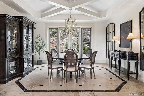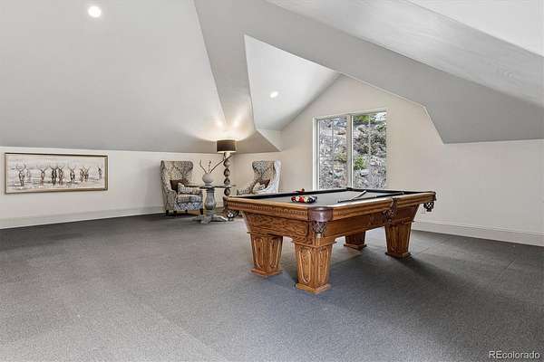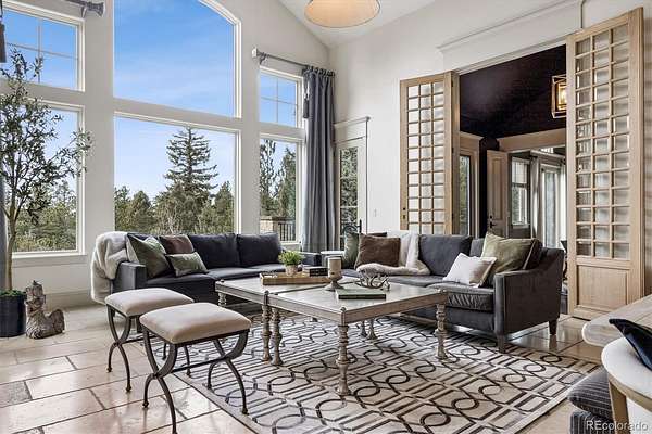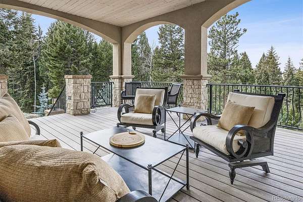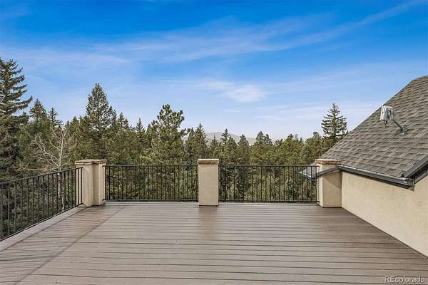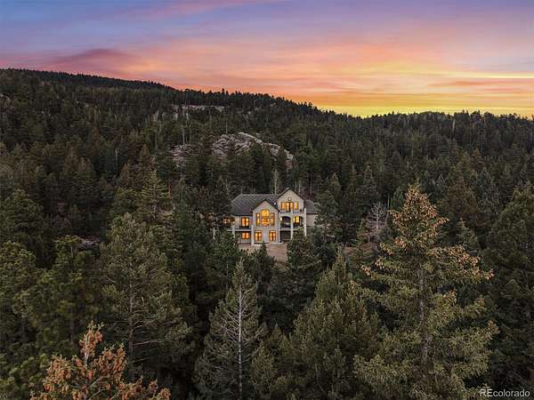 Set on 7.14 private acres within the gated community of Evergreen Springs Ranch, this exceptional mountain residence offers a rare blend of privacy, protected surroundings, and sweeping unobstructed views of Mount Blue Sky. Backing directly to a protected 250-acre Mountain Park, the home enjoys a setting where mature pines, open sky, and preserved land create a true Colorado retreat. Inside, dramatic vaulted ceilings and floor-to-ceiling windows frame breathtaking mountain views, while a striking indoor-outdoor fireplace anchors the main living area. The chef’s kitchen is equally suited for entertaining and daily life, featuring leathered granite countertops, premium Thermador appliances, dual dishwashers, and an adjacent wet bar, creating a natural gathering place at the heart of the home. The main level primary suite offers direct access to a west-facing balcony overlooking the mountains, complemented by a spa-inspired bath with dual vanities, dual walk-in closets with a washer-dryer hookup, a jetted soaking tub, and an oversized steam shower. The lower level adds versatility with a spacious family room, wine room and wet bar, guest suites with en-suite baths, and a flexible office or fitness space. The home was thoughtfully designed to accommodate a future one-bedroom apartment, offering potential for guest quarters, multigenerational living, or a handicap accessible suite. A residential elevator provides access to both the main and upper levels directly from the garage, allowing you to pull your car right up to the interior entry and move easily between floors. Located just 10 minutes from downtown Evergreen and Evergreen Lake, with easy access to Golden, Red Rocks, and downtown Denver, this home offers the rare opportunity to live immersed in Colorado’s natural beauty without sacrificing convenience.