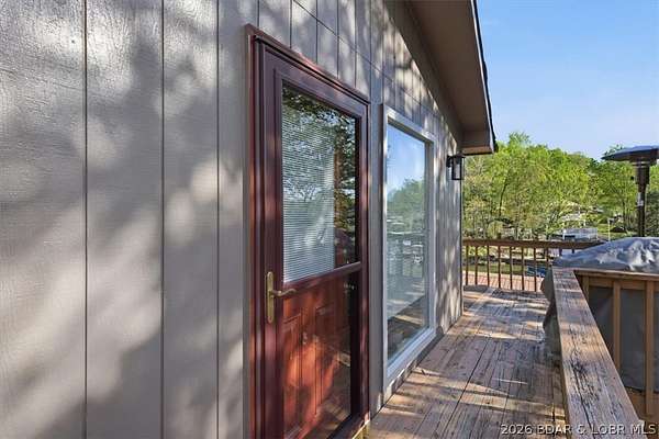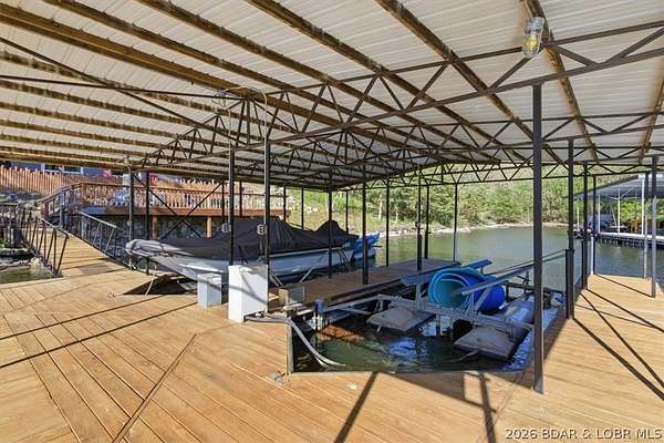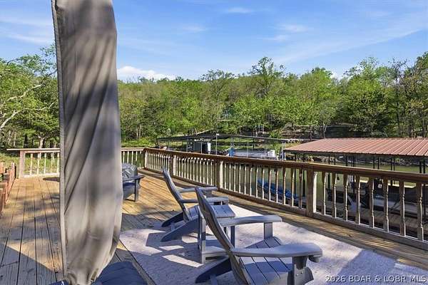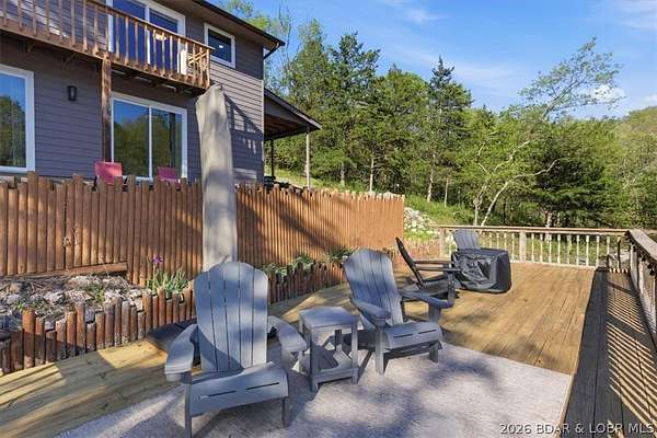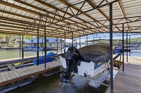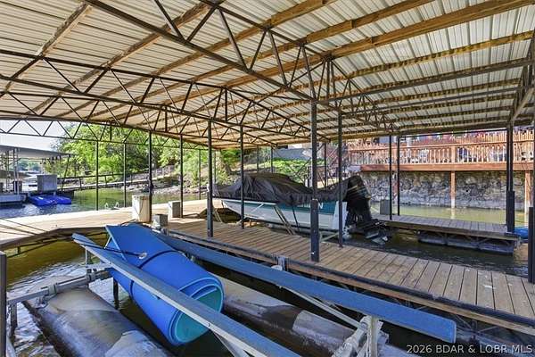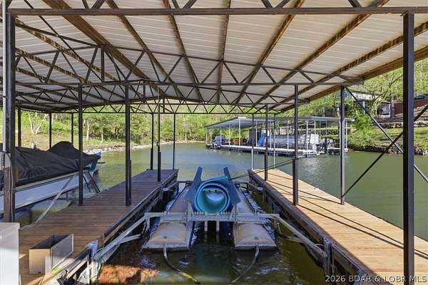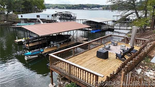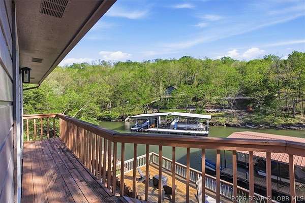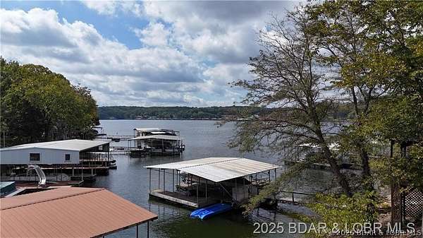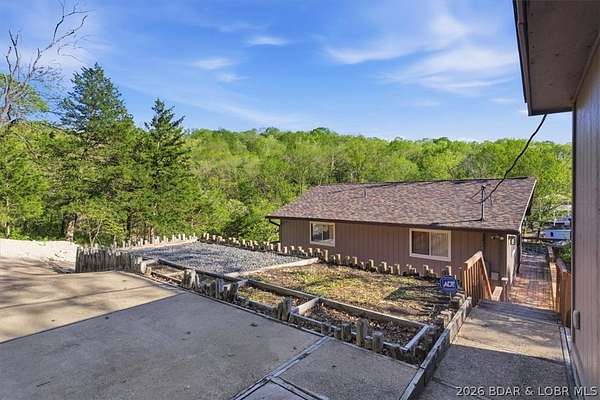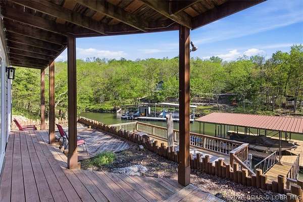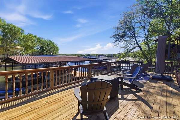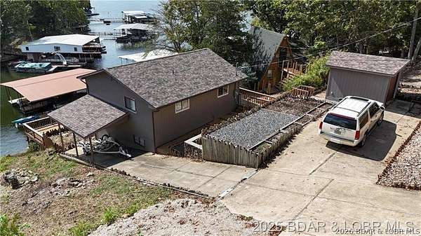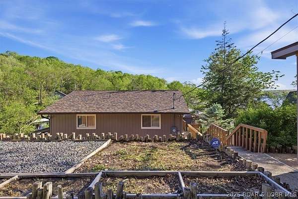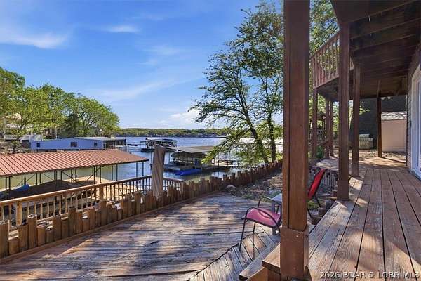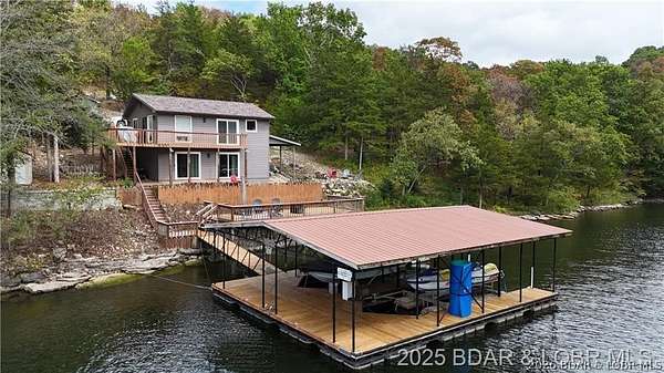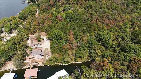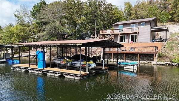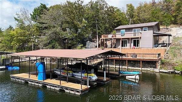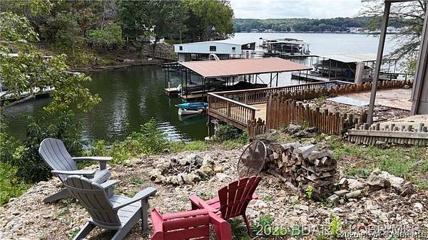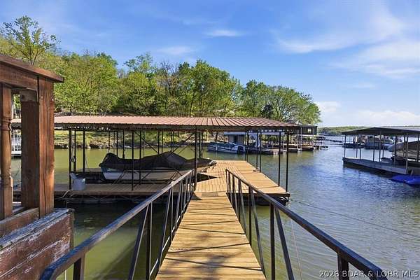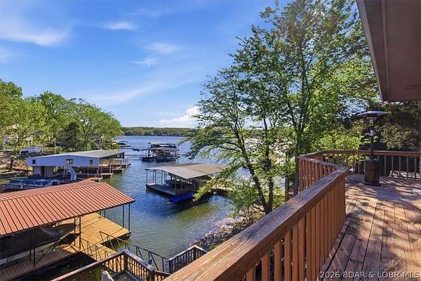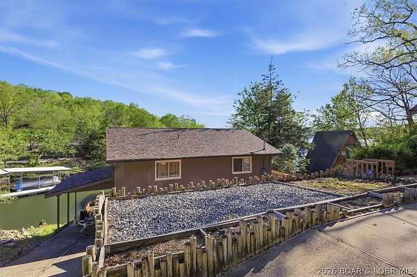 Endless possibilities await with this 3 bed, 2 bath lakefront retreat set on 4.7 acres with an incredible 240 feet of shoreline. Tucked in a deep water cove on the Gravois Arm, you'll enjoy calm waters paired with easy access to popular waterfront spots like Coconuts, Jolly Rogers, and Mermaid Cove. The main level offers an open concept layout filled with natural light and stunning lake views, featuring new LVP flooring, updated windows and sliding glass doors, and a modern kitchen with updated cabinets, countertops and appliances. Two spacious bedrooms and an updated full bath complete this level. The walkout lower level is built for entertaining with a huge family room, additional bedroom, full bath, and laundry/utility room. Step outside to the lakeside deck with fire pit-perfect for relaxing evenings overlooking the water. The 2-well dock with lifts and swim platform makes lake days easy, and a small garage provides the perfect space for a golf cart, side-by-side, or additional storage. With ample parking and acreage offering room to expand, this property is ideal as a private getaway, full-time home, or income-producing rental.
