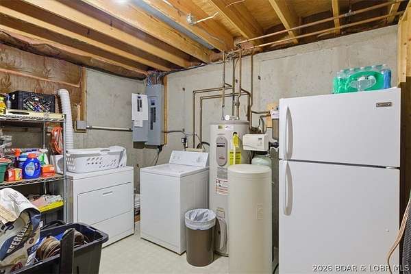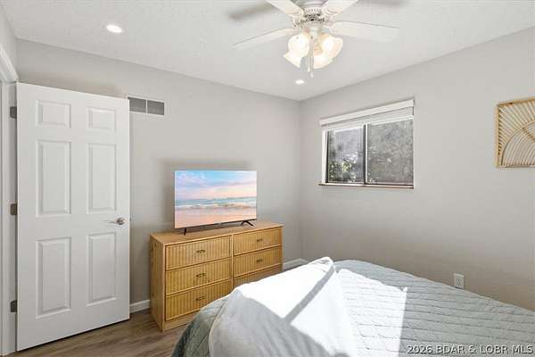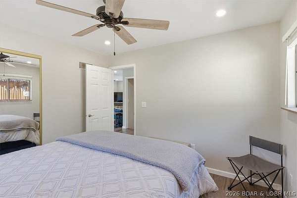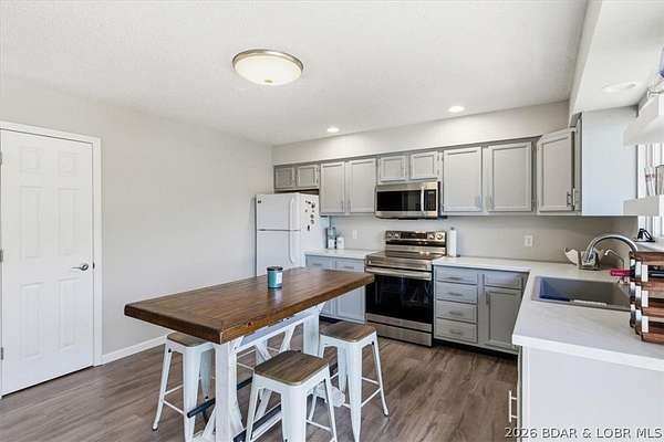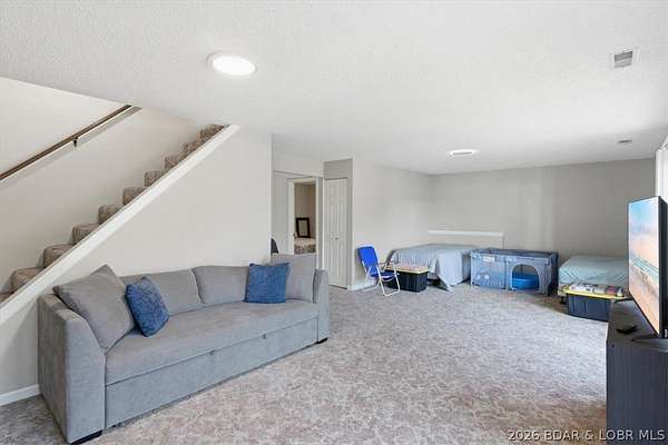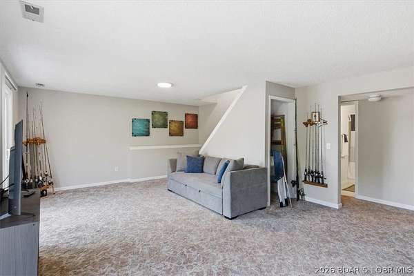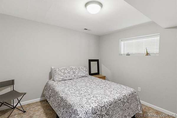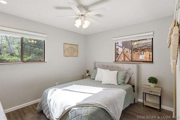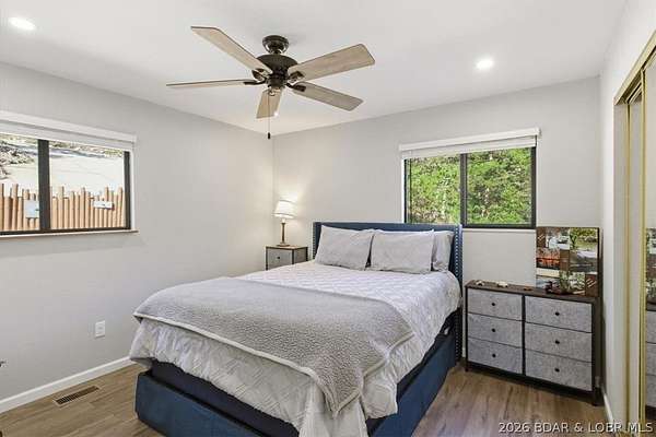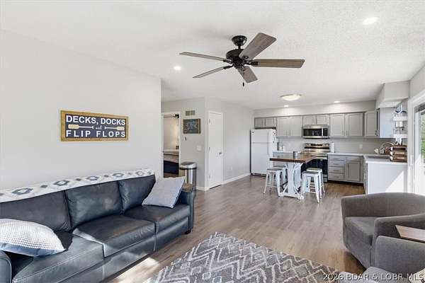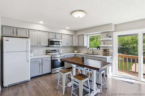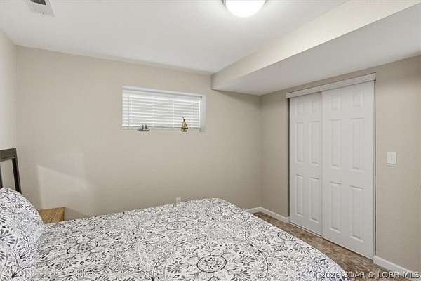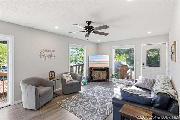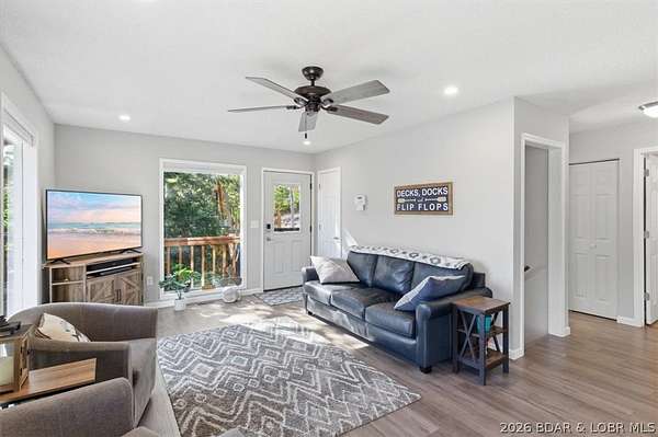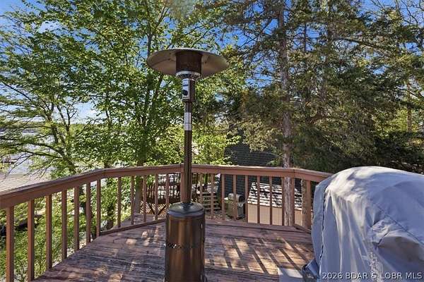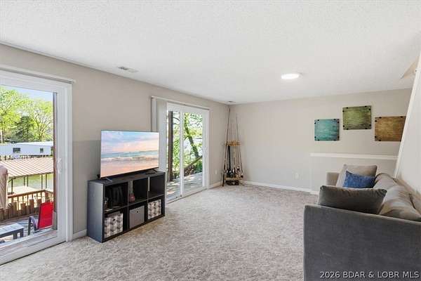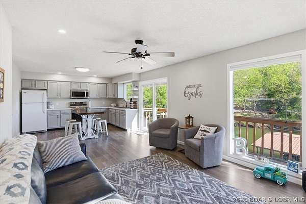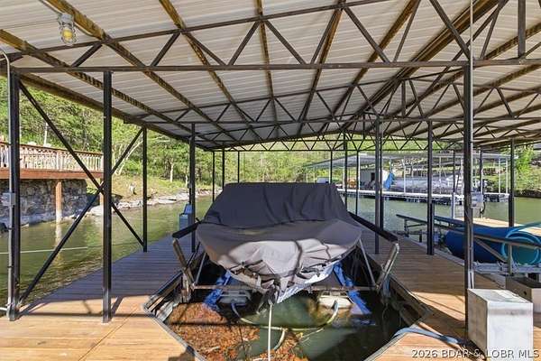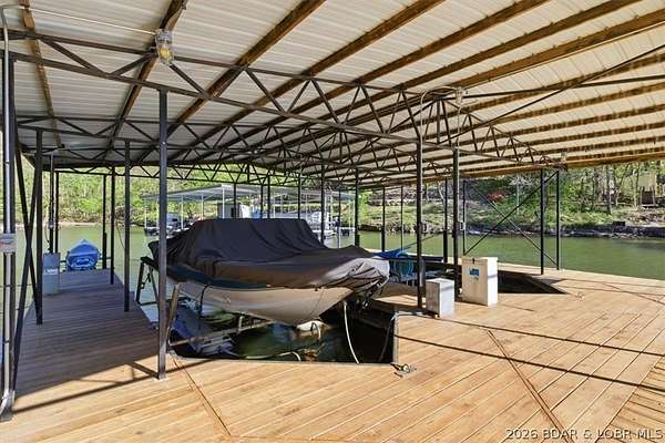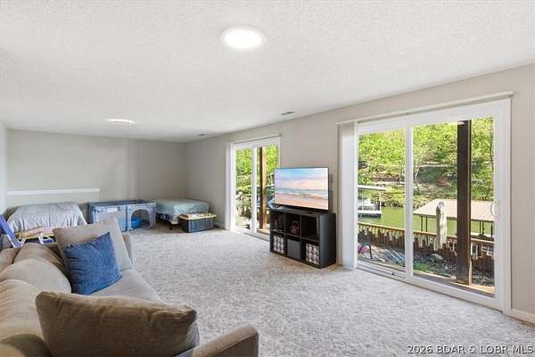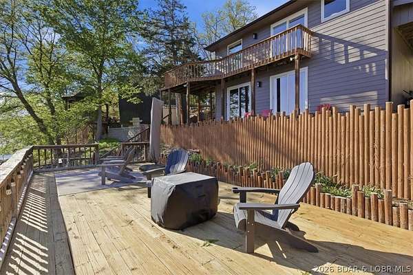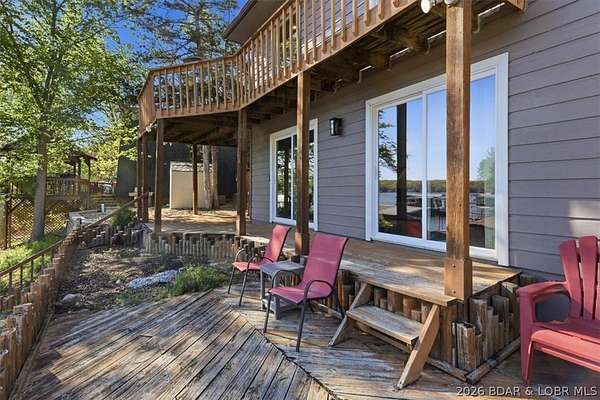Endless possibilities await with this 3 bed, 2 bath lakefront retreat set on 4.7 acres with an incredible 240 feet of shoreline. Tucked in a deep water cove on the Gravois Arm, you'll enjoy calm waters paired with easy access to popular waterfront spots like Coconuts, Jolly Rogers, and Mermaid Cove. The main level offers an open concept layout filled with natural light and stunning lake views, featuring new LVP flooring, updated windows and sliding glass doors, and a modern kitchen with updated cabinets, countertops and appliances. Two spacious bedrooms and an updated full bath complete this level. The walkout lower level is built for entertaining with a huge family room, additional bedroom, full bath, and laundry/utility room. Step outside to the lakeside deck with fire pit-perfect for relaxing evenings overlooking the water. The 2-well dock with lifts and swim platform makes lake days easy, and a small garage provides the perfect space for a golf cart, side-by-side, or additional storage. With ample parking and acreage offering room to expand, this property is ideal as a private getaway, full-time home, or income-producing rental.