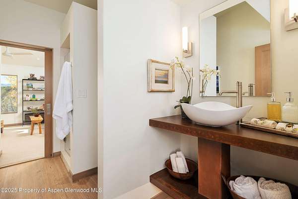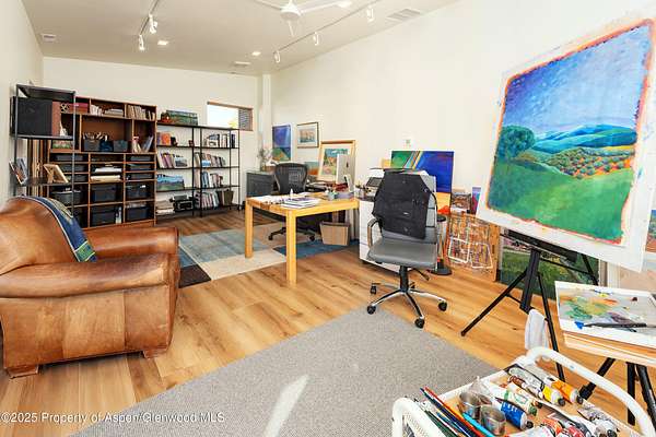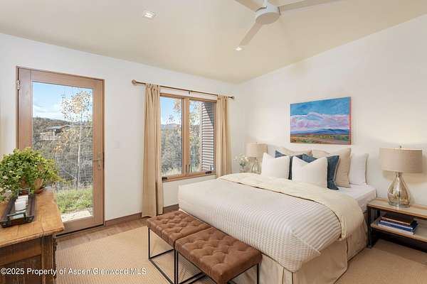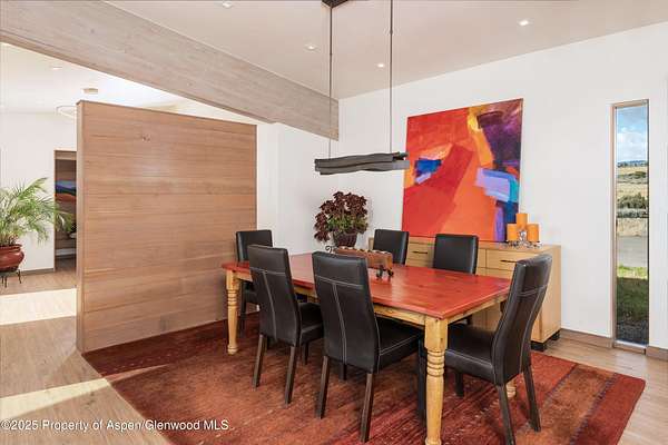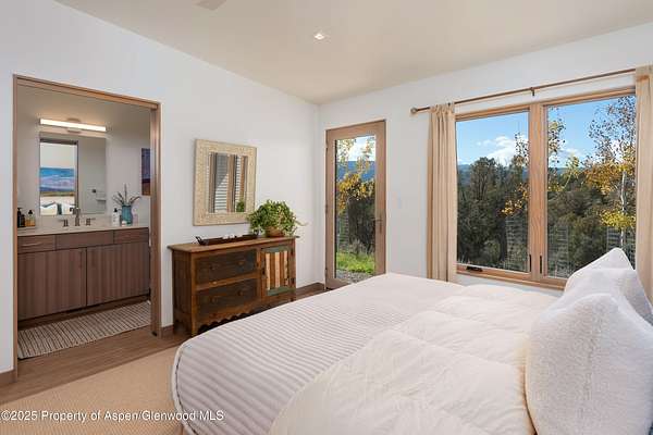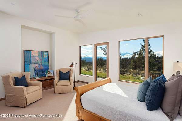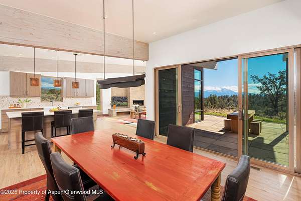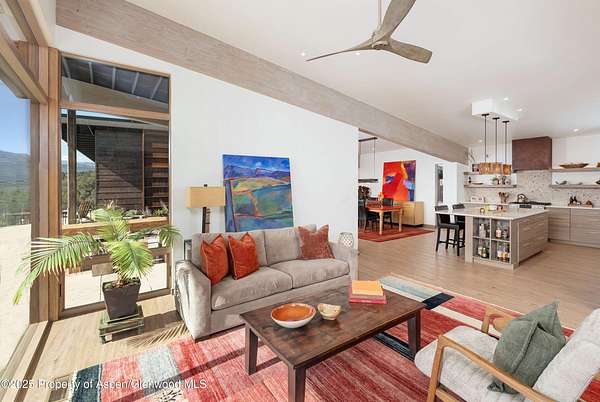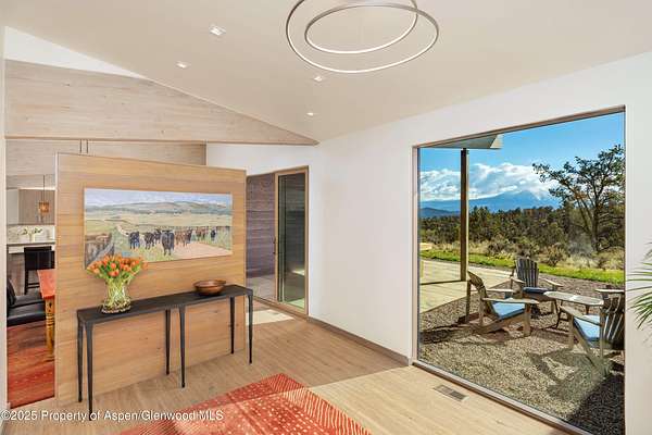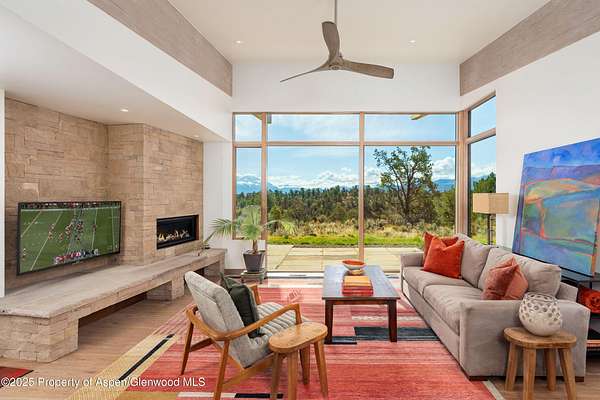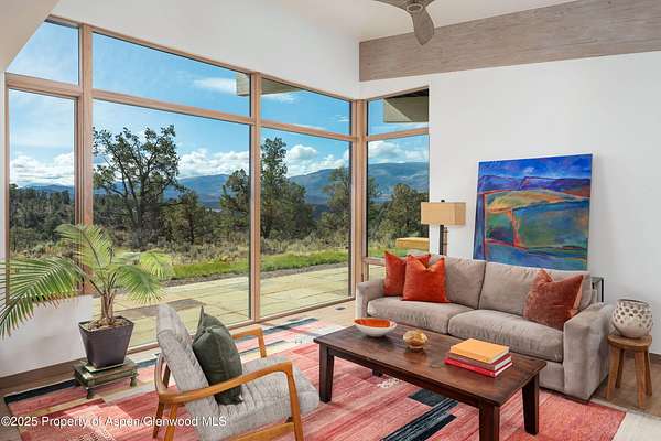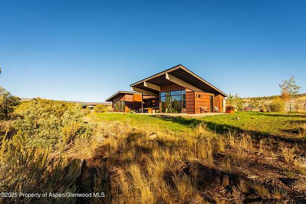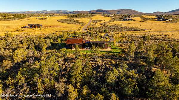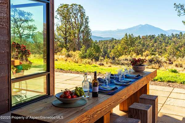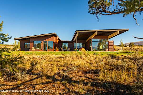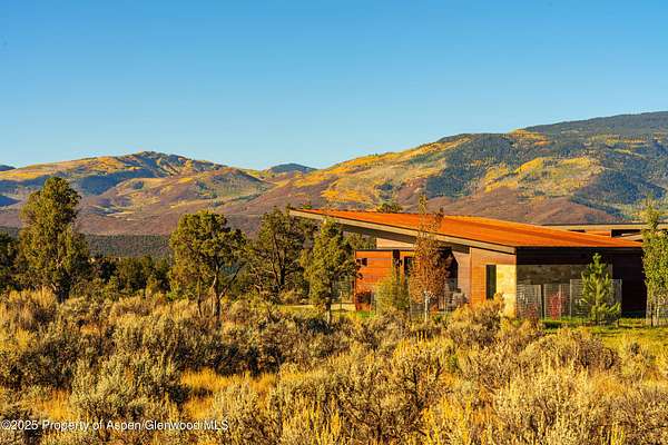 Experience a sculptural home crafted with a Zen sensibility by an award winning Aspen architect. This single-level residence on just under three acres seamlessly melds interior and exterior spaces, with panoramic views in every direction. The home features refined forms, subtle complexities and rich textures throughout, creating a tranquil inspiring environment. Inspired by the western mountain landscape, its modern design embraces timeless materials-warm wood cabinetry, doors, and trim, complimented by stone accents. The home's layout separates public spaces from private with three bedrooms, single level accessibility, and a secluded art studio that offers versatility as a guest suite, workspace, or fitness area. It is an energy-efficient design with passive solar heating and low-maintenance exterior materials including stone and rusted steel siding. The outdoor living spaces are protected from prevailing winds, offering private retreats for relaxing or entertaining. Carefully crafted to follow the land's contours, the home captures sun, views, and daylight in perfect harmony. The home features four climate zones for year-round comfort, wired for an electric car charger and hot tub, and a crawlspace allowing for future modifications. With water-resistant vinyl flooring, easy-clean wool carpets, LED lighting throughout, and strategically placed windows to maximize natural light, this residence offers harmonious blend of art, architecture, and nature-a truly exceptional home designed for modern living and future growth.