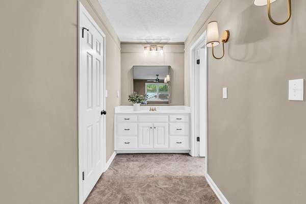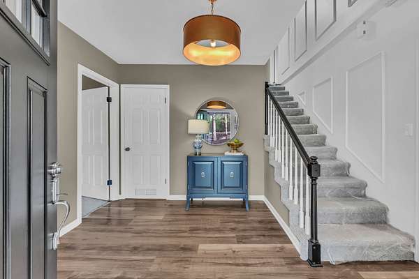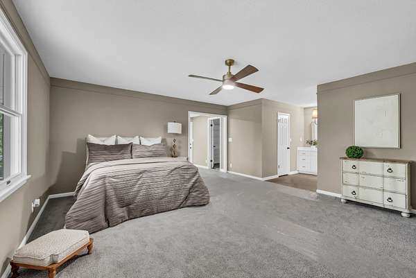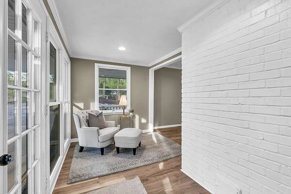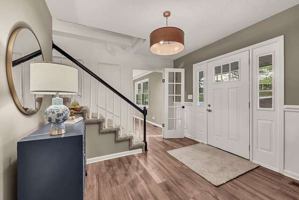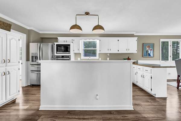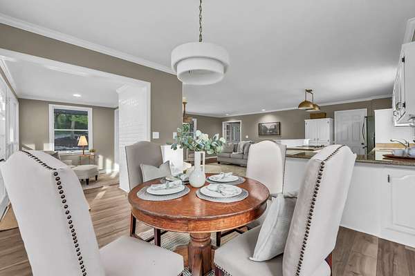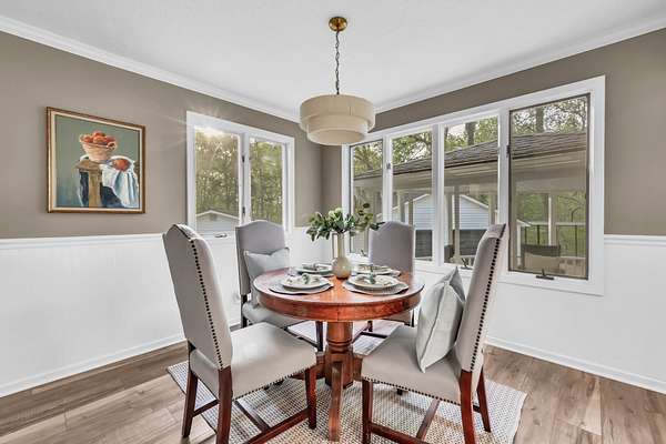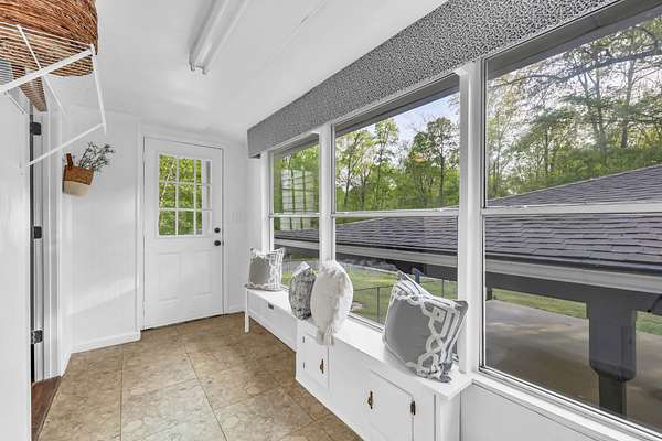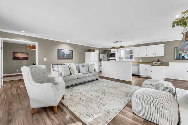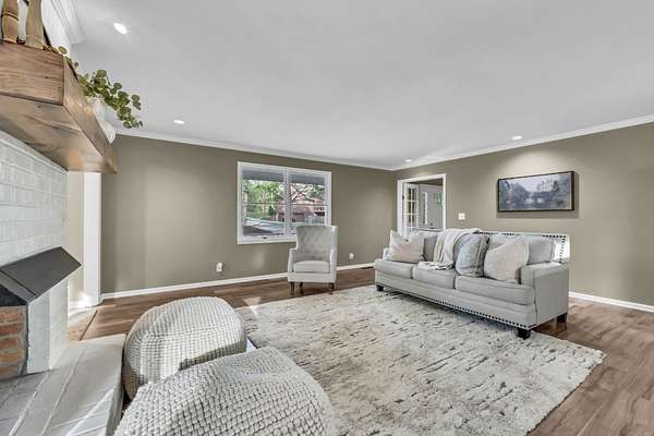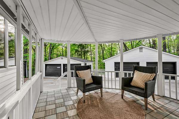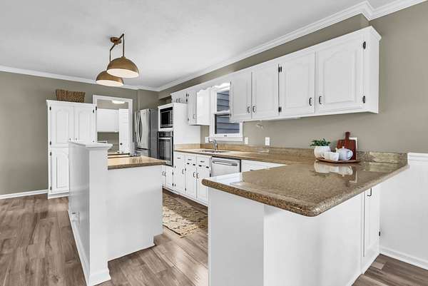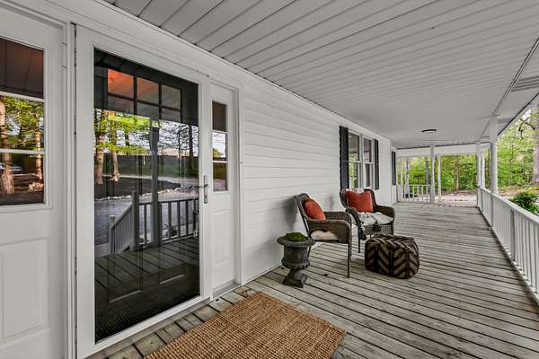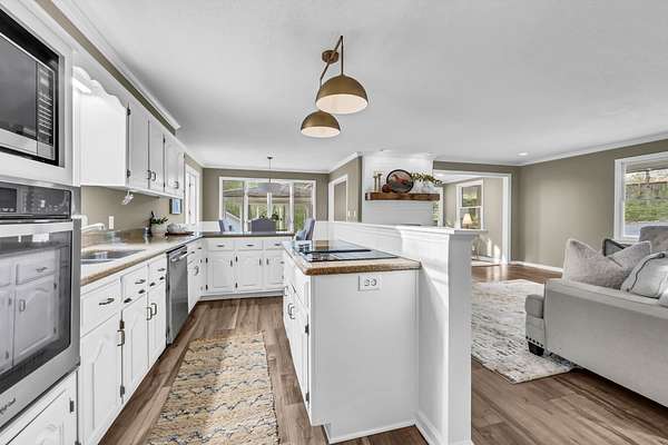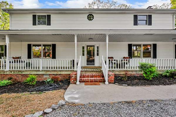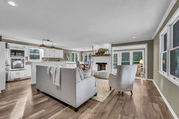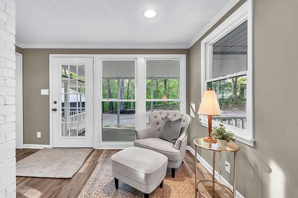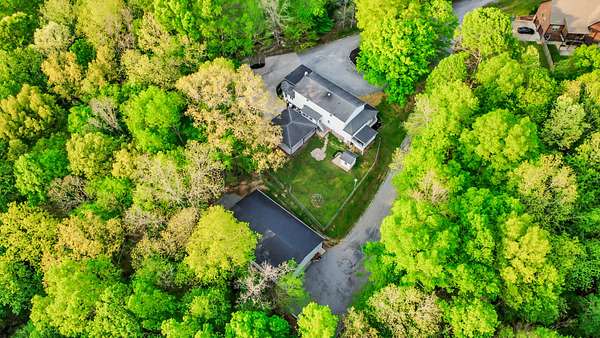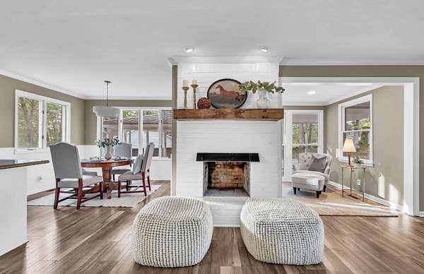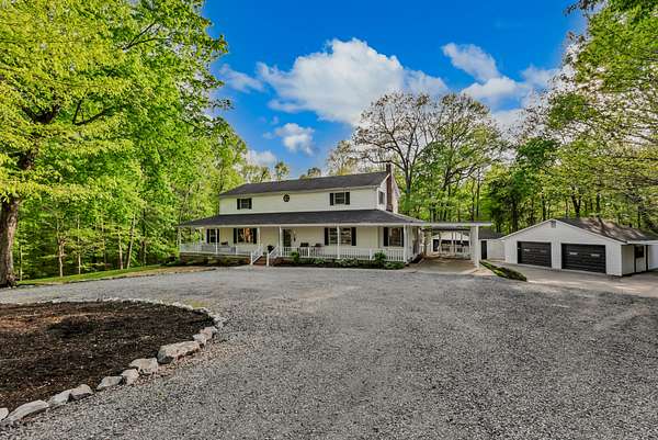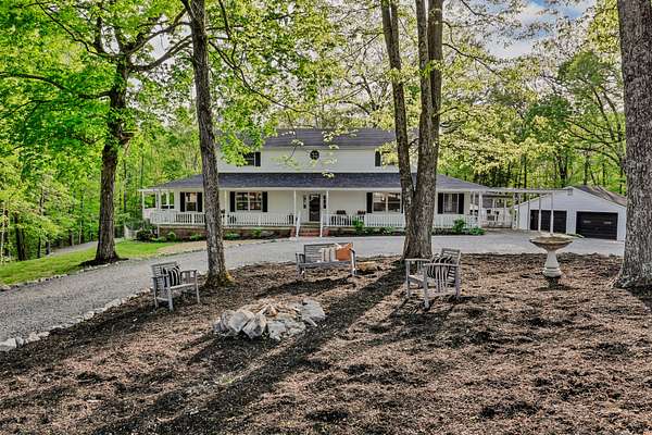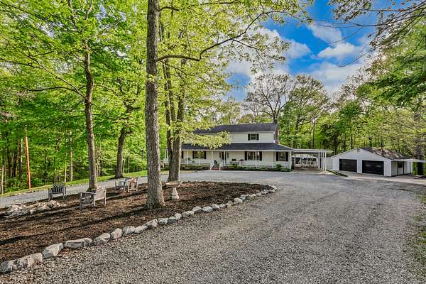 Tucked into the heart of Sango on just under 3 private, wooded acres, this property offers a rare combination of space, functionality, and convenience—just minutes from everything Clarksville has to offer. Inside, the layout is thoughtfully designed with defined spaces that still flow seamlessly together. The living room is filled with natural light and anchored by a gas fireplace, connecting easily to the separate dining room, kitchen, and sitting area. The kitchen features granite countertops, JennAir range, wall oven, and a full suite of appliances, all positioned at the center of the home. Just off the main living space, the sitting room leads to a side porch with gazebo, creating the perfect spot to relax or entertain.