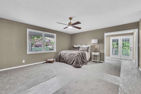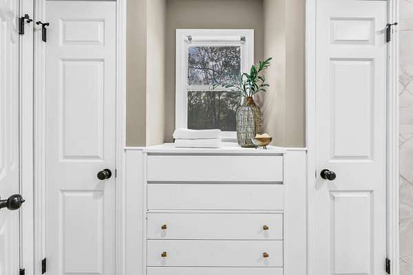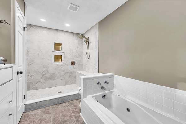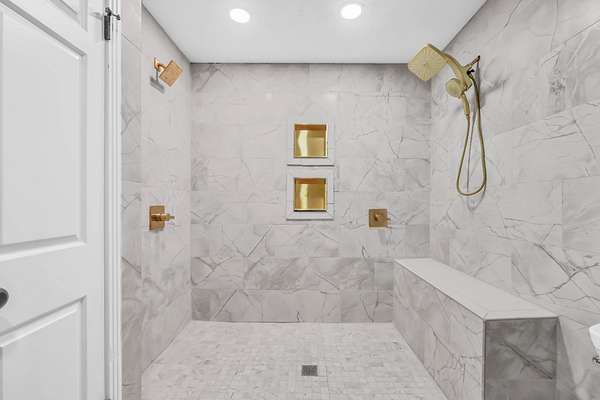 The primary suite is a true retreat, offering a spacious bedroom with an additional sitting area, private porch access with 2 year old spa, dual closets, and a beautifully updated bath with a large walk-in tile shower and separate soaking tub. Upstairs, a generous loft with parquet flooring is flanked by two oversized bedrooms, each with private baths and walk-in closets. A large laundry room, half bath, and mudroom with built-ins add everyday convenience and lead to the fenced portion of the backyard.