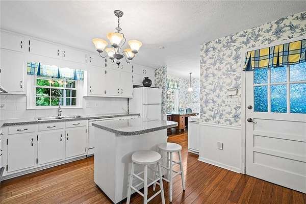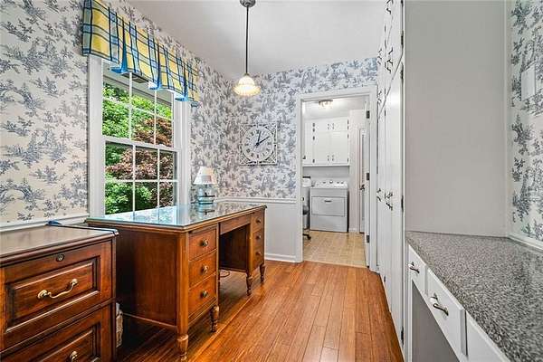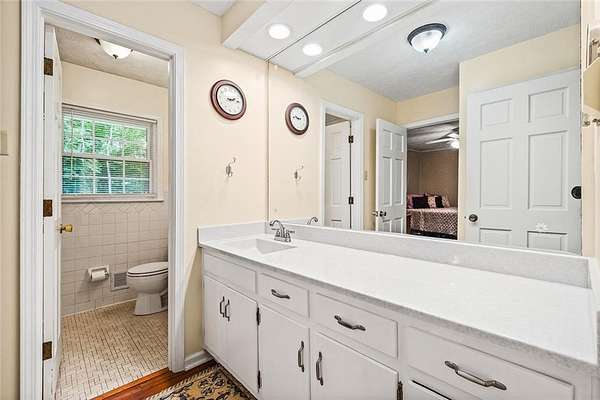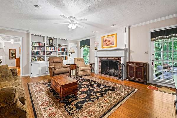 Welcome to this beautifully remodeled, four-sided brick ranch situated on a knoll within its own private sanctuary. The adjacent tract of land offers breathtaking views of a serene lake. The main level features spacious bedrooms, a screened-in porch overlooking a completely private lot, a den with a masonry fireplace, a kitchen island, a stainless double oven, a glass cooktop, and a new microwave, all accented by a slate entry. Enjoy stunning bamboo floors throughout, numerous built-in bookcases, a custom mantle with dentil molding, and custom trim work throughout the house. The finished basement includes an additional bedroom, a home office, a beautifully remodeled tile bath with a large walk-in shower (perfect for an in-law suite), and a huge kitchen with stainless steel appliances and granite countertops, opening up to a large living space with a masonry fireplace. The lower level also features a boat door. Outside, the beautifully landscaped grounds boast an impressive array of blooming plants and a creek, all set on 5.6 acres of total privacy. Located in a great area, close to the East-West Connector, shopping, and schools. Truly a rare find in Cobb County.