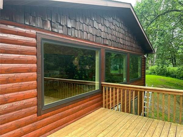 Fabulous lake home on an incredible lot—there is so much here to love! Log-sided and quintessentially charming from the moment you arrive, the home opens to a surprisingly spacious interior with an ideal lake-home layout. The main level features a large open great room with panoramic west-facing picture windows, a beautiful stone fireplace, massive center island, and warm solid-wood floors and ceilings throughout. The main floor also includes a private primary suite with luxury bath and a convenient powder room. The walkout lower level offers a spacious family room, three additional generously sized bedrooms, a full bath, and additional bath facilities in the utility room. Three parcels combine to create an exceptional setting with 177 feet of shoreline and 1.58 acres, offering a huge, level lakeside yard perfect for enjoying the water. An oversized two-car garage with additional storage below provides plenty of space for all your lake toys.