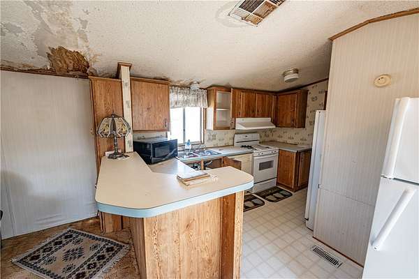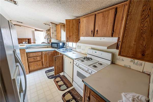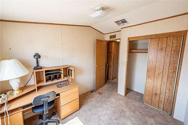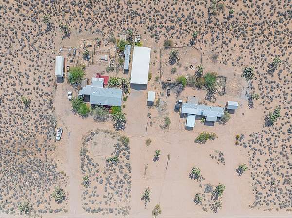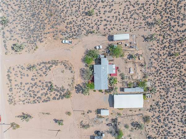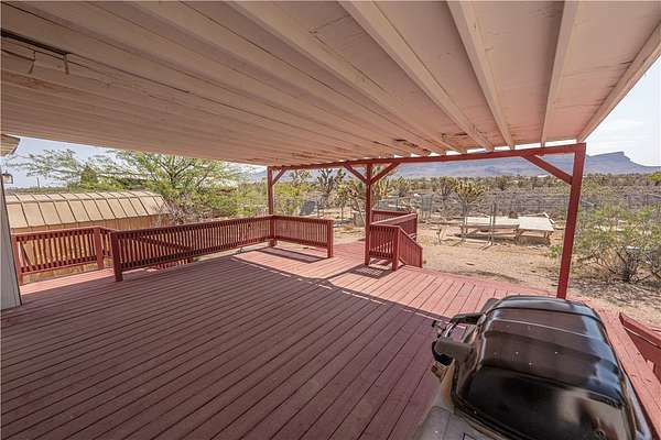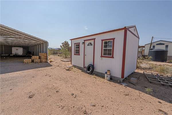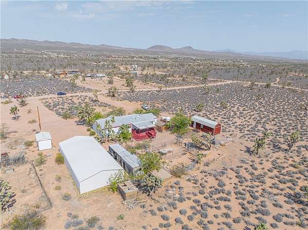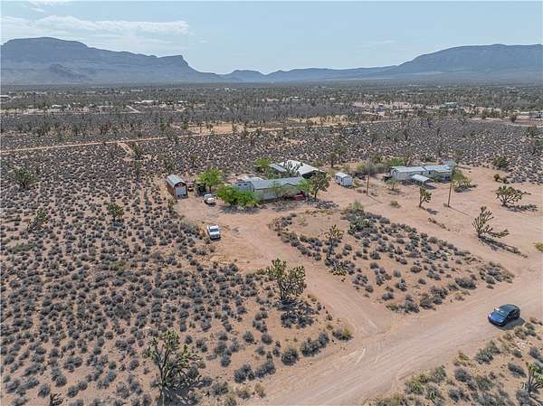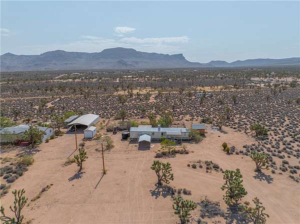 This 2.30-acre property offers plenty of room with two homes being sold together. The main home is stucco coated and has 3 beds/2 baths with a 1372 sq ft open floor plan. The kitchen has beautiful hickory cabinets, a large tile backsplash and an island with a pot/pan holder. Kitchen opens up to the casual dining room that leads into living room which is equipped with a wood burning stove for additional warmth and ambiance. The large pantry has plenty of shelves and is conveniently located in its own designated room off the kitchen. There are new luxury vinyl planks in the main living area and carpets in the bedrooms. Primary bedroom has upgraded walk in closet. Guest bedrooms are good sized and one could be used as an office with built in cabinets and shelves. Both bathrooms have been updated with tile floors, new vanities and mirrors. A separate laundry room has its own a/c and comes complete with a washer/dryer. The central air/heat system is new. There is a large covered deck that is perfect for entertaining and offers great views of the Grand Wash Cliffs. Also included is a detached 2 car garage, an enormous free-standing carport which fits multiple vehicles or toys, and an outbuilding complete with a/c and electric perfect for an office or craft area. Property includes several large dog pens that are fully fenced and horses are also allowed. The 2nd home on the property is a 3 bed/2 bath singlewide with 1050 sq ft. This home is fully functional with appliances that include a washer/dryer but does need some repairs to bring it up to its full potential. This home has a shed for additional storage. Lake Mead South Cove is about 25 minutes away for all your water sports.