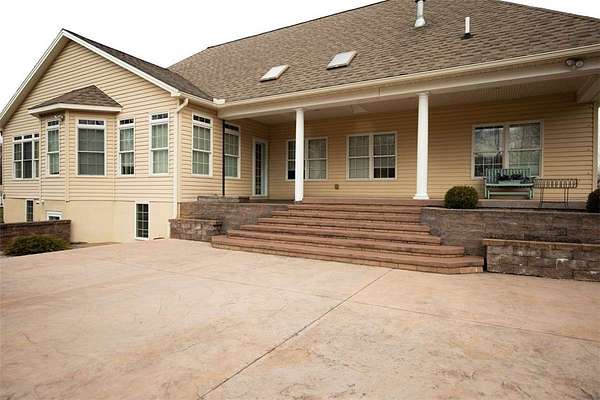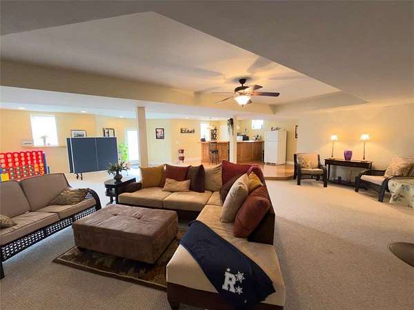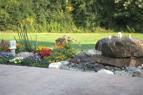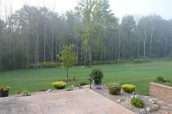 Welcome to this bright, beautiful contemporary ranch, located on three wooded acres at Bellaqua Estates, a quiet circle of homes south of Chili Center. Featuring an open-concept plan and shiny hardwood floors, the home greets visitors with a pillar-surrounded dining room, a great room with a raised custom ceiling, an inviting sitting room, and a bright breakfast nook, all around a large mediterranean-style kitchen. The kitchen includes a main island and a prep Island with granite countertops, double oven, and no less than 40 drawers and doors, accompanied by a walk-in pantry. The spacious primary bedroom suite, located on the west side of the home, features a huge bathroom with two person whirlpool and spacious walk-in closet. Two more bedrooms share a full bath on the east side of the home. The main floor is completed by an office with french doors overlooking the neighborhood pond, a half bath, and a laundry room. Before leaving the main level, marvel at a view of the property's two acres of virgin forest through large windows lining the back of the home. Or walk out on the veranda and step down to the massive patio, with a water fountain gushing from natural boulders. The lower level finished walkout includes a large recreation room, wet bar, full bath, and fourth bedroom, making a possible in-law apartment. The lower level is completed by a workout room with landscape mirror, and plenty of storage/utility space. The 2 1/2 car garage has a bump-out for longer vehicles, and a stairway leading to finished attic storage space. In addition to a whole-house water treatment system, outstanding features include high efficiency furnace, premium insulation, tankless water heater (2024) and fans in nearly every room, reducing energy costs throughout.