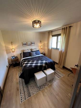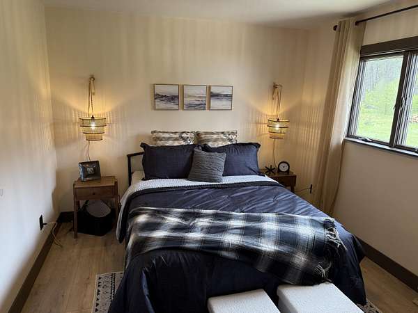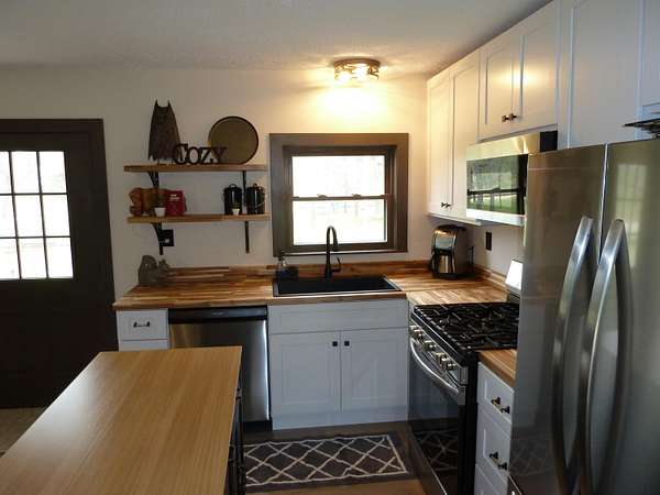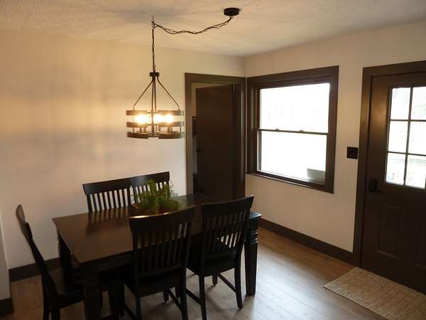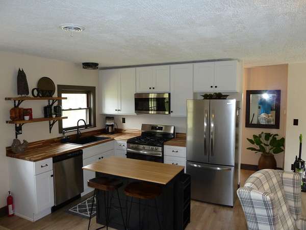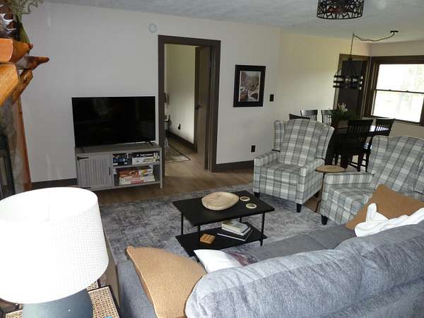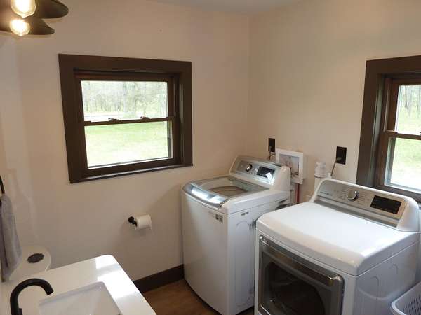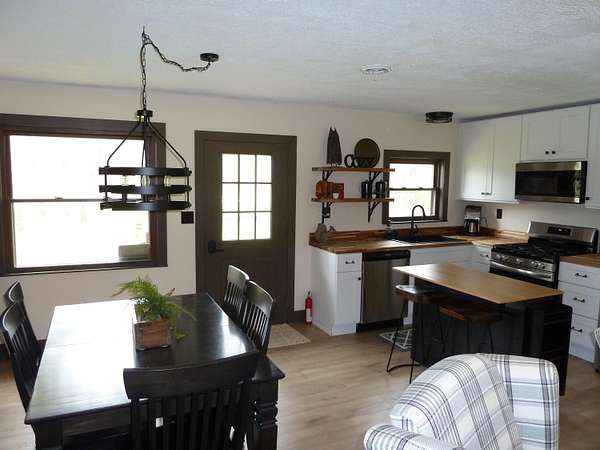 This home offers an open concept living room, dining area, and kitchen, perfect for entertaining and gathering with friends and family. Completely renovated in 2025, the property features all new finishes, including a new roof, plumbing and furnace with central air for year-round comfort. Situated on 8.05 acres, the property provides ample space for parking, turning around, and storing multiple trailers, making it ideal for recreational vehicles and outdoor toys. Outdoor living is enhanced by a large fire pit, perfect for entertaining and relaxing year-round. The home includes three bedrooms and two bathrooms. Bathroom #1 features a full bath with shower, single-sink vanity, and washer/dryer for added convenience. Bathroom #2 offers a spacious double-sink vanity. The thoughtfully designed, efficient kitchen provides everything needed to prepare meals, while a propane grill on the deck offers an excellent option for outdoor cooking.