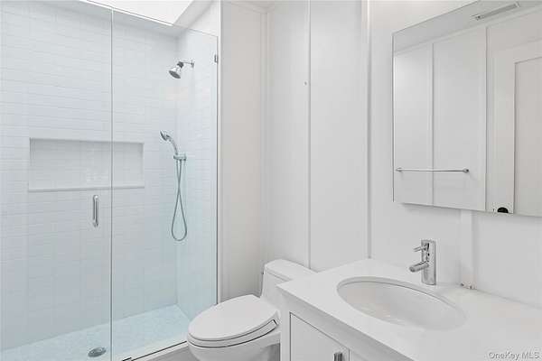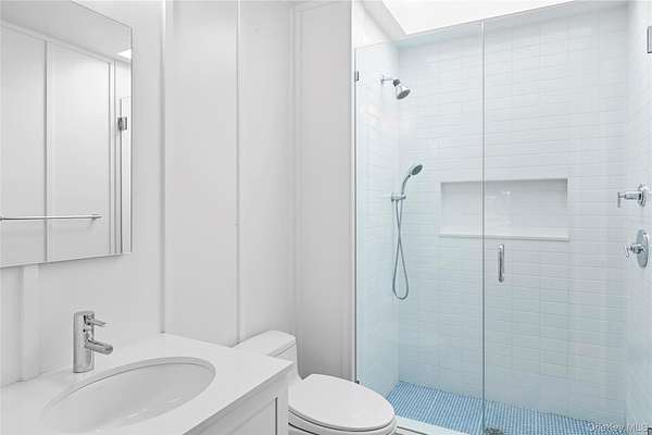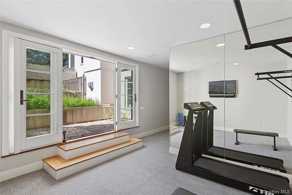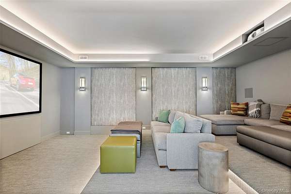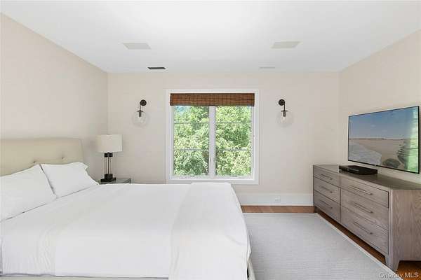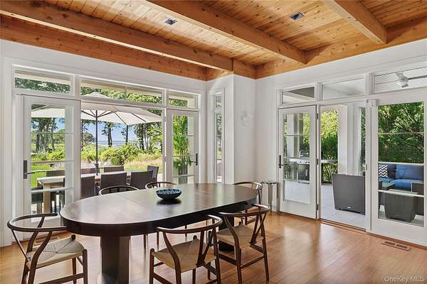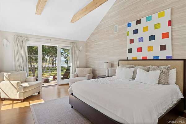 Set on the tranquil shores of Genet Creek, this modern waterfront residence in North Haven Point captures the essence of Hamptons luxury. Facing west for breathtaking sunsets and framed by 1.84 acres of privacy, the pristine 8,000+/- sq. ft. home-crafted by master builders Witty & Gazda-balances timeless elegance with modern comfort. From the moment you arrive, the approach sets the tone: a gated, curving pebbled drive lined with native grasses leads to a striking home nestled in a natural clearing. Through a gracious loggia entry, a dramatic architectural stair introduces interiors designed to maximize light, water views, and seamless indoor-outdoor living. The first floor flows effortlessly with 10-foot ceilings, walls of French doors, and expansive bluestone patios extending each room into the landscape. A sunlit living room with marble fireplace opens to the epicurean kitchen, outfitted with sleek Poliform Varenna cabinetry, Caesarstone and stainless countertops, Dornbracht fixtures, and a full suite of Sub-Zero and Miele professional appliances-including double dishwashers and ovens. An adjoining bar and buffet area enhances entertaining, while a cozy den with fireplace, spacious walk-in pantry, custom mudroom, and private office complete the level. Upstairs, the serene primary suite features a wood-burning fireplace, spa-like bath, and private balcony overlooking Shelter Island. Two en-suite guest rooms also enjoy water views, while two additional bedrooms share a full bath-one with its own terrace. A generous laundry with double Miele washers and dryers completes the floor. The 1,500+/- sq. ft. lower level offers every amenity: a sun-filled game room with gas fireplace and bar, tiered home theatre with 10' screen and projector, fully equipped gym, and full bath. Outdoors, multiple entertaining areas surround a 20' x 50' heated gunite pool with spa, masonry fire pit, and sweeping lawns that stretch toward dramatic western water views of Genet Creek, Noyac Bay, and Shelter Island. Sustainability meets luxury with a solar roof, geothermal air conditioning, and radiant heated floors-even in the two-car garage. Within North Haven Point, owners also enjoy quiet roads for walking or cycling, community tennis, and bay beach rights-all just minutes from Sag Harbor Village, Shelter Island, and world-class ocean beaches. This exceptional property is a rare offering: modern waterfront living at its finest, with every detail designed for comfort, beauty, and connection to the Hamptons' natural landscape.