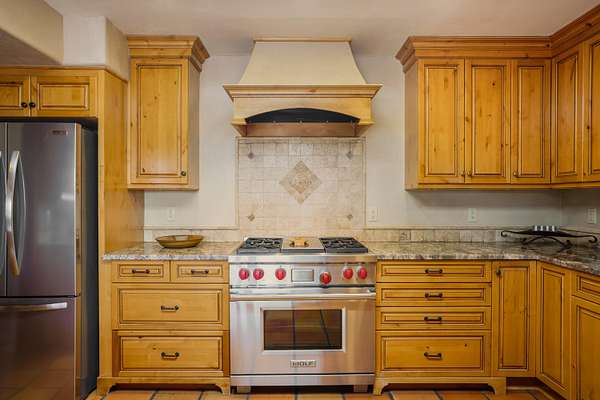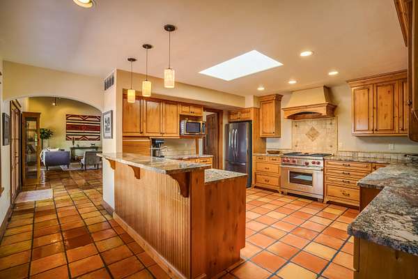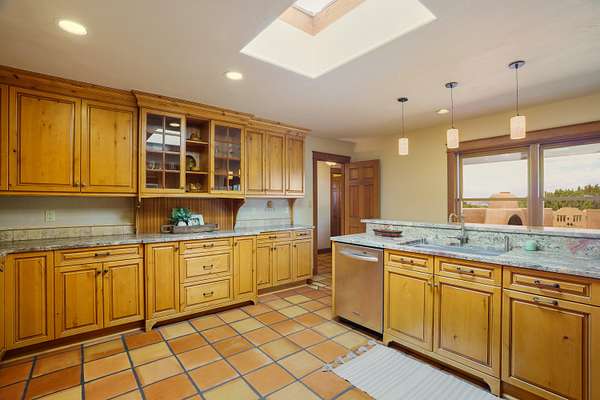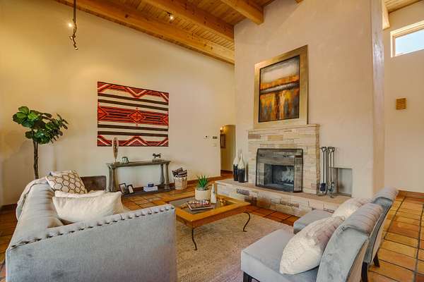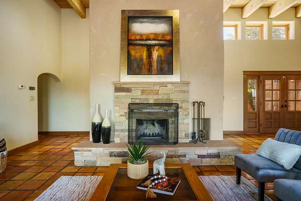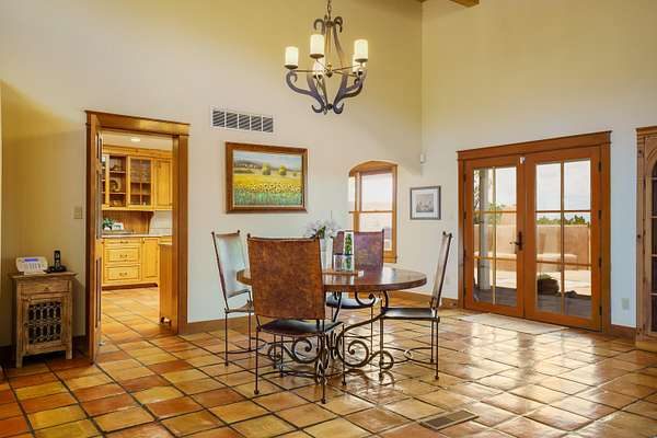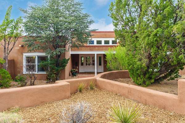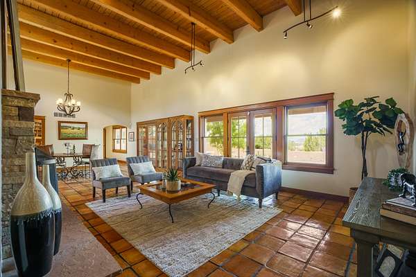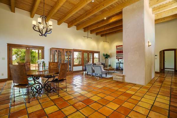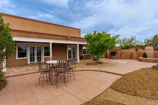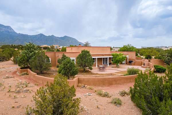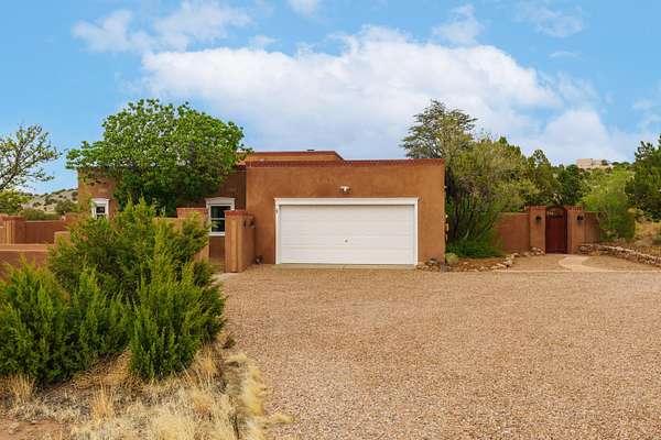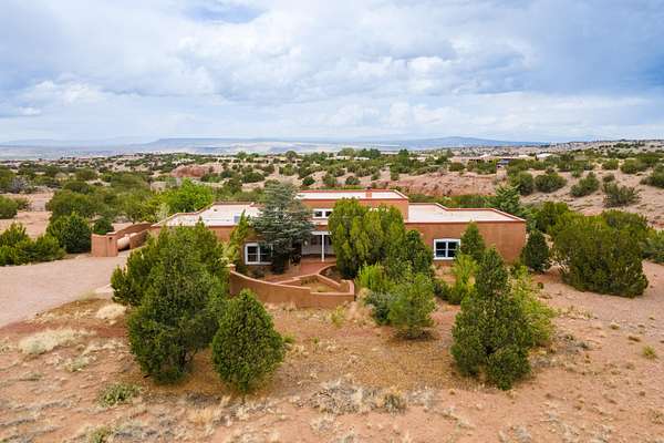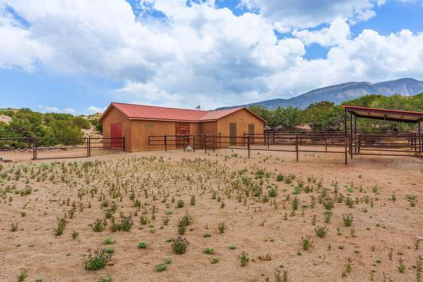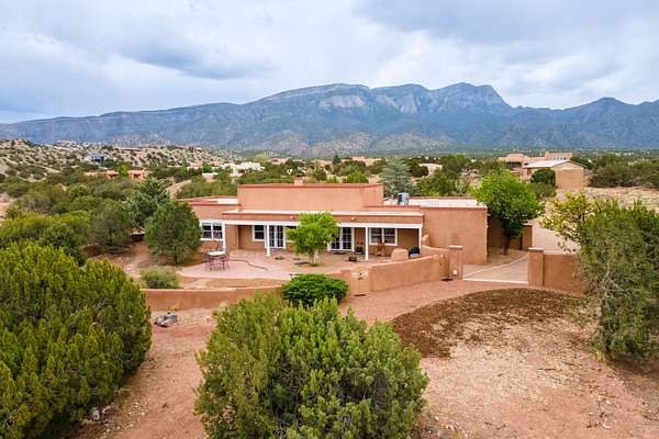 Beautiful New Mexico territorial style home on 4.37 acres in Placitas with stunning views from the front and back! Features include saltillo tile floors, a fully remodeled kitchen with granite countertops, top-tier appliances with Wolf range/oven and custom cabinetry. A large library/media room plus additional office space for hobbies or work from home. Large open living area with natural light and custom wood burning fireplace. Outside find a spacious tiled patio with a new built-in grill & outdoor kiva fireplace. Recent upgrades also include a new roof & fresh stucco & septic (2024). Horse-ready with a 3-stall barn with utilities, tack rooms, arena & turn out. Easy access to Cibola National forest & open space. Serene, private, and perfect for enjoying the best of NM living!