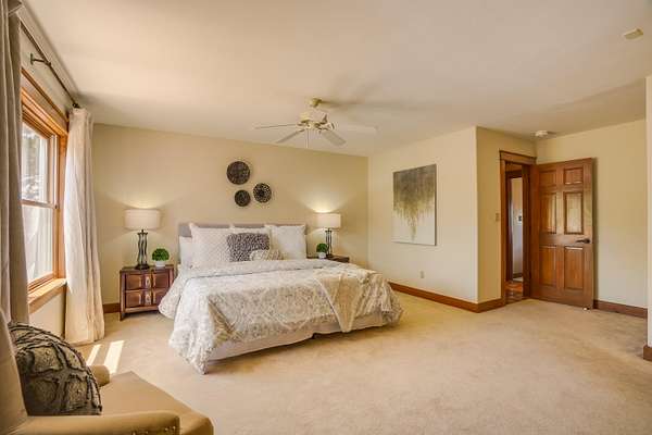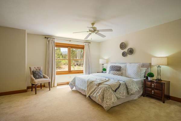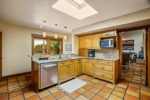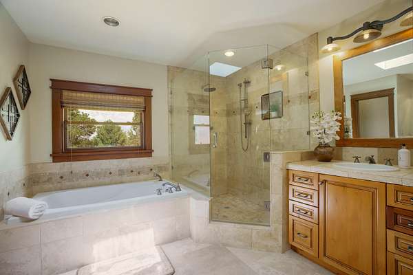 - Beamed Ceilings, Breakfast Bar, Ceiling Fans, Dual Sinks, High Ceilings, Home Office, Main Level Primary, Separate Shower, Skylights, Walk In Closets, Water Closets