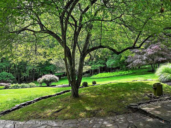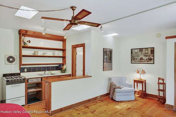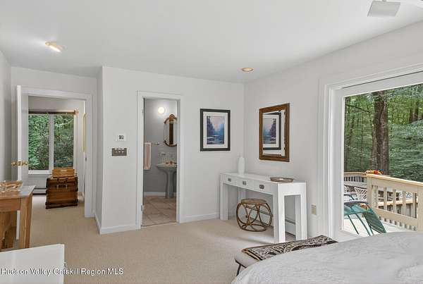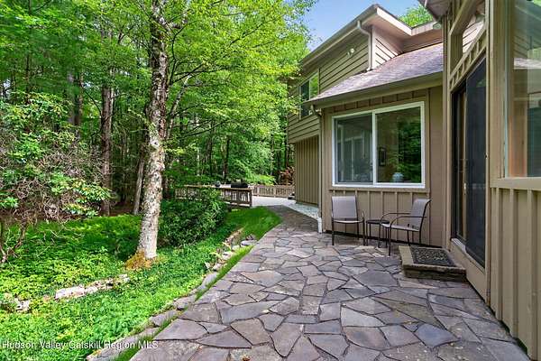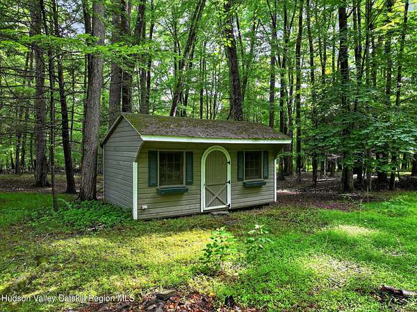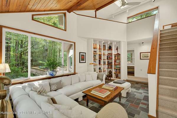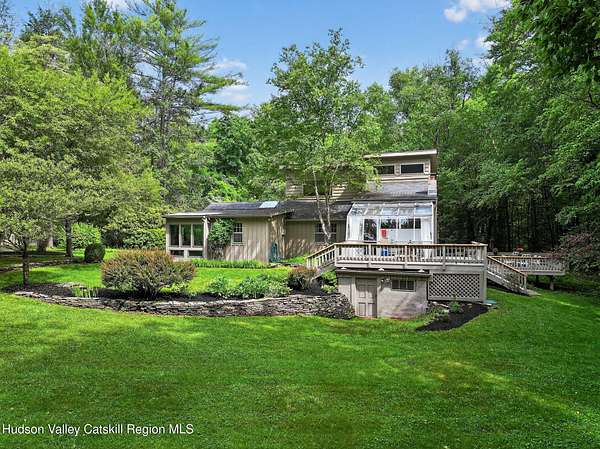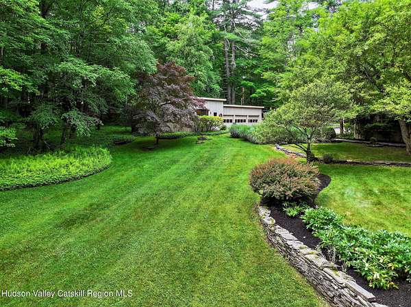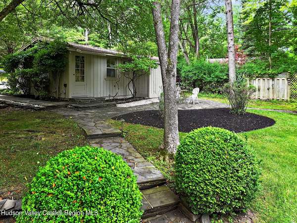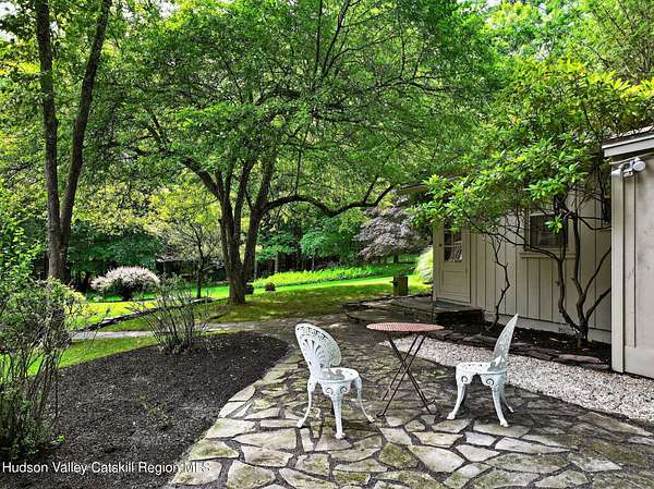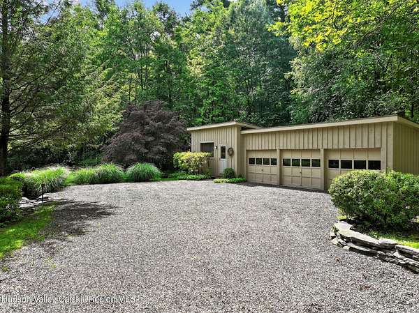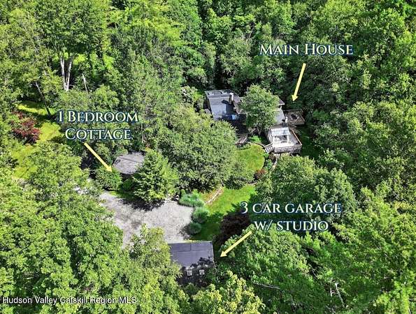 Just a half mile from the center of Woodstock, this bucolic 3.7-acre compound offers a rare blend of architectural charm, natural beauty, and versatile living. The property includes the main house and two outbuildings, a one-bedroom cottage and a studio with an attached three-bay garage. Bedroom and bath layout described as the primary residence having three bedrooms and three full baths measuring 2200 sq. ft. The detached cottage has one bedroom with one full bath measuring 480 sq.ft and the detached studio has another full bath measuring 400 sq ft. The main house is a light-filled classic Woodstock modern home built around the original Woodstock's artist's cabin. Thoughtfully designed to frame the surrounding forest through expansive glass sightlines, allowing for views of deer, birds, and other wildlife throughout the seasons. Inside, the home showcases unique historical details such as chestnut beams in the dining room, a bluestone fireplace, a built-in library, and a mix of slate, Spanish tile, pine, and oak flooring. The multi-level living area features a lofted tongue-and-groove wood ceiling and five architectural skylights that bring the outdoors in. Upon entry, you're greeted by a bright and inviting sunroom that opens into a formal foyer. Just off the foyer is a room that can serve as a home office, reading nook, or playroom, conveniently located next to a full guest bathroom. This level also features a cozy bedroom and a hallway office nook-perfect for remote work or quiet study. The eat-in kitchen includes a charming breakfast nook that offers serene views of the surrounding landscape and seamlessly flows into the dining room, creating a warm and inviting connection between the spaces. The dining area doubles as a music room, enhanced by vintage wide-plank pine flooring and a wood-burning fireplace that adds warmth and character. Step down into the sunken living room, where high ceilings and built-in bookshelves create a bright, welcoming space ideal for relaxing or entertaining. The primary suite features an en-suite bathroom with Parisian influences, including a bidet and a deep, one-person soaking tub with jacuzzi jets. Sliders walk out to the private multi-level deck and your own private atrium. Just off the main area, a newly designed mason-laid bluestone patio features a seamless transition into an expansive deck, offering the perfect setting for quiet evenings or vibrant dinner parties. The second floor features a loft area, ideal as a TV or family room, providing a comfortable space to relax or entertain. Tucked away for privacy, the second primary suite includes a full bath, creating a serene retreat separate from the main living areas. The one-bedroom cottage evokes the feel of an English guesthouse, with wood floors, a full kitchen and bathroom, and its own dedicated utilities, making it a wonderful space for guests or potential rental income. The detached studio, adjoining the three-car garage, feels like a New York City loft, complete with wide-plank floors, an open-concept layout, a bathroom, and a kitchenette. With its own electric and utilities, the space lends itself well to use as an office, yoga or art studio, or another income-producing rental. The garage offers three bays-two for vehicles and one ideal for workshop or storage use. For decades, this special property has been a gathering place for artists, musicians and writers. The home is designed to inspire and connect, all within minutes of Woodstock's vibrant center. It's an exceptional retreat with comfort, character, and potential in every direction. Please see addendum for recent updates and improvements on the home.