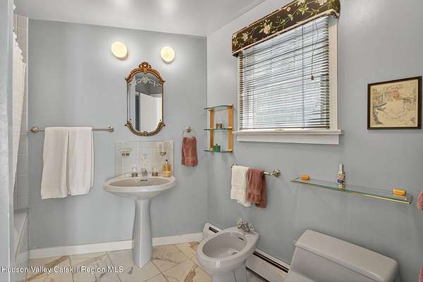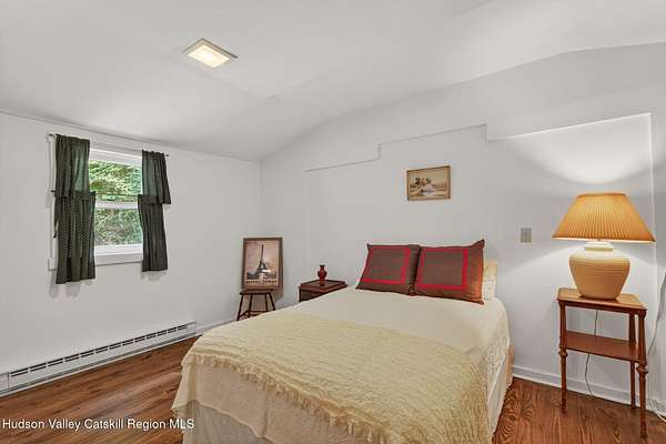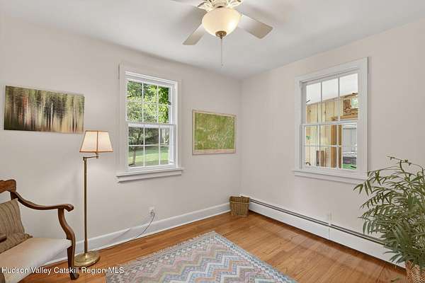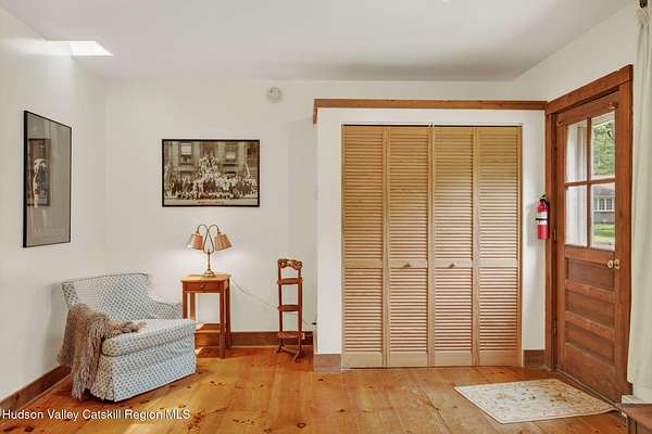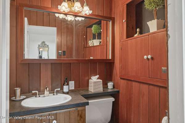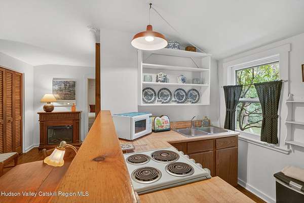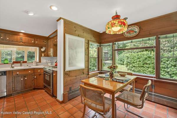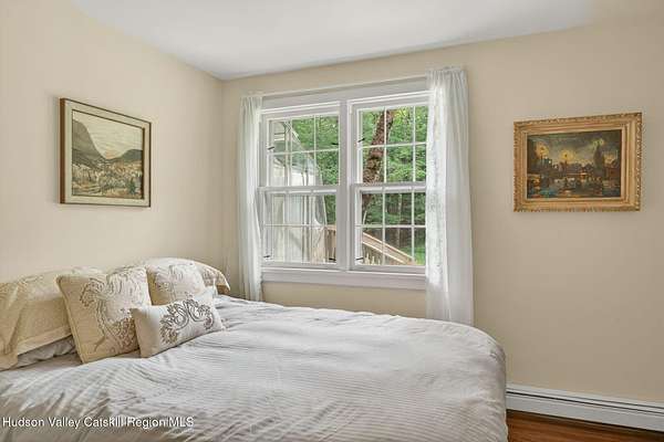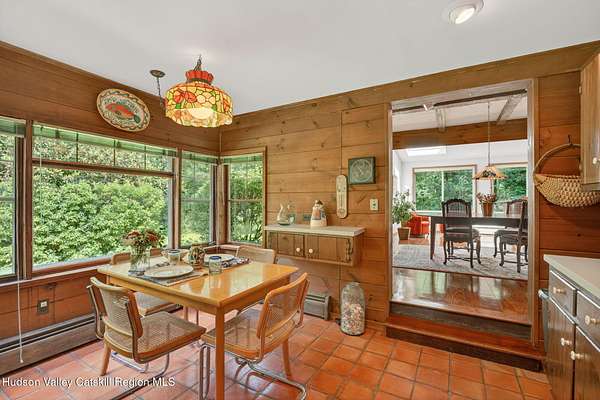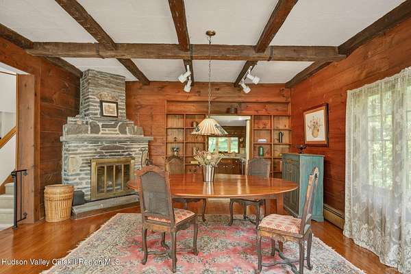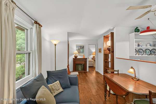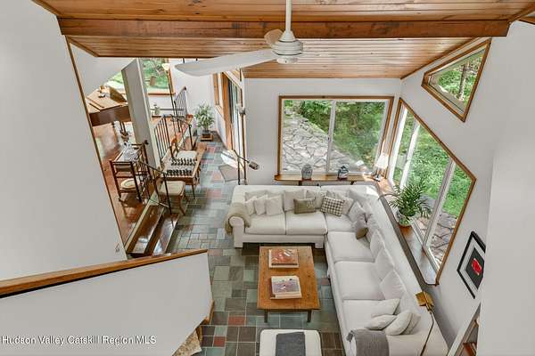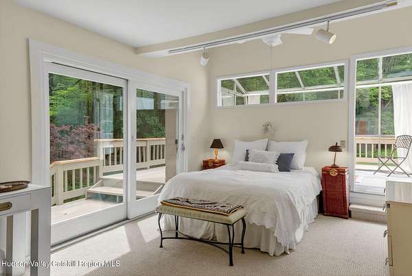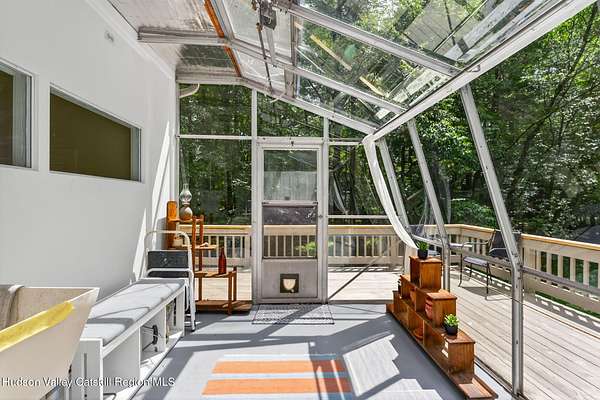 Just a half mile from the center of Woodstock, this bucolic 3.7-acre compound offers a rare blend of architectural charm, natural beauty, and versatile living. The property includes the main house and two outbuildings, a one-bedroom cottage and a studio with an attached three-bay garage. Bedroom and bath layout described as the primary residence having three bedrooms and three full baths measuring 2200 sq. ft. The detached cottage has one bedroom with one full bath measuring 480 sq.ft and the detached studio has another full bath measuring 400 sq ft. The main house is a light-filled classic Woodstock modern home built around the original Woodstock's artist's cabin. Thoughtfully designed to frame the surrounding forest through expansive glass sightlines, allowing for views of deer, birds, and other wildlife throughout the seasons. Inside, the home showcases unique historical details such as chestnut beams in the dining room, a bluestone fireplace, a built-in library, and a mix of slate, Spanish tile, pine, and oak flooring. The multi-level living area features a lofted tongue-and-groove wood ceiling and five architectural skylights that bring the outdoors in. Upon entry, you're greeted by a bright and inviting sunroom that opens into a formal foyer. Just off the foyer is a room that can serve as a home office, reading nook, or playroom, conveniently located next to a full guest bathroom. This level also features a cozy bedroom and a hallway office nook-perfect for remote work or quiet study. The eat-in kitchen includes a charming breakfast nook that offers serene views of the surrounding landscape and seamlessly flows into the dining room, creating a warm and inviting connection between the spaces. The dining area doubles as a music room, enhanced by vintage wide-plank pine flooring and a wood-burning fireplace that adds warmth and character. Step down into the sunken living room, where high ceilings and built-in bookshelves create a bright, welcoming space ideal for relaxing or entertaining. The primary suite features an en-suite bathroom with Parisian influences, including a bidet and a deep, one-person soaking tub with jacuzzi jets. Sliders walk out to the private multi-level deck and your own private atrium. Just off the main area, a newly designed mason-laid bluestone patio features a seamless transition into an expansive deck, offering the perfect setting for quiet evenings or vibrant dinner parties. The second floor features a loft area, ideal as a TV or family room, providing a comfortable space to relax or entertain. Tucked away for privacy, the second primary suite includes a full bath, creating a serene retreat separate from the main living areas. The one-bedroom cottage evokes the feel of an English guesthouse, with wood floors, a full kitchen and bathroom, and its own dedicated utilities, making it a wonderful space for guests or potential rental income. The detached studio, adjoining the three-car garage, feels like a New York City loft, complete with wide-plank floors, an open-concept layout, a bathroom, and a kitchenette. With its own electric and utilities, the space lends itself well to use as an office, yoga or art studio, or another income-producing rental. The garage offers three bays-two for vehicles and one ideal for workshop or storage use. For decades, this special property has been a gathering place for artists, musicians and writers. The home is designed to inspire and connect, all within minutes of Woodstock's vibrant center. It's an exceptional retreat with comfort, character, and potential in every direction. Please see addendum for recent updates and improvements on the home.